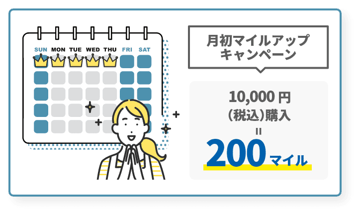 マイルアップ対象商品をご購入いただくと、最大+2マイル積算いたします。また、対象ショップの商品をご購入されると、ボーナスマイルを+2マイル積算いたします。