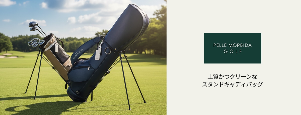 PELLE MORBIDAらしく洗練された上質な雰囲気をデザインに落とし込んだ、スタンドタイプのキャディバッグ。メイン素材にはシャープな型押しを施したPVC素材を使用し、上質な雰囲気はさることながら、軽量かつ手入れもしやすいのが魅力です。すっきりとした仕上がりでユニセックスにお使い頂けます。