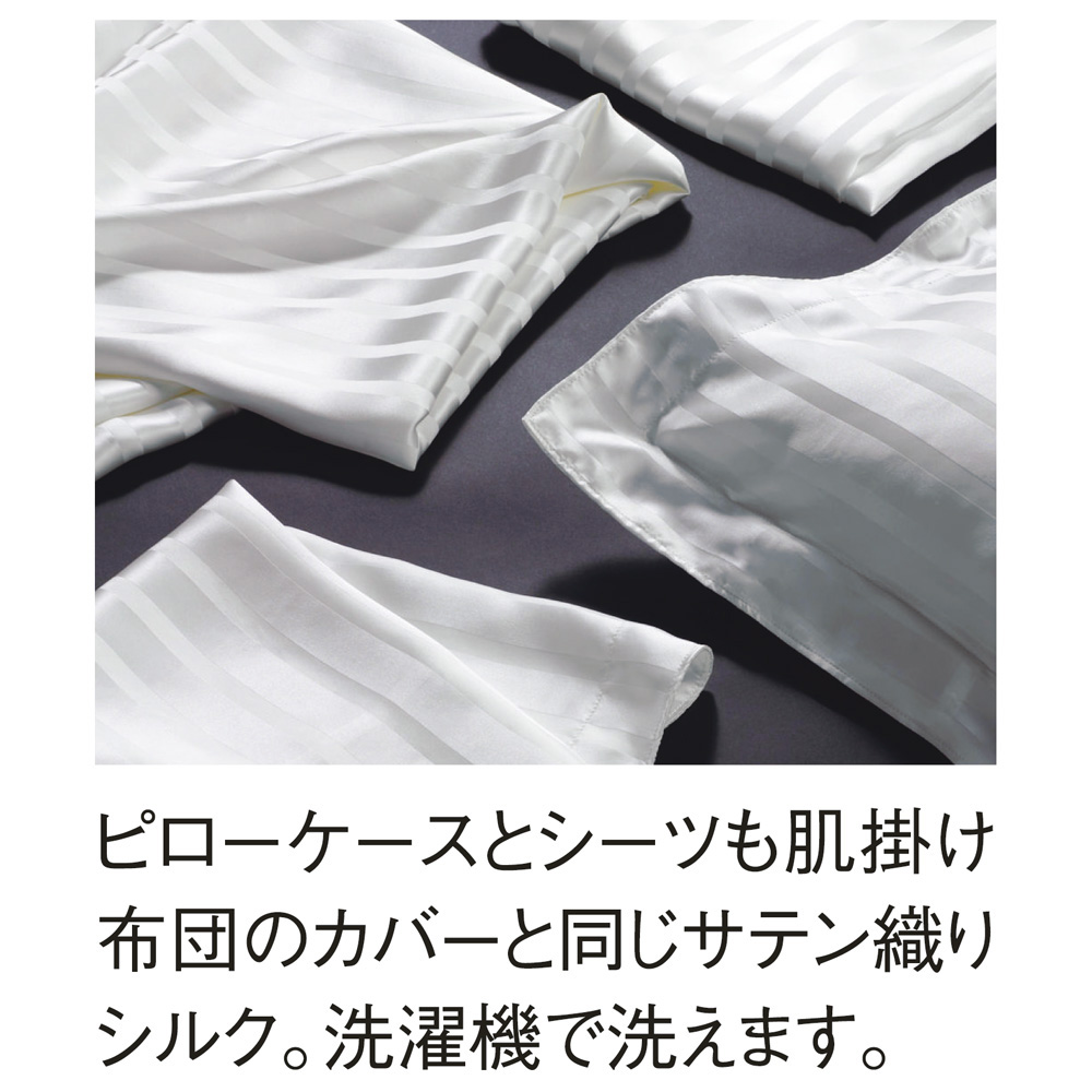 大人の女性を虜にするオールシルクの贅沢。良品良価を追求し、ようやく商品化できた厳選シルクのカバーリングシリーズです。光沢をまとう美しさ、しっとり優しい肌触りが魅力の高級シルク。そのシルクを溢れるほどに使用した贅沢で艶やかなサテン織りストライプ柄のシーツ。品質にこだわり洗濯も可能にしました。シルクは吸放湿性、保温性も優れ、かけ心地はまさにラグジュアリーの一言。【サイズ:シングル・セミダブル・ダブル・クイーン】「良品良価」を追及し、ようやく商品化!贅沢なオールシルクカバー上質なシルクを100%使用した贅沢カバーは、オールシーズンおススメ&お肌にもしっとり。この高品質と嬉しい機能がこの価格で手に入るのはディノスだけ!洗濯OK!美しい光沢のサテン織りシルクカバー美しい光沢のサテン織りのシルクカバーはストライプの柄で上品&ラグジュアリーに。シルクは洗えないものが多い中、こだわって洗濯可能にしました。いつでも清潔を保てます。オールシーズン使える布団内のムレによる不快感を防ぎ、さらさら快適&あったか空間にしてくれます。女性に嬉しい、シルクの恵みたっぷり●天然のアミノ酸たっぷり●乾いた素肌にもしっとり●不快な静電気が少ない●丈夫でホコリが出にくい●吸放湿性がありさらさら