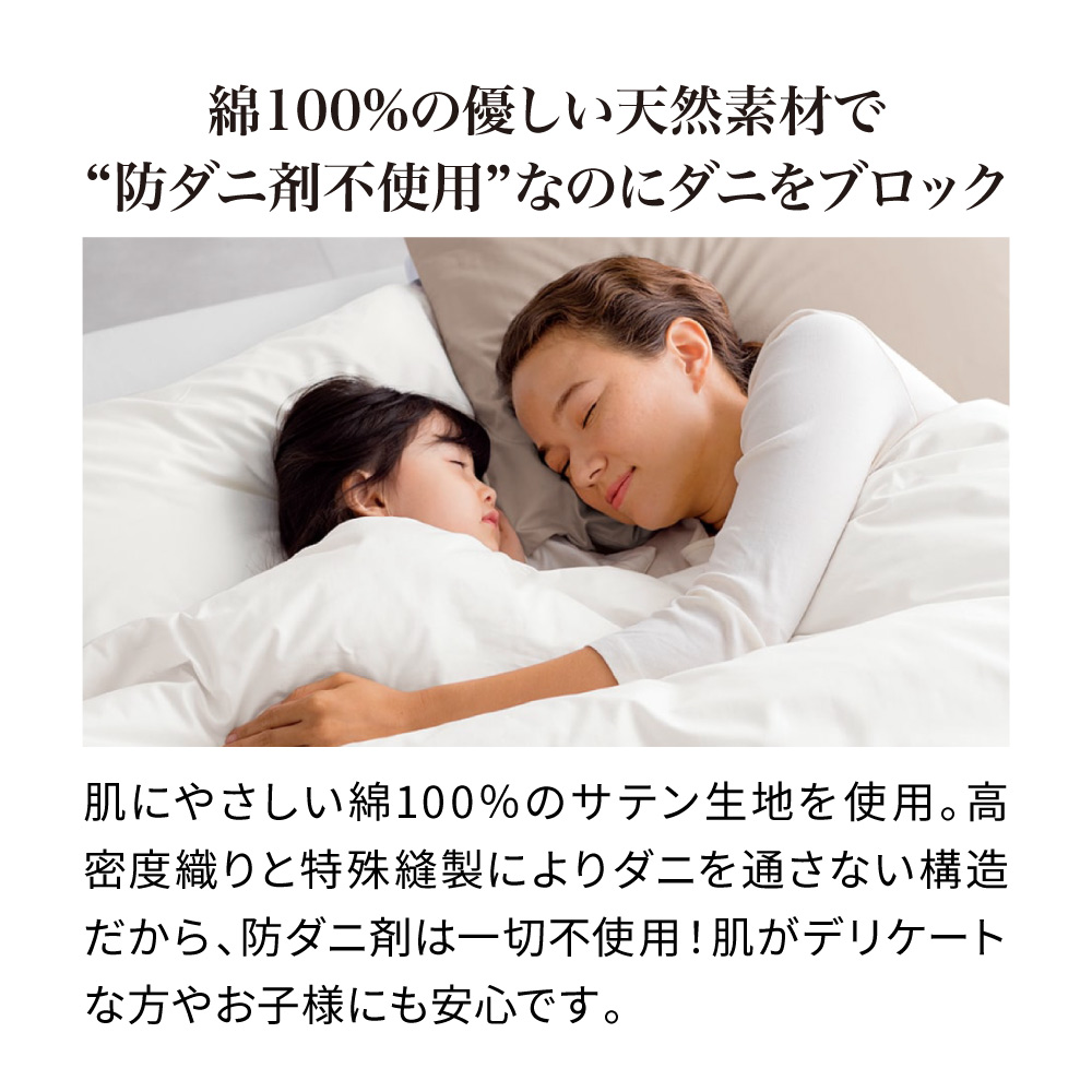 綿100%の天然素材で安心&徹底的にダニ対策をしたい方へ。ロングセラーの“ダニが1匹も入らない”信頼の老舗ブランド『ダニゼロック』シリーズのシーツ&カバー。日本小児アレルギー学会にも出展※した、お子様にも安心して使えるダニゼロックシリーズです。【サイズ:シングルロング・ダブルロング】※「日本小児アレルギー学会」商品展示ブースにて出展天然素材の肌ざわりもダニ対策もあきらめない大切な家族の眠りを守るためのものだからこそ、化繊の寝具や防虫剤を使うことにためらう気持ち、分かります。ダニゼロックは綿100%生地を隙間なく織り上げ、針穴さえもふさぎ、防ダニ剤不使用で物理的にダニを防ぐ寝具。なめらかな風合いとすこやかな眠り、その両方をお届けします。なめらかな綿100%サテン織りの掛け布団カバー見た目も肌ざわりもリッチな高密度サテン織りの掛け布団カバー。お使いの掛け布団をより気持ちよく清潔な使い心地に。綿100%のやさしい天然素材で“防ダニ剤不使用”なのにダニをブロック肌にやさしい綿100%のサテン生地を使用。高密度織りと特殊縫製によりダニを通さない構造だから、防ダニ剤は一切不使用!肌がデリケートな方やお子様にも安心です。綿100%の高密度生地でダニの侵入を阻止隙間なく織り上げられた特殊高密度の側生地でダニを徹底的にシャットアウトします。徹底した縫製処理で針穴を無くし、ダニの侵入を阻止ダニゼロックのすごいところは、針穴さえもないという点。ダニにとって格好の侵入口となる縫い目の針穴をなくすためにテープを重ね、さらにファスナーにはかぶせを付けてしっかりブロック!花柄タイプ3色・無地タイプ3色からインテリアやお好みに合わせてお選びいただけます。左から(ア)花柄ベージュ、(イ)花柄グリーン、(ウ)花柄グレー左から(エ)オフホワイト、(オ)サックスブルー、(カ)グレージュ