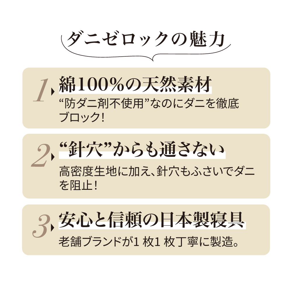 綿100%の天然素材で安心&徹底的にダニ対策をしたい方へ。ロングセラーの“ダニが1匹も入らない”信頼の老舗ブランド『ダニゼロック』シリーズのシーツ&カバー。日本小児アレルギー学会にも出展※した、お子様にも安心して使えるダニゼロックシリーズです。※「日本小児アレルギー学会」商品展示ブースにて出展天然素材の肌ざわりもダニ対策もあきらめない大切な家族の眠りを守るためのものだからこそ、化繊の寝具や防虫剤を使うことにためらう気持ち、分かります。ダニゼロックは綿100%生地を隙間なく織り上げ、針穴さえもふさぎ、防ダニ剤不使用で物理的にダニを防ぐ寝具。なめらかな風合いとすこやかな眠り、その両方をお届けします。なめらかな綿100%サテン織りの敷布団カバー見た目も肌ざわりもリッチな高密度サテン織りの敷布団カバー。お使いの敷布団をより気持ちよく清潔な使い心地に。綿100%のやさしい天然素材で“防ダニ剤不使用”なのにダニをブロック肌にやさしい綿100%のサテン生地を使用。高密度織りと特殊縫製によりダニを通さない構造だから、防ダニ剤は一切不使用!肌がデリケートな方やお子様にも安心です。綿100%の高密度生地でダニの侵入を阻止隙間なく織り上げられた特殊高密度の側生地でダニを徹底的にシャットアウトします。徹底した縫製処理で針穴を無くし、ダニの侵入を阻止ダニゼロックのすごいところは、針穴さえもないという点。ダニにとって格好の侵入口となる縫い目の針穴をなくすためにテープを重ね、さらにファスナーにはかぶせを付けてしっかりブロック!花柄タイプ3色・無地タイプ3色からインテリアやお好みに合わせてお選びいただけます。左から(ア)花柄ベージュ、(イ)花柄グリーン、(ウ)花柄グレー左から(エ)オフホワイト、(オ)サックスブルー、(カ)グレージュ