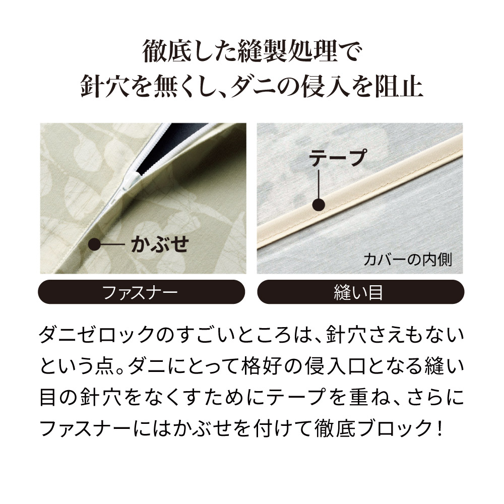 綿100%の天然素材で安心&徹底的にダニ対策をしたい方へ。“ダニが1匹も入らない”信頼の老舗ブランド『ダニゼロック』。天然素材の肌ざわりもダニ対策もあきらめない大切な家族の眠りを守るためのものだからこそ、化繊の寝具や防虫剤を使うことにためらう気持ち、分かります。ダニゼロックは綿100%生地を隙間なく織り上げ、針穴さえもふさぎ、防ダニ剤不使用で物理的にダニを防ぐ寝具。なめらかな風合いとすこやかな眠り、その両方をお届けします。なめらかな綿100%サテン織りの敷布団用カバーセット敷布団カバー・掛け布団カバー・ピローケースのお得なセットです。見た目も肌ざわりもリッチな高密度サテン織り生地で、お使いの寝具をより気持ちよく清潔な使い心地に。綿100%のやさしさ天然素材で“防ダニ剤不使用”なのにダニをブロック肌にやさしい綿100%のサテン生地を使用。高密度織りと特殊縫製によりダニを通さない構造だから、防ダニ剤は一切不使用!肌がデリケートな方やお子様にも安心です。綿100%の高密度生地でダニの侵入を阻止隙間なく織り上げられた特殊高密度の側生地でダニを徹底的にシャットアウトします。徹底した縫製処理で針穴を無くし、ダニの侵入を阻止ダニゼロックのすごいところは、針穴さえもないという点。ダニにとって格好の侵入口となる縫い目の針穴をなくすためにテープを重ね、さらにファスナーにはかぶせを付けてしっかりブロック!花柄タイプ3色・無地タイプ3色からインテリアやお好みに合わせてお選びいただけます。左から(ア)花柄ベージュ、(イ)花柄グリーン、(ウ)花柄グレー左から(エ)オフホワイト、(オ)サックスブルー、(カ)グレージュ