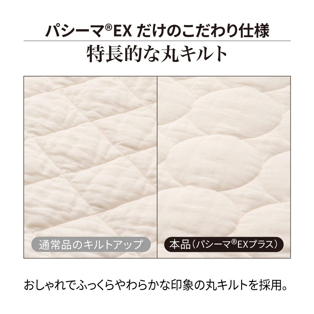 どの季節もすこやかな眠りを支える、ガーゼと脱脂綿だけで作ったパッドシーツ。ふんわりサラリとした肌ざわりで、熱や湿気がこもりがちな背中もムレにくく快適です。(エ)グレー医療用レベルの純度まで精錬されたガーゼと脱脂綿だけを使用。一般的なガーゼより目が詰まっていて耐久性があり、ホコリが出にくいのも特長です。仕上げ剤は一切使用せず、人体への安全性を示す国際規格「エコテックス100」で最も厳しい「クラスI(乳幼児製品)」を取得しています。ガーゼがやわらかく馴染んで手放せなくなる肌ざわりに。洗うことで中の繊維がほぐれ、空気を含んでふんわり軽い掛け心地になり、風合いが育つことで愛着も増します。(ネット・柔軟剤は使わずに洗ってください。)365日気持ちいい夏はムレにくくサラリ、冬はふんわり暖か。お手持ちの寝具と組み合わせてオールシーズン大活躍。パシーマ(R)EXだけのこだわり仕様『特長的な丸キルト』おしゃれでふっくらやわらかな印象の丸キルトを採用。