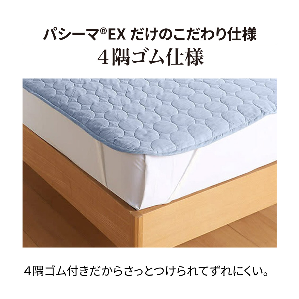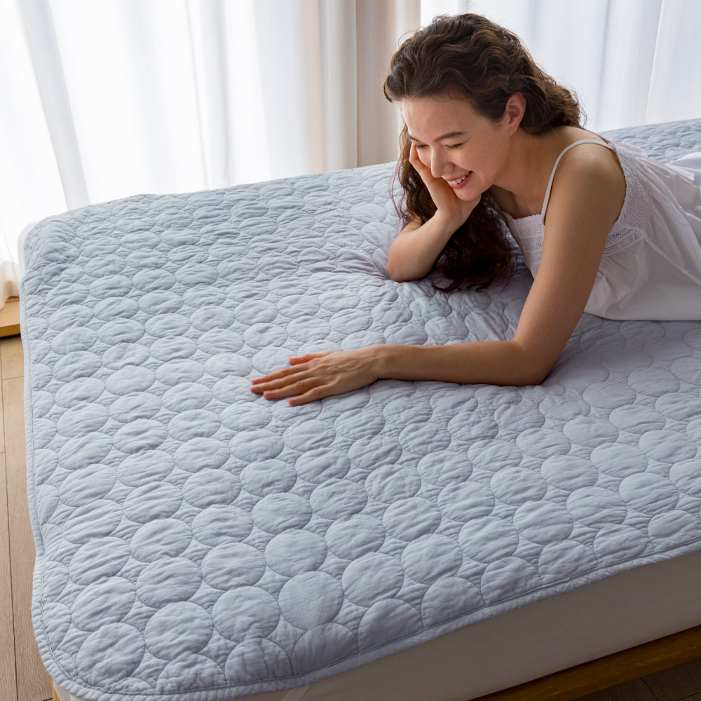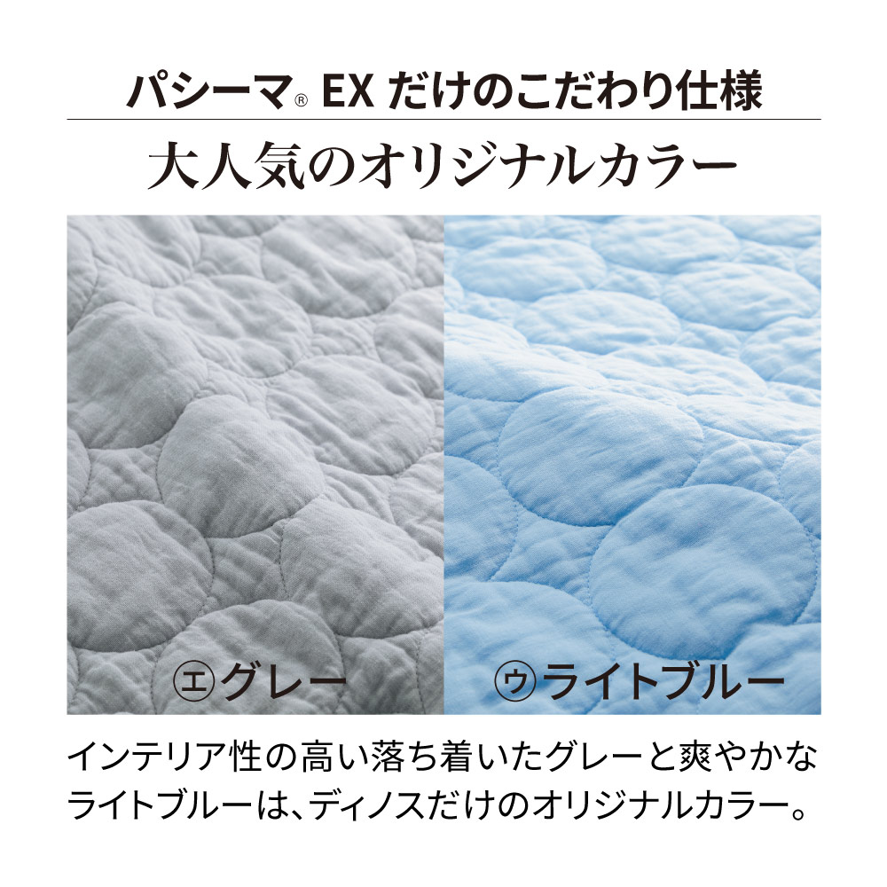 関連商品は下記の商品名をコピーのうえ検索してください。パシーマ(R) 特別3点セット(キルトケット・敷きパッド・大判ハンカチ)≪シングル|約140×205cm≫パシーマ(R)EX 無地 キルトケット≪セミダブル対応(ワイド&ロング)|約160×230cm≫ パシーマ(R)EX 無地 キルトケット≪ダブル|約180×205cm≫ パシーマ(R)EX 無地 キルトケット≪シングルロング|約100×210cm≫ パシーマ(R)EX 無地 敷きパッド※本商品はこちら。≪セミダブルロング|約120×210cm≫ パシーマ(R)EX 無地 敷きパッド≪ダブルロング|約140×210cm≫ パシーマ(R)EX 無地 敷きパッド≪クイーンロング|約160×210cm≫ パシーマ(R)EX 無地 敷きパッドどの季節もすこやかな眠りを支える、ガーゼと脱脂綿だけで作ったパッドシーツ。ふんわりサラリとした肌ざわりで、熱や湿気がこもりがちな背中もムレにくく快適です。(エ)グレー医療用レベルの純度まで精錬されたガーゼと脱脂綿だけを使用。一般的なガーゼより目が詰まっていて耐久性があり、ホコリが出にくいのも特長です。仕上げ剤は一切使用せず、人体への安全性を示す国際規格「エコテックス100」で最も厳しい「クラスI(乳幼児製品)」を取得しています。ガーゼがやわらかく馴染んで手放せなくなる肌ざわりに。洗うことで中の繊維がほぐれ、空気を含んでふんわり軽い掛け心地になり、風合いが育つことで愛着も増します。(ネット・柔軟剤は使わずに洗ってください。)365日気持ちいい夏はムレにくくサラリ、冬はふんわり暖か。お手持ちの寝具と組み合わせてオールシーズン大活躍。パシーマ(R)EXだけのこだわり仕様『特長的な丸キルト』おしゃれでふっくらやわらかな印象の丸キルトを採用。