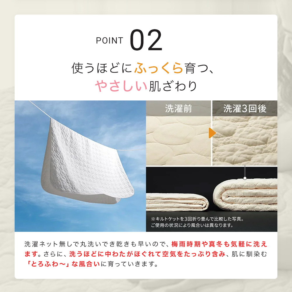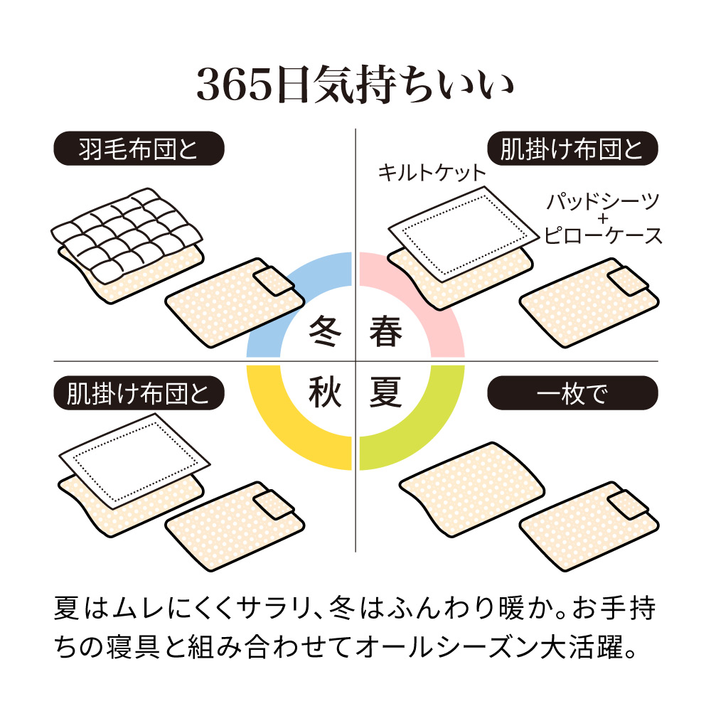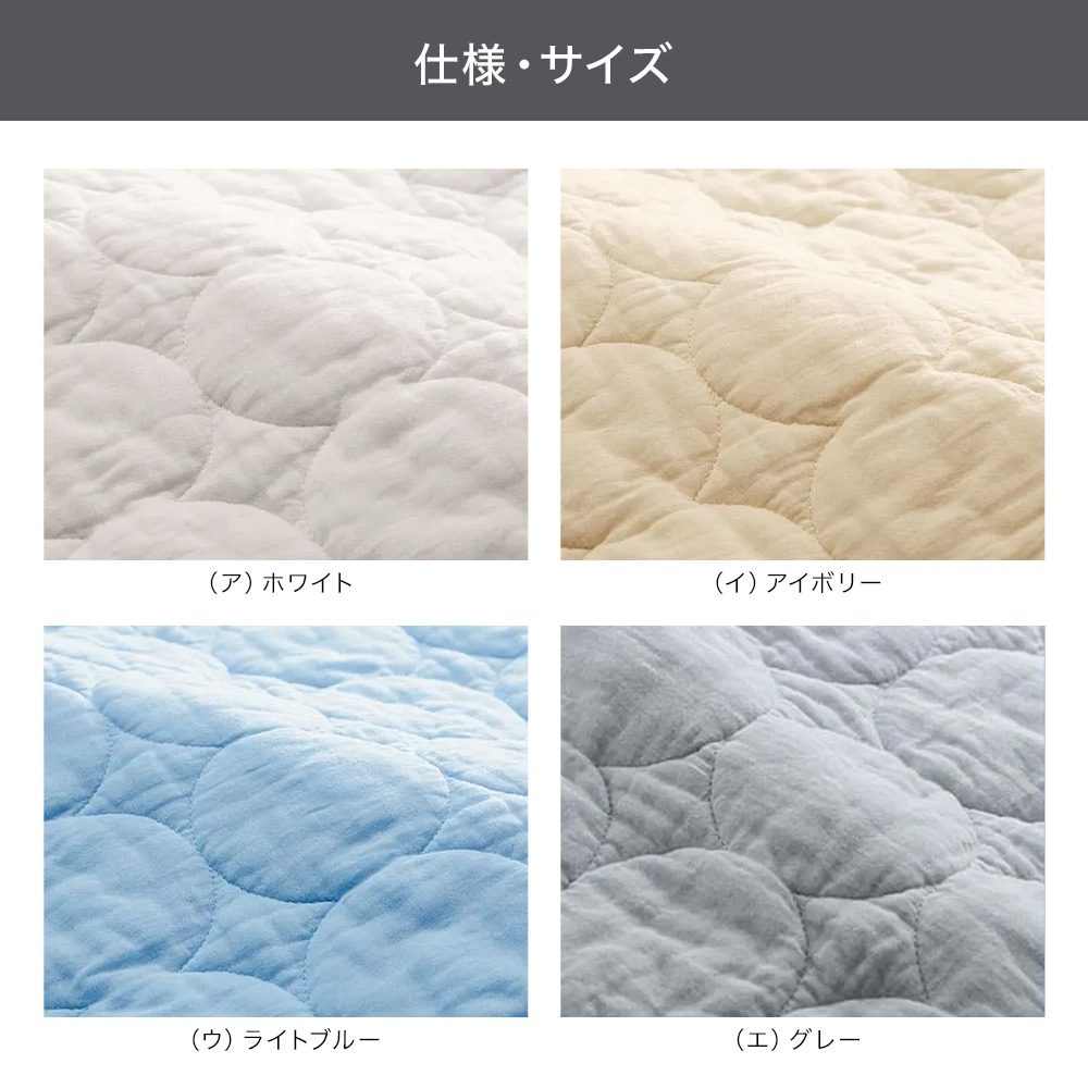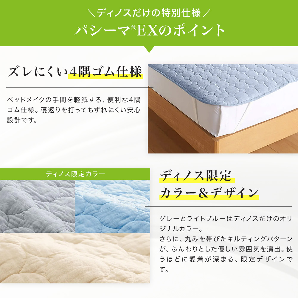 関連商品は下記の商品名をコピーのうえ検索してください。パシーマ(R) 特別3点セット(キルトケット・敷きパッド・大判ハンカチ)≪シングル|約140×205cm≫パシーマ(R)EX 無地 キルトケット≪セミダブル対応(ワイド&ロング)|約160×230cm≫ パシーマ(R)EX 無地 キルトケット≪ダブル|約180×205cm≫ パシーマ(R)EX 無地 キルトケット≪シングルロング|約100×210cm≫ パシーマ(R)EX 無地 敷きパッド※本商品はこちら。≪セミダブルロング|約120×210cm≫ パシーマ(R)EX 無地 敷きパッド≪ダブルロング|約140×210cm≫ パシーマ(R)EX 無地 敷きパッド≪クイーンロング|約160×210cm≫ パシーマ(R)EX 無地 敷きパッドどの季節もすこやかな眠りを支える、ガーゼと脱脂綿だけで作ったパッドシーツ。ふんわりサラリとした肌ざわりで、熱や湿気がこもりがちな背中もムレにくく快適です。(エ)グレー医療用レベルの純度まで精錬されたガーゼと脱脂綿だけを使用。一般的なガーゼより目が詰まっていて耐久性があり、ホコリが出にくいのも特長です。仕上げ剤は一切使用せず、人体への安全性を示す国際規格「エコテックス100」で最も厳しい「クラスI(乳幼児製品)」を取得しています。ガーゼがやわらかく馴染んで手放せなくなる肌ざわりに。洗うことで中の繊維がほぐれ、空気を含んでふんわり軽い掛け心地になり、風合いが育つことで愛着も増します。(ネット・柔軟剤は使わずに洗ってください。)365日気持ちいい夏はムレにくくサラリ、冬はふんわり暖か。お手持ちの寝具と組み合わせてオールシーズン大活躍。パシーマ(R)EXだけのこだわり仕様『特長的な丸キルト』おしゃれでふっくらやわらかな印象の丸キルトを採用。