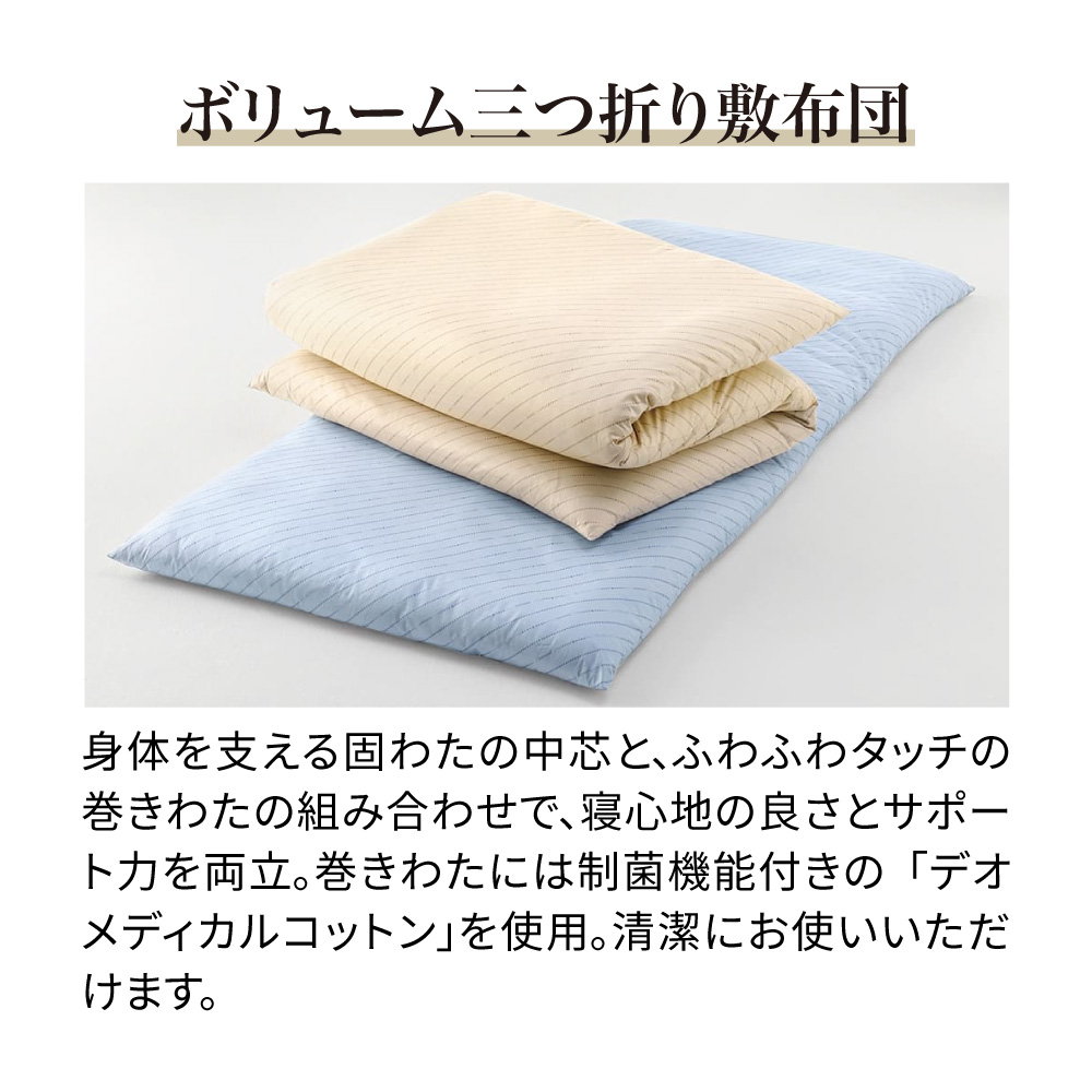 ダニゼロックは、天然素材で安心かつ徹底的にダニ対策をしたい方に迷わずにオススメしたい寝具です。ベージュはディノスだけの限定カラー♪ロングセラーの“ダニが1匹も入らない”信頼の老舗ブランド『ダニゼロック』シリーズの敷き布団はしっとりとした寝心地。手間を惜しまず、妥協せず、ダニ阻止率と寝心地のどちらにもこだわった特別な寝具です。ダニの温床とされる布団こそ「ダニゼロ」で心身への安心を。徹底的なダニ対策と気持ちのよい寝心地のどちらもあきらめたくない方へ。綿100%の側生地で布団内部へのダニの侵入を徹底的に阻止する。それがダニゼロックのお布団。防ダニ剤不使用の安心感とコットンのやさしい肌ざわりが、大切な家族のすこやかな眠りを支えます。ボリューム三つ折り敷布団身体を支える固わたの中芯と、ふわふわタッチの巻きわたの組み合わせで、寝心地の良さとサポート力を両立。巻きわたには制菌機能付きの「デオメディカルコットン」を使用。清潔にお使いいただけます。高い制菌機能を持つデオメディカルコットン中わたに配合したデオメディカルコットンは、天然素材の綿に安全性の高い青色の銅が結合することで優れた制菌機能を発揮します。徹底した縫製処理で針穴を無くし、ダニの侵入を阻止ダニにとって格好の侵入口となるキルトの針穴を、布団表面からすべてなくした特殊な二重構造。だから布団の中はダニがゼロ!綿100%の高密度生地でダニの侵入を阻止隙間なく織り上げられた特殊高密度の側生地でダニを徹底的にシャットアウトします。試験でも布団内部からはダニが1匹も見つかりませんでしたダニゼロックの布団内部にはダニがゼロ!物理的にダニをブロックする構造なので、穴が開かない限りどんなに使っても防ダニ効果がなくなることはありません。熟練職人の手作業を交え、国内で丁寧に生産される清潔な寝具高品質なダニ対策寝具を作り続けて25年以上の老舗メーカーが、国内で1枚1枚丁寧に生産しています。縫い方ひとつにまでこだわった特殊製法のため、機械化できない工程は専門工場にて職人が手作業で行なっています。完成した製品には約80℃の特殊高温処理を施します。布団内部からダニが検出されないことはもちろん、清潔な寝具に仕上がります。