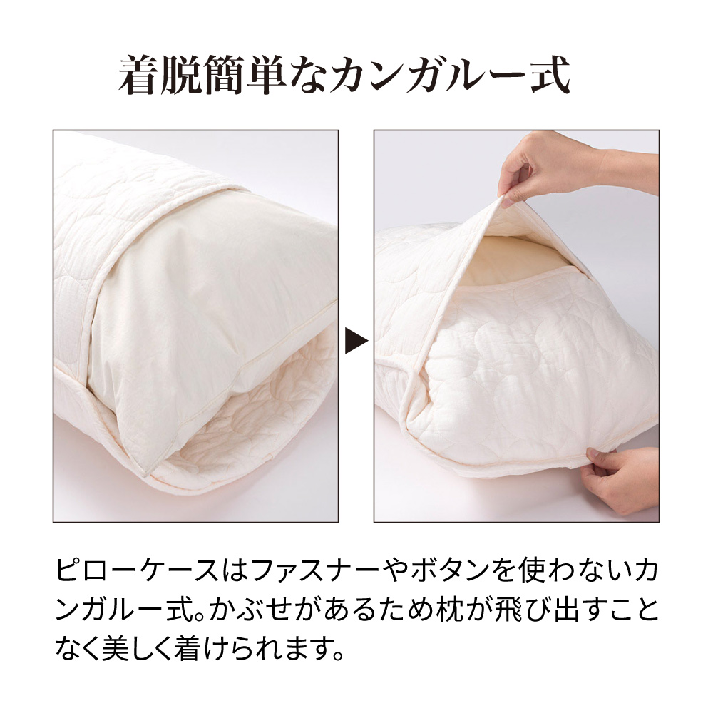 どの季節もすこやかな眠りを支える、ガーゼと脱脂綿だけで作ったピローケース。赤ちゃんにも使えるパシーマ(R)で、お使いの枕をふんわりサラリとしたやさしい使い心地に。(エ)グレー医療用レベルの純度まで精錬されたガーゼと脱脂綿だけを使用。一般的なガーゼより目が詰まっていて耐久性があり、ホコリが出にくいのも特長です。仕上げ剤は一切使用せず、人体への安全性を示す国際規格「エコテックス100」で最も厳しい「クラスI(乳幼児製品)」を取得しています。ガーゼがやわらかく馴染んで手放せなくなる肌ざわりに。洗うことで中の繊維がほぐれ、空気を含んでふんわり軽い掛け心地になり、風合いが育つことで愛着も増します。(ネット・柔軟剤は使わずに洗ってください。)365日気持ちいい夏はムレにくくサラリ、冬はふんわり暖か。お手持ちの寝具と組み合わせてオールシーズン大活躍。パシーマ(R)EXだけのこだわり仕様丈夫なヘム巻き仕様で見た目も美しく高級感があり、耐久性も◎。特徴的なキルトはおしゃれでふっくらやわらかな印象の丸キルトを採用。