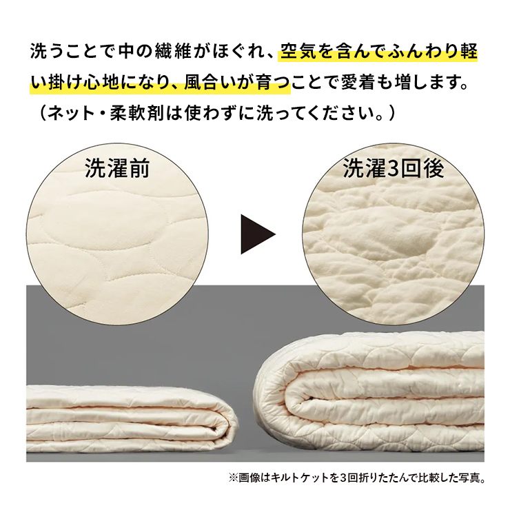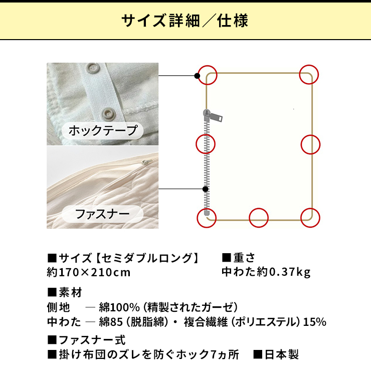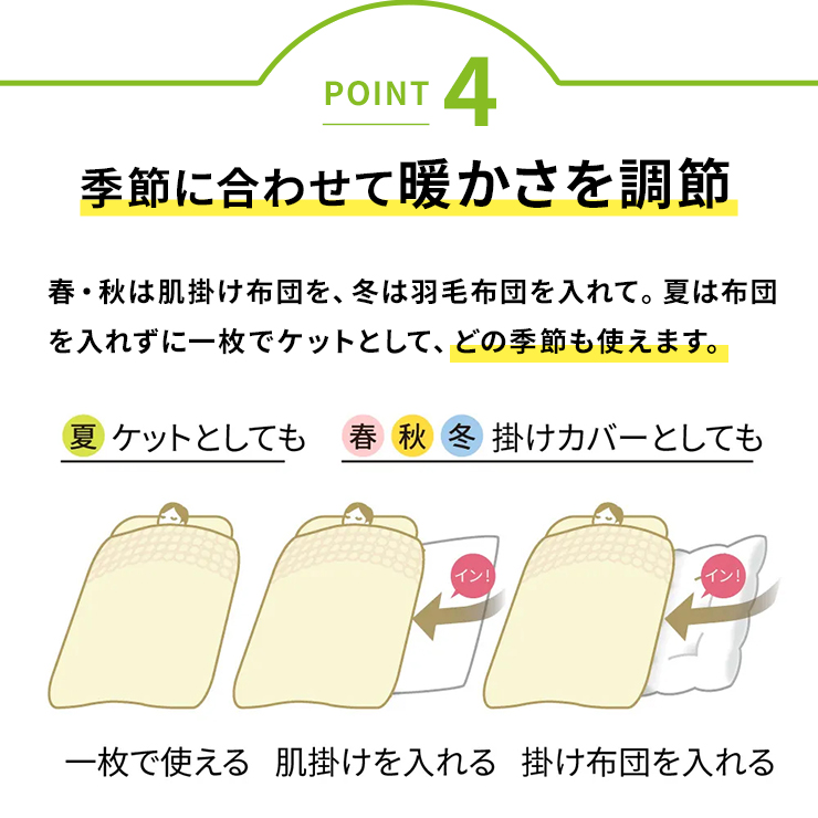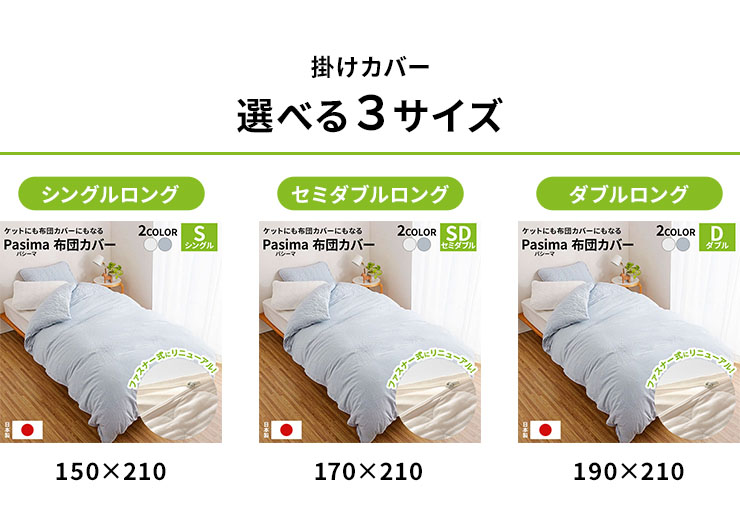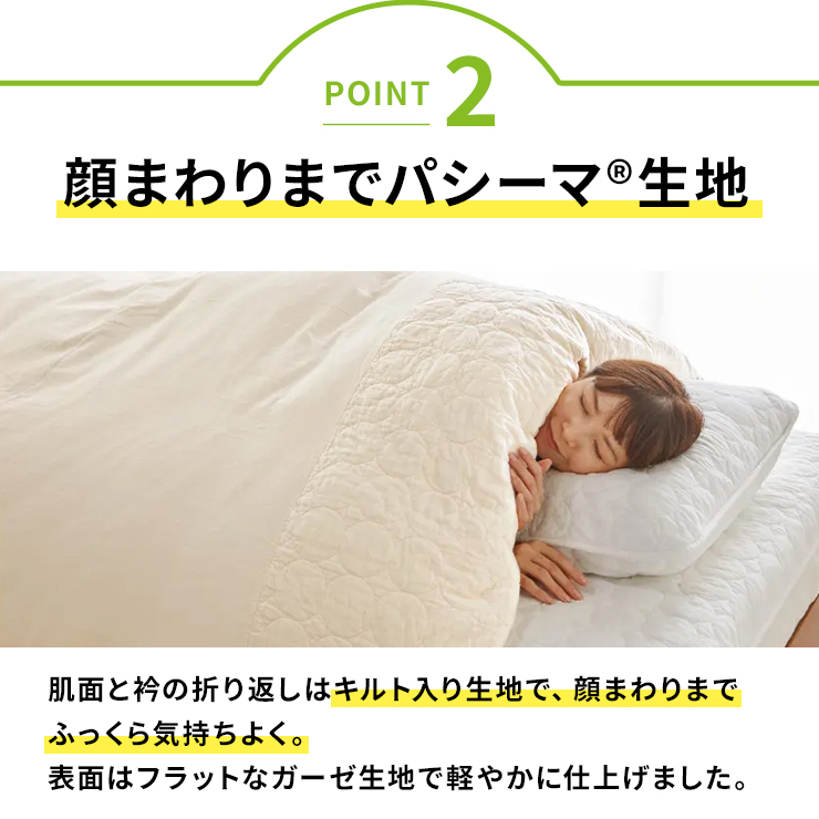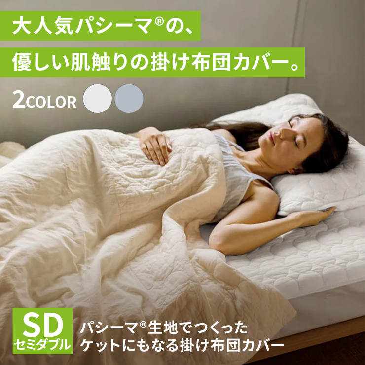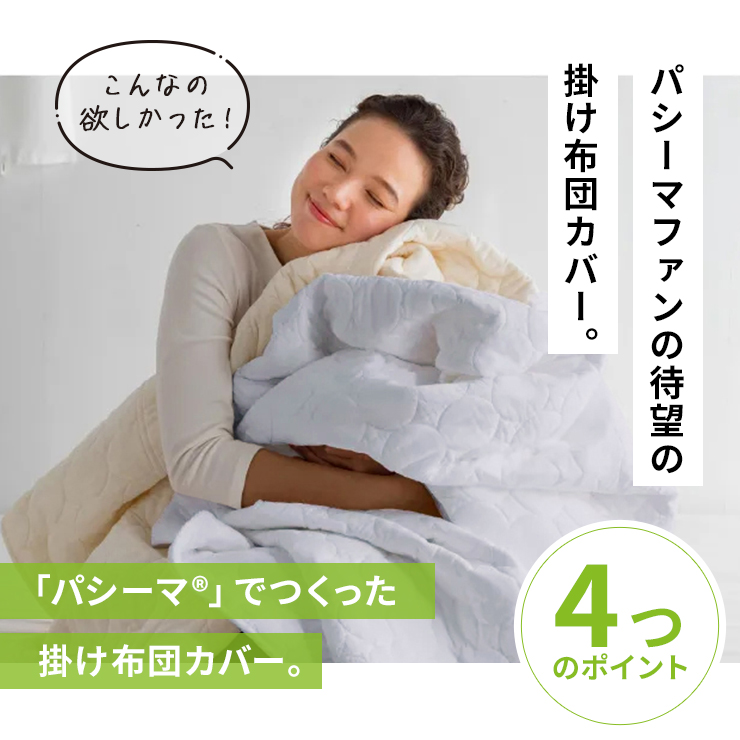 「こんなの欲しかった!」パシーマファン待望の掛け布団カバー。お手持ちの布団が、パシーマならではの「ふっくらサラサラ、もっちり幸せ」な肌触りに大変身。洗うほどに増すとろとろ感も魅力です。さらに夏はケットとしても使え、一年中活躍する優れもの!パシーマ愛用者も、ガーゼ好きの方も、この包まれ感をぜひ体感してください。パシーマのぬくもりを、もっと身近に―そんな想いから生まれた掛け布団カバーです。肌に触れる面はパシーマ生地、表面はガーゼ生地を組み合わせ、パシーマの心地よい肌ざわりと布団のもっちり感を両立。夏は一枚でケットとして、冬は掛け布団カバーとして活躍するので一年中出しっぱなしにできます。洗うほど「育つ」風合いもパシーマらしい魅力。日々の暮らしの中で、そっと心をほぐしてくれる一枚です。季節に合わせて1年中使える多機能寝具夏は1枚でケットに、春や秋は肌掛け布団カバーに、冬は掛け布団カバーとして活躍。これ一枚で、どの季節もパシーマのやさしい肌触りで包みます。季節ごとの寝具が不要になり、収納スペースも大幅に削減。「これがいい」と思う心地よさと、すっきりした暮らしを叶えます。お客さまの声から、快適リニューアル!布団を出し入れする開口部は、スナップボタン式からファスナーへ変更し、布団の出し入れがさらにスムーズになりました。顔まわりまでパシーマ生地に包みこまれる贅沢頬や首筋に触れる襟元の折り返しには、やさしいぬくもりのパシーマキルト生地を使用。表面は布団のボリュームをつぶさないガーゼ生地を使用し、やわらかさと“もっちり幸せ”な心地よさを両立しました。医療用レベルの純度まで精錬したガーゼと脱脂綿パシーマ生地は医療用レベルの純度まで精錬されたガーゼと脱脂綿だけを使用。一般的なガーゼより目が詰まっていて耐久性があり、ホコリが出にくいのも特長です。国際安全基準「エコテックス100」のクラスIを取得パシーマ生地は「エコテックス100」の最も厳しい「クラスI(乳幼児製品)」を取得しています。一切の仕上げ剤を使わない無添加素材で、肌が敏感な方、小さなお子様やご年配の方まで、安心して使える寝具であることにこだわりました。洗うほどにふっくら育つ。パシーマ生地は、最初は少しかために感じるかもしれませんが、洗うたびに繊維がほぐれ、「ふっくら、とろり」とした独特のやさしさが生まれます。洗濯ネットや柔軟剤を使わずに洗うことで、パシーマ本来のやわらかな風合いが少しずつ育ちます。使い込むほど愛着が湧く、―そんな不思議な魅力を持つ寝具です。寝汗・エアコン乾燥の対策にも「寝汗をかきやすくて困る」―そんなお悩みを抱える方にも、パシーマの吸放湿性がおすすめです。独自の構造で汗や湿気を素早く吸収・放出し、一晩中さらりとした睡眠環境を守ります。夏はベタつきを防ぎ、冬はムレずにふんわりあたたか。季節を問わず、朝まで「ちょうどいい」心地よさで包みます。私たちディノスは20年以上、パシーマ正規販売店としてお客様の声に耳を傾けてきました。「もっとパシーマを贅沢に使いたい」「一年中快適に眠りたい」―そんなご要望から生まれた本品は、何度も試作を重ね、「眠り」という品質にこだわった一枚に仕上がりました。夏の寝苦しい夜も、冬の冷え込む朝も、いつでもパシーマのやさしい肌触りに包まれる安心感をお届けします。寝具選びに悩まれている方、収納スペースをすっきりさせたい方、そしてパシーマファンの方にも、自信をもっておすすめできる一枚です。