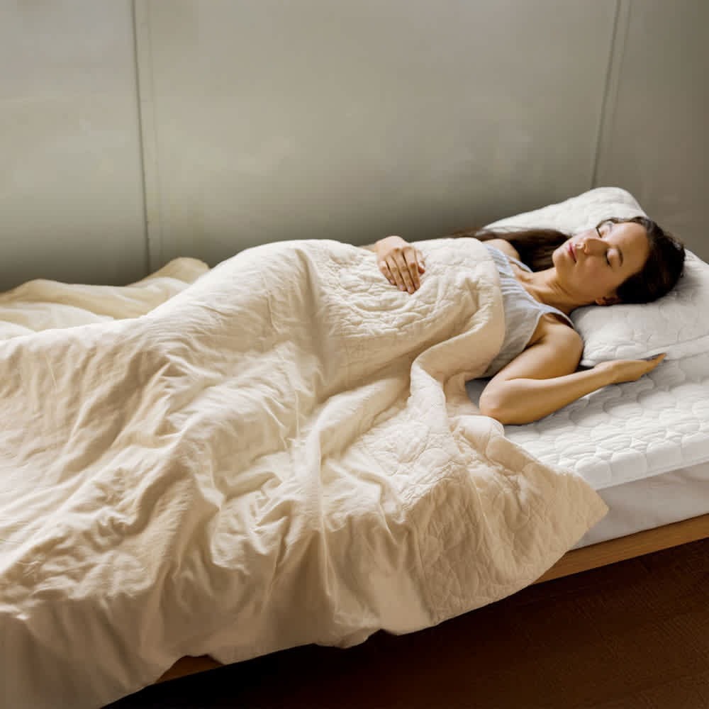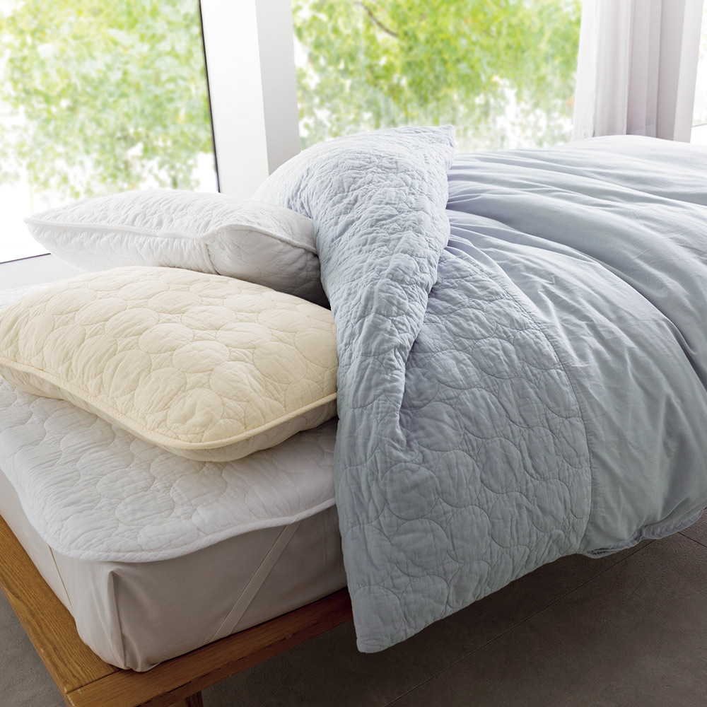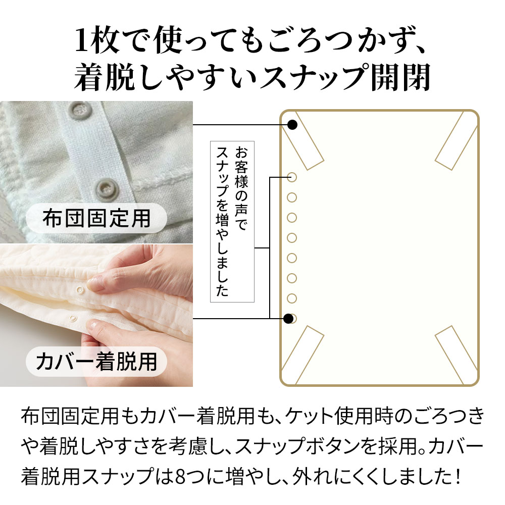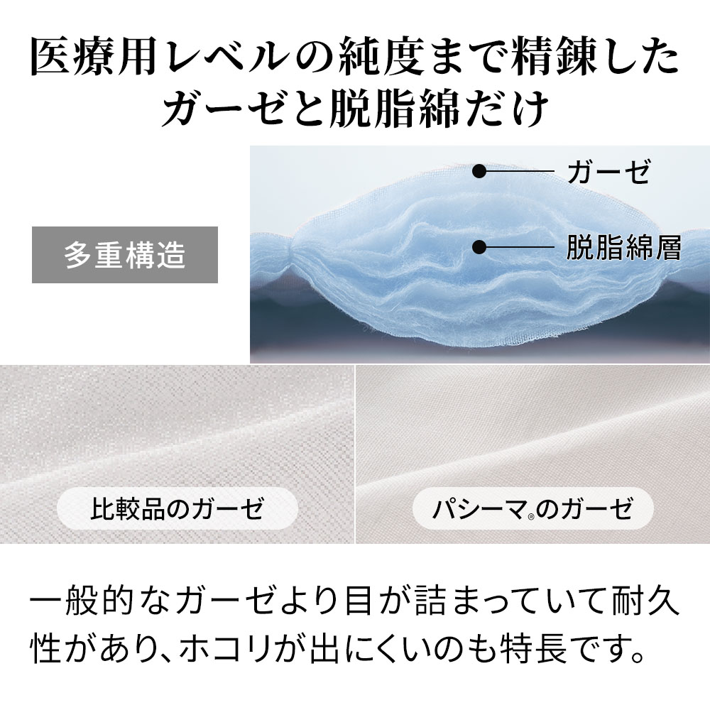 「こんなの欲しかった!」パシーマファン待望の掛け布団カバー。お手持ちの布団が、パシーマならではの「ふっくらサラサラ、もっちり幸せ」な肌触りに大変身。洗うほどに増すとろとろ感も魅力です。さらに夏はケットとしても使え、一年中活躍する優れもの!パシーマ愛用者も、ガーゼ好きの方も、この包まれ感をぜひ体感してください。パシーマのぬくもりを、もっと身近に―そんな想いから生まれた掛け布団カバーです。肌に触れる面はパシーマ生地、表面はガーゼ生地を組み合わせ、パシーマの心地よい肌ざわりと布団のもっちり感を両立。夏は一枚でケットとして、冬は掛け布団カバーとして活躍するので一年中出しっぱなしにできます。洗うほど「育つ」風合いもパシーマらしい魅力。日々の暮らしの中で、そっと心をほぐしてくれる一枚です。季節に合わせて1年中使える多機能寝具夏は1枚でケットに、春や秋は肌掛け布団カバーに、冬は掛け布団カバーとして活躍。これ一枚で、どの季節もパシーマのやさしい肌触りで包みます。季節ごとの寝具が不要になり、収納スペースも大幅に削減。「これがいい」と思う心地よさと、すっきりした暮らしを叶えます。使い勝手のよいサイドスナップボタン着脱しやすいサイドスナップボタン式。布団を入れずにケットとして使う際も肌に当たりにくく、ストレスフリーな使い心地です。顔まわりまでパシーマ生地に包みこまれる贅沢頬や首筋に触れる襟元の折り返しには、やさしいぬくもりのパシーマキルト生地を使用。表面は布団のボリュームをつぶさないガーゼ生地を使用し、やわらかさと“もっちり幸せ”な心地よさを両立しました。医療用レベルの純度まで精錬したガーゼと脱脂綿パシーマ生地は医療用レベルの純度まで精錬されたガーゼと脱脂綿だけを使用。一般的なガーゼより目が詰まっていて耐久性があり、ホコリが出にくいのも特長です。国際安全基準「エコテックス100」のクラスIを取得パシーマ生地は「エコテックス100」の最も厳しい「クラスI(乳幼児製品)」を取得しています。一切の仕上げ剤を使わない無添加素材で、肌が敏感な方、小さなお子様やご年配の方まで、安心して使える寝具であることにこだわりました。洗うほどにふっくら育つ。パシーマ生地は、最初は少しかために感じるかもしれませんが、洗うたびに繊維がほぐれ、「ふっくら、とろり」とした独特のやさしさが生まれます。洗濯ネットや柔軟剤を使わずに洗うことで、パシーマ本来のやわらかな風合いが少しずつ育ちます。使い込むほど愛着が湧く、―そんな不思議な魅力を持つ寝具です。寝汗・エアコン乾燥の対策にも「寝汗をかきやすくて困る」―そんなお悩みを抱える方にも、パシーマの吸放湿性がおすすめです。独自の構造で汗や湿気を素早く吸収・放出し、一晩中さらりとした睡眠環境を守ります。夏はベタつきを防ぎ、冬はムレずにふんわりあたたか。季節を問わず、朝まで「ちょうどいい」心地よさで包みます。私たちディノスは20年以上、パシーマ正規販売店としてお客様の声に耳を傾けてきました。「もっとパシーマを贅沢に使いたい」「一年中快適に眠りたい」―そんなご要望から生まれた本品は、何度も試作を重ね、「眠り」という品質にこだわった一枚に仕上がりました。夏の寝苦しい夜も、冬の冷え込む朝も、いつでもパシーマのやさしい肌触りに包まれる安心感をお届けします。寝具選びに悩まれている方、収納スペースをすっきりさせたい方、そしてパシーマファンの方にも、自信をもっておすすめできる一枚です。
