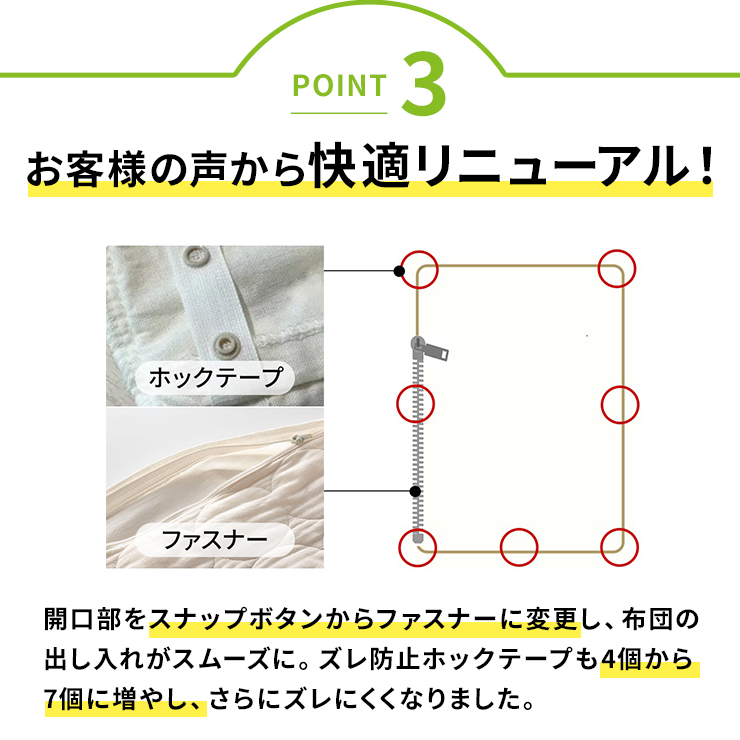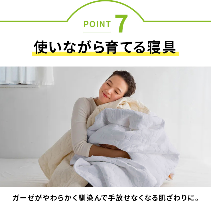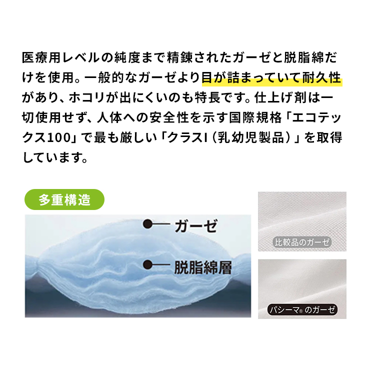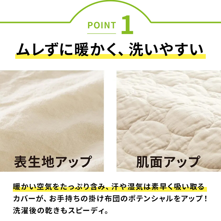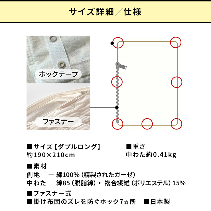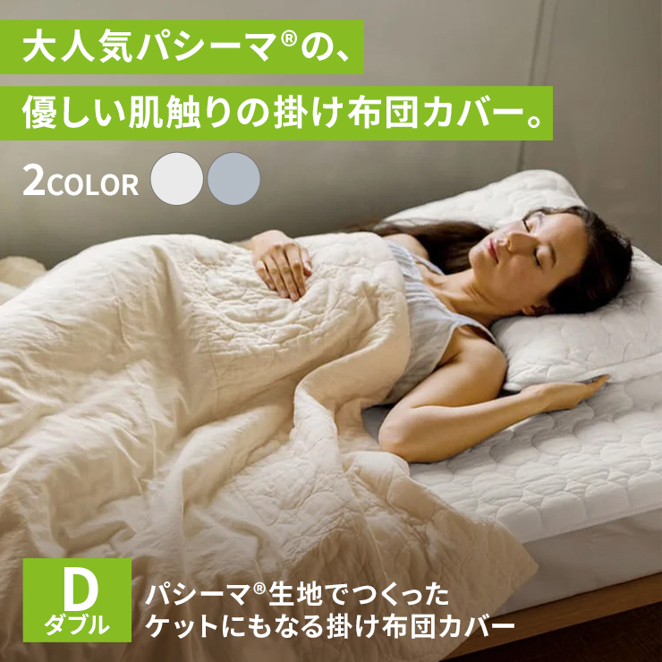 「こんなの欲しかった!」パシーマファン待望の掛け布団カバー。お手持ちの布団が、パシーマならではの「ふっくらサラサラ、もっちり幸せ」な肌触りに大変身。洗うほどに増すとろとろ感も魅力です。さらに夏はケットとしても使え、一年中活躍する優れもの!パシーマ愛用者も、ガーゼ好きの方も、この包まれ感をぜひ体感してください。パシーマのぬくもりを、もっと身近に―そんな想いから生まれた掛け布団カバーです。肌に触れる面はパシーマ生地、表面はガーゼ生地を組み合わせ、パシーマの心地よい肌ざわりと布団のもっちり感を両立。夏は一枚でケットとして、冬は掛け布団カバーとして活躍するので一年中出しっぱなしにできます。洗うほど「育つ」風合いもパシーマらしい魅力。日々の暮らしの中で、そっと心をほぐしてくれる一枚です。季節に合わせて1年中使える多機能寝具夏は1枚でケットに、春や秋は肌掛け布団カバーに、冬は掛け布団カバーとして活躍。これ一枚で、どの季節もパシーマのやさしい肌触りで包みます。季節ごとの寝具が不要になり、収納スペースも大幅に削減。「これがいい」と思う心地よさと、すっきりした暮らしを叶えます。お客さまの声から、快適リニューアル!布団を出し入れする開口部は、スナップボタン式からファスナーへ変更し、布団の出し入れがさらにスムーズになりました。顔まわりまでパシーマ生地に包みこまれる贅沢頬や首筋に触れる襟元の折り返しには、やさしいぬくもりのパシーマキルト生地を使用。表面は布団のボリュームをつぶさないガーゼ生地を使用し、やわらかさと“もっちり幸せ”な心地よさを両立しました。医療用レベルの純度まで精錬したガーゼと脱脂綿パシーマ生地は医療用レベルの純度まで精錬されたガーゼと脱脂綿だけを使用。一般的なガーゼより目が詰まっていて耐久性があり、ホコリが出にくいのも特長です。国際安全基準「エコテックス100」のクラスIを取得パシーマ生地は「エコテックス100」の最も厳しい「クラスI(乳幼児製品)」を取得しています。一切の仕上げ剤を使わない無添加素材で、肌が敏感な方、小さなお子様やご年配の方まで、安心して使える寝具であることにこだわりました。洗うほどにふっくら育つ。パシーマ生地は、最初は少しかために感じるかもしれませんが、洗うたびに繊維がほぐれ、「ふっくら、とろり」とした独特のやさしさが生まれます。洗濯ネットや柔軟剤を使わずに洗うことで、パシーマ本来のやわらかな風合いが少しずつ育ちます。使い込むほど愛着が湧く、―そんな不思議な魅力を持つ寝具です。寝汗・エアコン乾燥の対策にも「寝汗をかきやすくて困る」―そんなお悩みを抱える方にも、パシーマの吸放湿性がおすすめです。独自の構造で汗や湿気を素早く吸収・放出し、一晩中さらりとした睡眠環境を守ります。夏はベタつきを防ぎ、冬はムレずにふんわりあたたか。季節を問わず、朝まで「ちょうどいい」心地よさで包みます。私たちディノスは20年以上、パシーマ正規販売店としてお客様の声に耳を傾けてきました。「もっとパシーマを贅沢に使いたい」「一年中快適に眠りたい」―そんなご要望から生まれた本品は、何度も試作を重ね、「眠り」という品質にこだわった一枚に仕上がりました。夏の寝苦しい夜も、冬の冷え込む朝も、いつでもパシーマのやさしい肌触りに包まれる安心感をお届けします。寝具選びに悩まれている方、収納スペースをすっきりさせたい方、そしてパシーマファンの方にも、自信をもっておすすめできる一枚です。