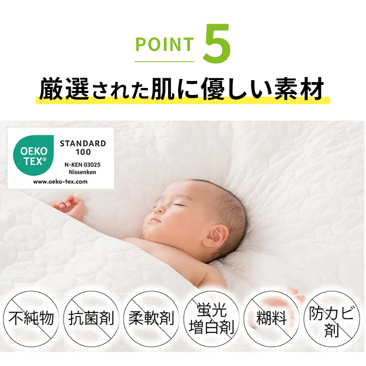 医療用レベルの純度まで精錬されたガーゼと脱脂綿だけを使用。一般的なガーゼより目が詰まっていて耐久性があり、ホコリが出にくいのも特長です。仕上げ剤は一切使用せず、人体への安全性を示す国際規格「エコテックス100」で最も厳しい「クラスI(乳幼児製品)」を取得しています。
