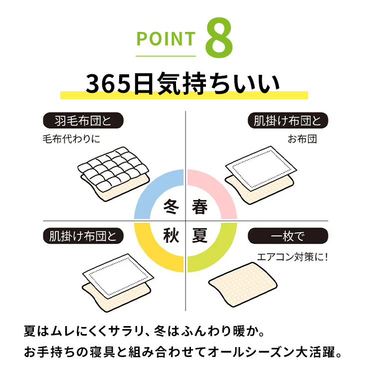 365日気持ちいい夏はムレにくくサラリ、冬はふんわり暖か。お手持ちの寝具と組み合わせてオールシーズン大活躍。