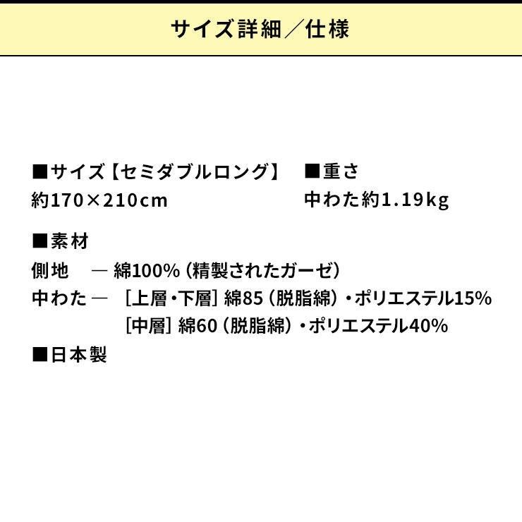 【セミダブルロング】170×210cm・中わた約1.19kg