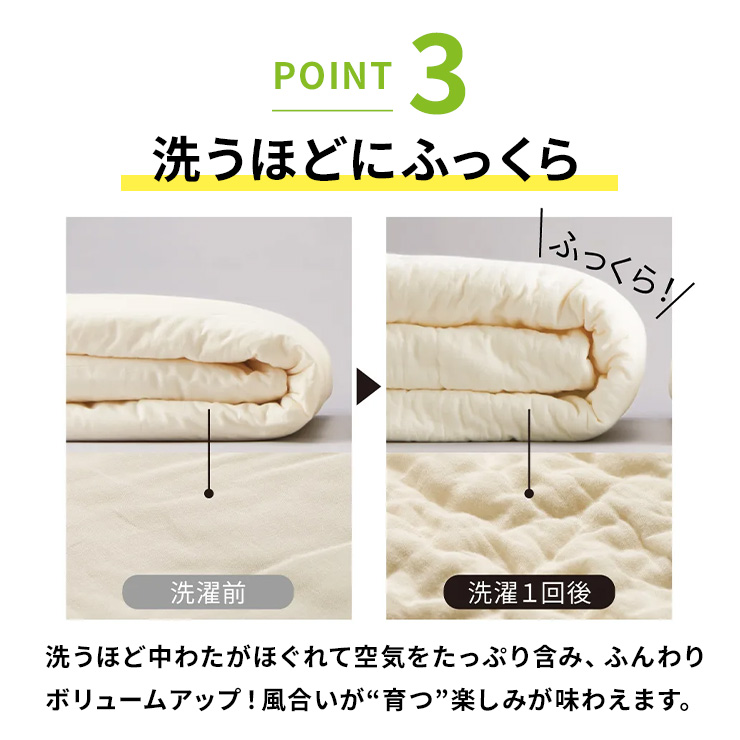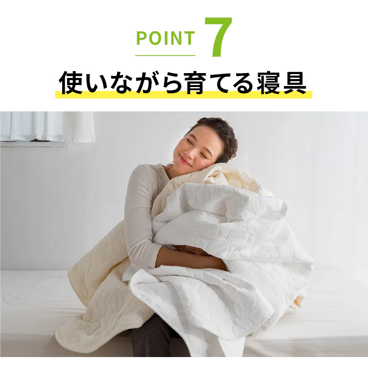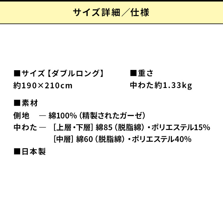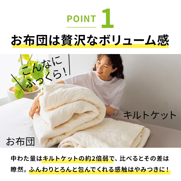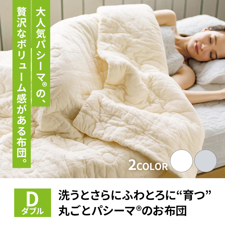 洗うとさらにふわとろに“育つ”丸ごとパシーマ(R)のお布団は、季節の変わり目にも大活躍。(ア)アイボリー中わた量はキルトケットの約2倍弱で、比べるとその差は瞭然。ふんわりとろんと包んでくれる感触はやみつきに!幾層にも重ねた脱脂綿の中わたを、綿100%の高密度ガーゼで挟んだ多重構造。汗や湿気を素早く吸い取るからサラサラが長続き。夏は爽やかで、冬はムレにくく暖かです。洗うほどにふっくら洗うほど中わたがほぐれて空気をたっぷり含み、ふんわりボリュームアップ!風合いが“育つ”楽しみが味わえます。ちょうどいい暖かさキルトケットに比べて保温性が高く、1枚でしっかりとした掛け心地。夏のエアコンによる冷え対策や、気温の安定しない季節の変わり目に、また冬の毛布代わりにと1年中活躍します。医療用レベルの純度まで精錬されたガーゼと脱脂綿だけを使用。一般的なガーゼより目が詰まっていて耐久性があり、ホコリが出にくいのも特長です。仕上げ剤は一切使用せず、人体への安全性を示す国際規格「エコテックス100」で最も厳しい「クラスI(乳幼児製品)」を取得しています。使いながら育てる寝具ガーゼがやわらかく馴染んで手放せなくなる肌ざわりに。風合いが育つことで愛着も増します。365日気持ちいい夏はムレにくくサラリ、冬はふんわり暖か。お手持ちの寝具と組み合わせてオールシーズン大活躍。左(イ)グレー、 (ア)アイボリー