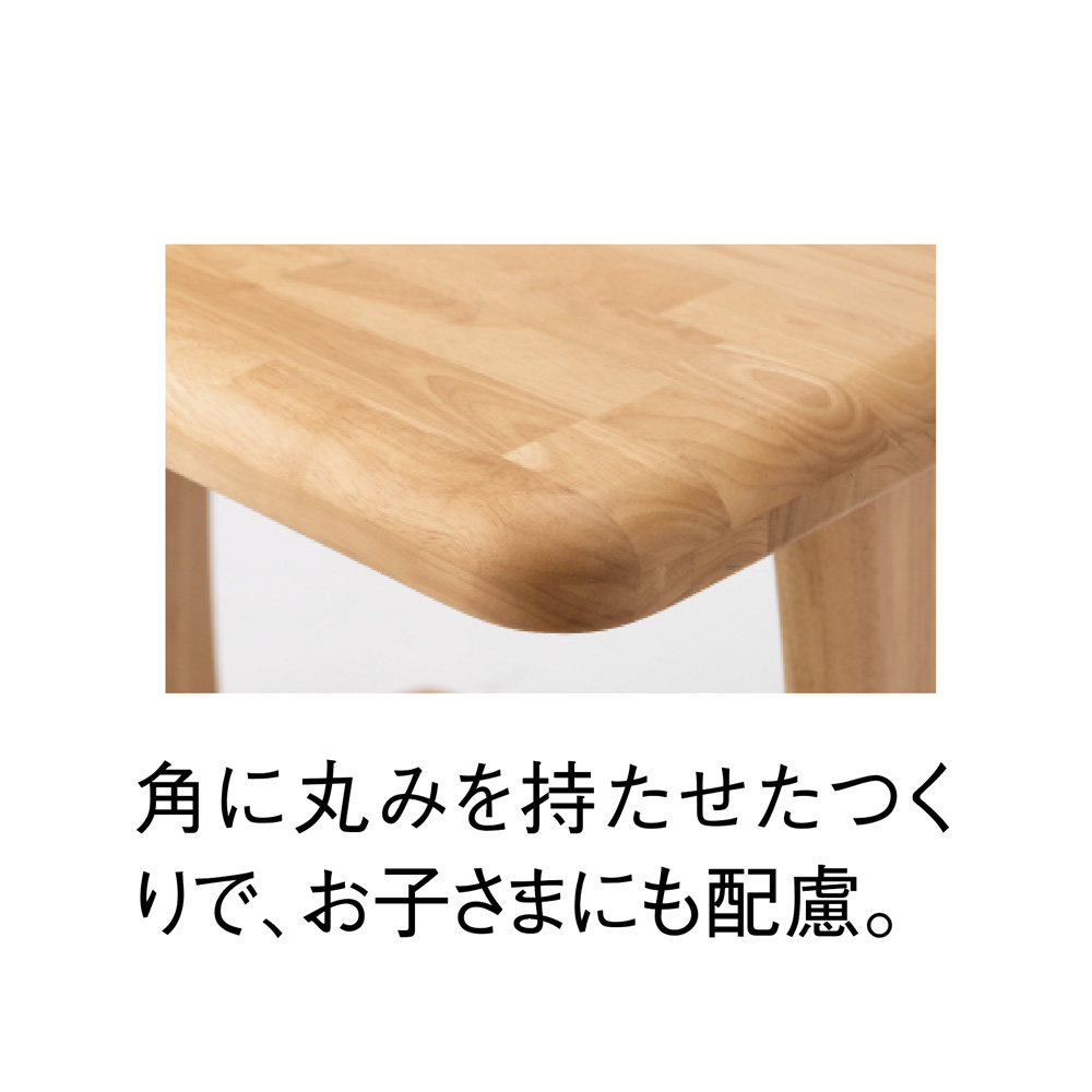 やさしくカーブを描いた天然木の角丸仕上げが特徴の「角丸優しいダイニングシリーズ」。小さなお子様やご年配の方まで、家族みんなが使いやすい配慮が詰まったダイニングシリーズです。長い期間ご使用いただけるよう丈夫な設計になっています。豊富なバリエーションによる組み合わせで、様々な暮らしのシーンに寄り添います。こちらの商品は左右の出入りがしやすい2本脚タイプのテーブルです。回転チェアとの組み合わせがおすすめです。天然木の角丸仕上げの優しいデザイン天然木をふんだんに使用した角丸仕上げの形状はやわらかくぬくもりのある感触です。ちょっとカバンを置いたり椅子を引いたときにぶつかっても、当たりがやわらかで安心です。定番の飽きの来ないデザインと、丈夫なラバーウッド材を使用した安定感のある設計になっているので、どんなインテリアにも合わせやすく長い期間ご使用いただけます。豊富なバリエーションから、暮らしに合った組み合わせをダイニングテーブルは2タイプ×4サイズ、チェアは肘無しタイプと肘あり回転タイプ、ベンチは2サイズをご用意しております。ご夫婦お二人でゆったり使いたいときは幅90タイプを、子どもがいらっしゃる4名以上のご家庭にはお部屋の広さに併せて幅125・140・165を選ぶなど、家族構成に合わせてコーディネートをお楽しみください。※テーブルとベンチの組み合わせ例(脚の間に入るサイズ) テーブル幅125、140→ベンチ幅100 テーブル幅160→ベンチ幅140