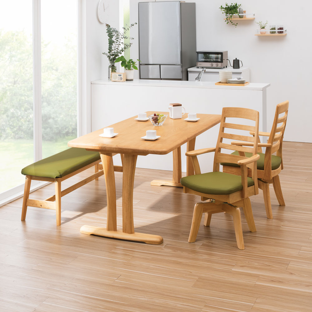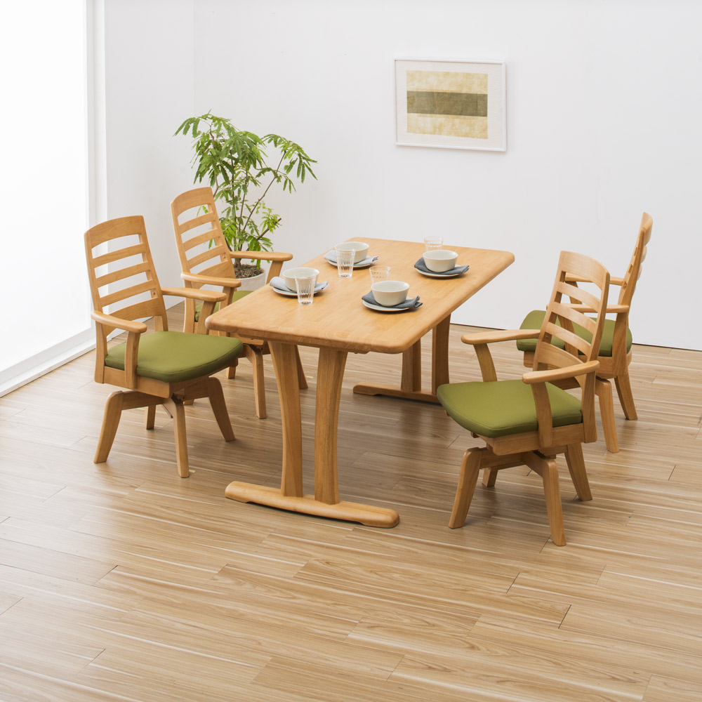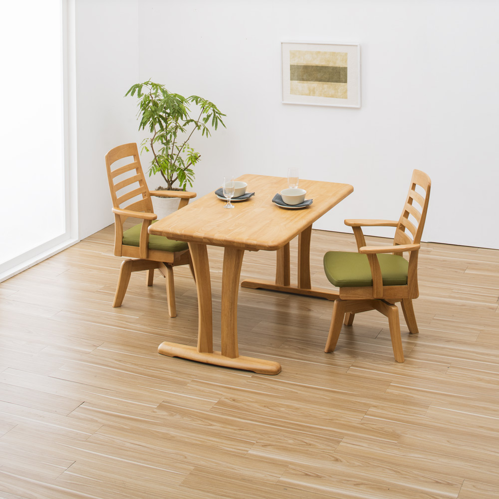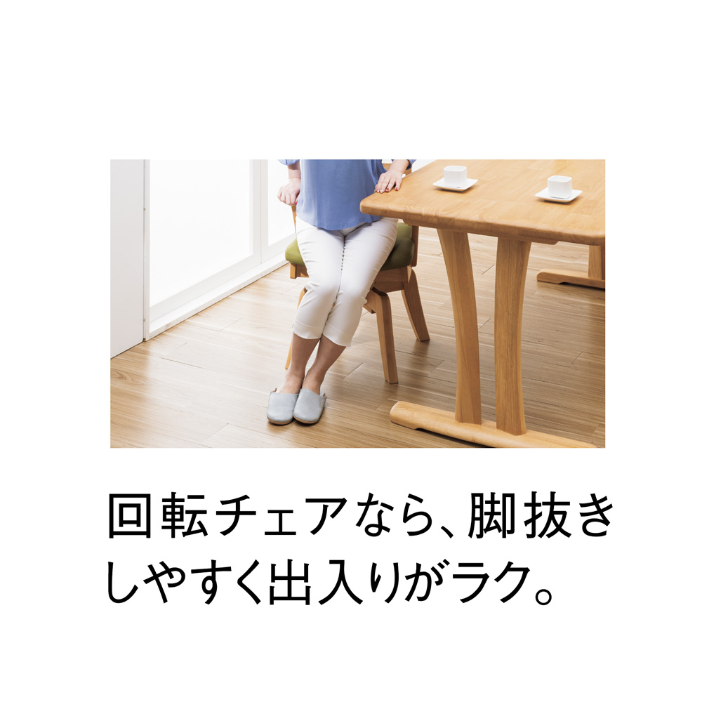 やさしくカーブを描いた天然木の角丸仕上げが特徴の「角丸優しいダイニングシリーズ」。小さなお子様やご年配の方まで、家族みんなが使いやすい配慮が詰まったダイニングシリーズです。長い期間ご使用いただけるよう丈夫な設計になっています。豊富なバリエーションによる組み合わせで、様々な暮らしのシーンに寄り添います。こちらの商品はダイニングチェアの肘あり回転タイプです。2本脚タイプのダイニングテーブルとの組み合わせがおすすめです。出入りがしやすい半肘設計、2本脚タイプのテーブルとの相性抜群肘を座面に対し半分の長さにすることで、立ち座り・出入りがしやすい設計になっています。2本脚タイプのテーブルと組み合わせれば、回転時テーブル脚に当たることなくよりスムーズに出入りが可能です。天然木の角丸仕上げの優しいデザイン天然木をふんだんに使用した角丸仕上げの形状はやわらかくぬくもりのある感触です。ちょっとカバンを置いたり椅子を引いたときにぶつかっても、当たりがやわらかで安心です。定番の飽きの来ないデザインと、丈夫なラバーウッド材を使用した安定感のある設計になっているので、どんなインテリアにも合わせやすく長い期間ご使用いただけます。豊富なバリエーションから、暮らしに合った組み合わせをダイニングテーブルは2タイプ×4サイズ、チェアは肘無しタイプと肘あり回転タイプ、ベンチは2サイズをご用意しております。ご夫婦お二人でゆったり使いたいときは幅90タイプを、子どもがいらっしゃる4名以上のご家庭にはお部屋の広さに併せて幅125・140・165を選ぶなど、家族構成に合わせてコーディネートをお楽しみください。