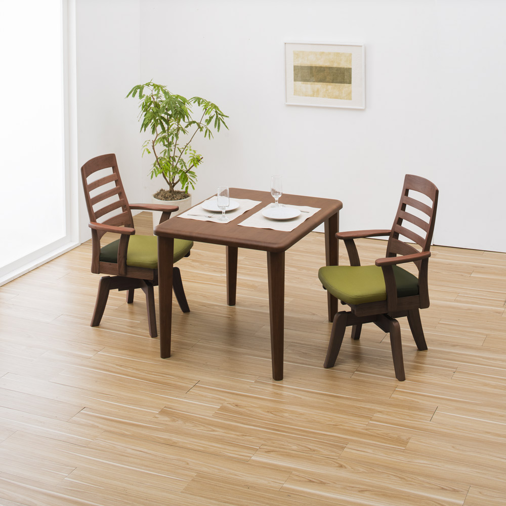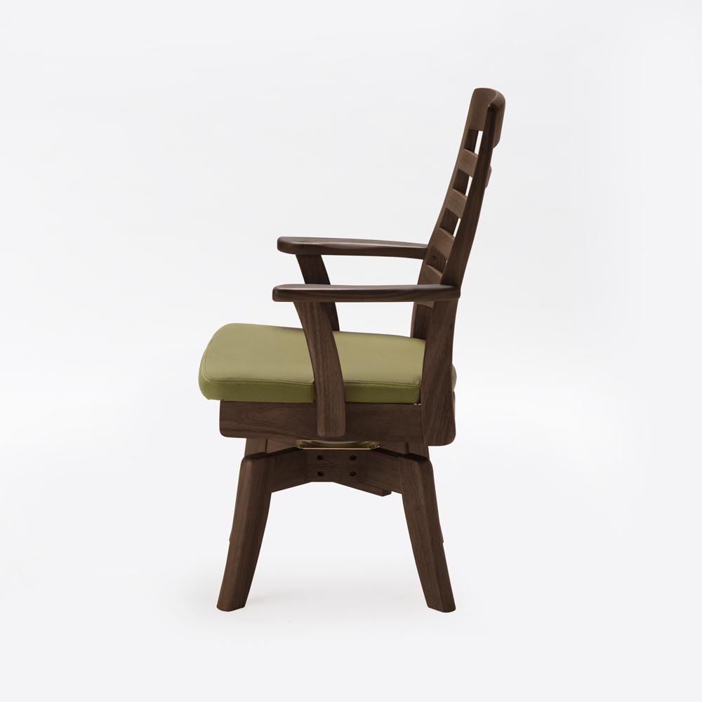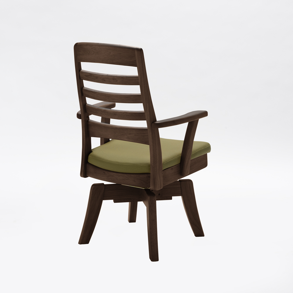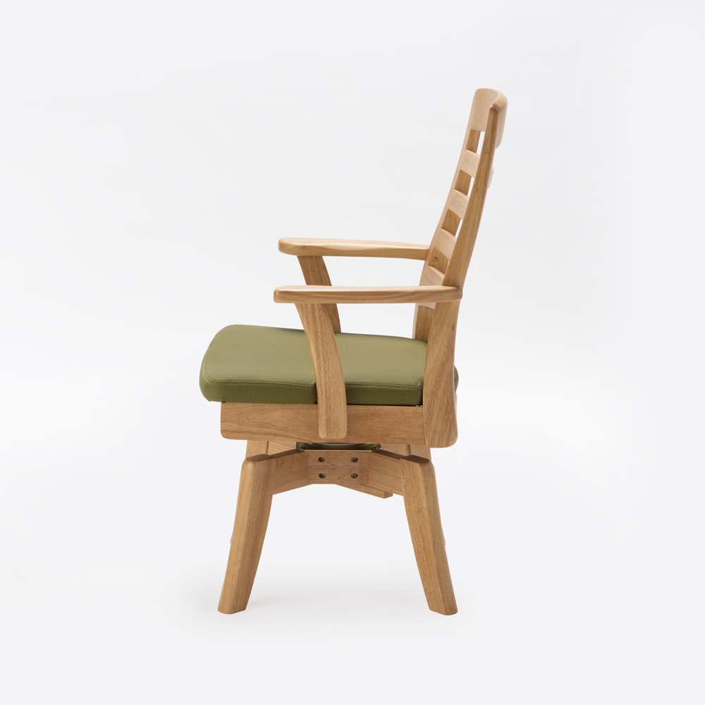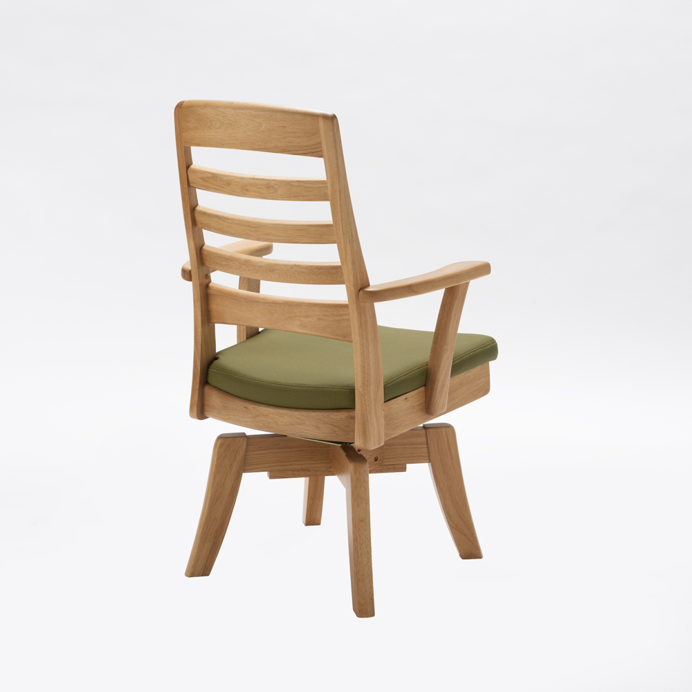 やさしくカーブを描いた天然木の角丸仕上げが特徴の「角丸優しいダイニングシリーズ」。小さなお子様やご年配の方まで、家族みんなが使いやすい配慮が詰まったダイニングシリーズです。長い期間ご使用いただけるよう丈夫な設計になっています。豊富なバリエーションによる組み合わせで、様々な暮らしのシーンに寄り添います。こちらの商品はダイニングチェアの肘あり回転タイプです。2本脚タイプのダイニングテーブルとの組み合わせがおすすめです。出入りがしやすい半肘設計、2本脚タイプのテーブルとの相性抜群肘を座面に対し半分の長さにすることで、立ち座り・出入りがしやすい設計になっています。2本脚タイプのテーブルと組み合わせれば、回転時テーブル脚に当たることなくよりスムーズに出入りが可能です。天然木の角丸仕上げの優しいデザイン天然木をふんだんに使用した角丸仕上げの形状はやわらかくぬくもりのある感触です。ちょっとカバンを置いたり椅子を引いたときにぶつかっても、当たりがやわらかで安心です。定番の飽きの来ないデザインと、丈夫なラバーウッド材を使用した安定感のある設計になっているので、どんなインテリアにも合わせやすく長い期間ご使用いただけます。豊富なバリエーションから、暮らしに合った組み合わせをダイニングテーブルは2タイプ×4サイズ、チェアは肘無しタイプと肘あり回転タイプ、ベンチは2サイズをご用意しております。ご夫婦お二人でゆったり使いたいときは幅90タイプを、子どもがいらっしゃる4名以上のご家庭にはお部屋の広さに併せて幅125・140・165を選ぶなど、家族構成に合わせてコーディネートをお楽しみください。