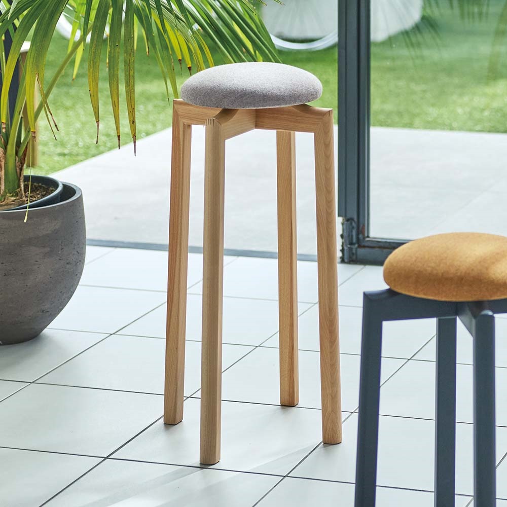 カラフルな座面はまるで森の中にちょこんと育つキノコのような可愛らしいスツール。すっとしたスリムな美脚とぽってりとした座面。座面生地には北欧デンマークを代表する生地メーカー「Kvadrat(クヴァドラ)」を使用。シンプルなシルエットは職人業だからこそ実現できる技術です。シンプルなシルエットは職人業だからこそ実現できる技術です。使用したいシーンに合わせて高さを2パターンからお選びいただけます。ちょっとだけ腰掛けたい、にぴったりなキノコみたいなスツール名前のキノコのようなシルエットが特徴的なスツールは、可愛らしいビジュアルとは裏腹に、職人のこだわりと使う人のための気遣いが詰まったこだわりのアイテム。場所を取らず、使用シーンも問わないので新築祝いやお引越し祝いなどにもおすすめ。すっきりとした脚は日本の職人が作るこだわりの構造で出来ています脚部はフィンガージョイントという、掘り込みで作った溝を組み合わせる技術で実現。細かい作業ですが、しっかりとした強度を持たせることが出来る技で、補強桟を入れずに十分な耐久性を実現しています。スタッキングができる省スペース設計で何脚あっても大丈夫見かけによらずこちらのスツールはスタッキングが可能。使用しない際は省スペースに。スタッキングしてもコロンとした座面はよく見えるので、部屋の隅にそのまま置いてもかわいいビジュアルが魅力的です。使用シーンに合わせて選べる高さは2タイプ高さ60cmタイプ高さが一般的な椅子よりも高い60cmタイプは、立ち座りが多いシーンでおすすめ。キッチンでの調理中やお化粧する際の洗面台などに。サイズがコンパクトなので、水回りに置いても動線の邪魔になりません。高さ43cmタイプ一般的なチェアと同じ高さ43cmは、ダイニング周りやちょっとしたワークスペースなどの、ある程度座って作業するような場所での使用に。来客時に使用するサブのイスとしても便利です。北欧デンマークを代表する、生地メーカー「Kvadrat(クヴァドラ)」を使用生地はマグレーテ・オッドガードによってデザインされたウール張り地のテキスタイルです。新しいメランジュの表現と緻密にニュアンスを調和させることに特に力を注いでいます。マグレーテ・オッドガードは、2つの異なる色の糸を結合することで、これを実現しました。それぞれが2つの色を組み合わせたものです。他のメランジュとは異なり、アトラスの色は繊維に混ぜられていません。代わりに、構造を通じてパターンのように表現されます。その結果、テキスタイルは色の強度と複雑な色の詳細を提供します。選べるカラーバリエーション大人でも使いやすく、かつ可愛らしいシルエットを損なわないカラーバリエーションをご用意しました。イエローは少しだけオレンジがかった温かみのある黄色、グレーは、よく目を凝らすとうっすら黄色い格子模様が付いています。またシックな印象を与え、より大人っぽく仕上がるブラックの脚をお選びいただけます。ブランド:匠工芸/たくみこうげい匠工芸は、1979年に創業し、北海道旭川家具を代表するメーカー。現代の暮らしを楽しく美しくする家具という道具に、日本伝統の木工技術を生かすため、手仕事を大切にしながら創意工夫を続けています。