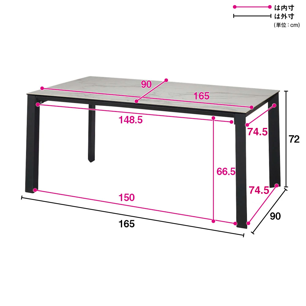 重厚なセラミック天板の、上質感漂うダイニングテーブル。カラーにより表情の異なる素材感がおしゃれな天板に、スチール脚が洗練を添えます。セラミックは熱や傷、汚れに強く、永く美しさを保てるのも魅力。お部屋に合わせて選べる5サイズをご用意しました。幅165cmタイプは、4人掛けで広々使いたい方におすすめです。高級感と機能性を両立、永く美しさを保つセラミック天板でダイニングを上質な空間に(ア)サンドグレイ ※写真は別売りの幅135cmタイプとチェアデザイン、機能性、耐久性。そのすべてにご満足いただけるセラミックテーブル。インテリアを格上げする高級感がありながら、扱いもお手入れもラク。スチール製の脚部はシンプルで美しいだけでなく、強度にも優れています。熱・傷・汚れに強い「セラミック」が、ストレスなく美しさと清潔感をキープ毎日使うものだけに、傷や汚れが心配…。そんな方もセラミックなら気軽に扱え、ストレスフリーで永く愛用できます。●耐熱性が高く、短時間なら高温のフライパンや鍋などを直接置くことも。※通常は鍋敷きをご使用ください。●塗装の膜がなく高硬度なため、まな板代わりに使っても傷がつきません。タワシでゴシゴシ洗いもOK。●水分や油汚れも染み込まず、紫外線で色あせることもありません。アルコール除菌もできて清潔。清潔感のある「シャインホワイト」は、室内を明るく華やかに写真は幅165cmタイプ ※チェアは別売りのダイニングチェア高級感とエレガントさが魅力。空間を明るく見せてくれます。幅165cmタイプは4人掛けで広々使いたい方に。トレンドのベージュ系インテリアにも上品になじむ「スモークグレイ」※写真は別売りの幅150cmタイプと回転ダイニングチェアやわらかな色味の天板に、ベージュのスチール脚が上品な印象。落ち着きあるインテリアに。重厚感ある「サンドグレイ」※写真は別売りの幅180cmタイプとグレーハイバックチェアダイニングがシックで洗練された雰囲気に。深みのある色合いで、お料理も引き立ちます。カラーごとに異なる素材感×スチール脚がスタイリッシュ左から(ア)サンドグレイ、(イ)シャインホワイト、(ウ)スモークグレイ ※写真は幅90cmタイプ(ア)サンドグレイは凹凸のある焼き物特有の素材感。(イ)シャインホワイトと(ウ)スモークグレイは光沢のあるリッチでなめらかな質感。セラミック天板とスチール脚の配色で醸し出す雰囲気が変わり、さまざまなインテリアに対応します。角度を付けた脚部で脚元ひろびろ(イ)シャインホワイト座る人の邪魔にならず、空間も広く見えます。サイズも豊富に、お部屋や人数に合わせて選べる5サイズをご用意ダイニングチェアを組み合わせた場合の、チェアの数とゆとり感のイメージです。いつも美しいテーブルで、心地よく過ごせる空間づくりを(ウ)スモークグレイ ※写真は別売りの幅90cmタイプとチェア家族が集まるダイニングテーブルは、お家の中心になる大切な場所。傷や汚れがつきにくく、いつまでもきれいでいてくれるテーブルなら、毎日の使用も、お客さまの招待にも安心。家族の一員のように永く愛着のわく、大切な存在になります。