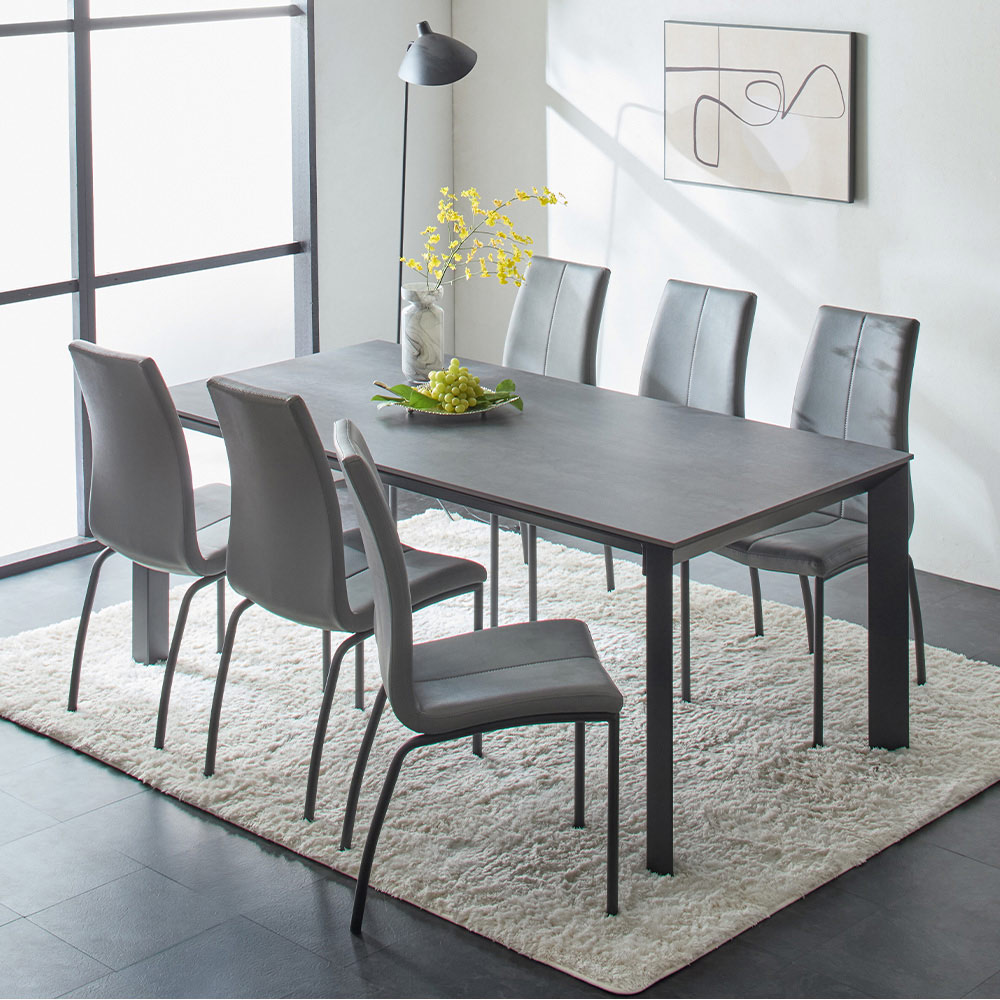 使用イメージ(ウ)スモークグレイ モダンで機能的なセラミックで上質なダイニング空間に。熱やキズ、汚れに強いセラミック天板は、ストレスなく、長く美しく使えるのが魅力。 ※写真は別売りのテーブル幅90cmです。チェアは別売りのチェアです。