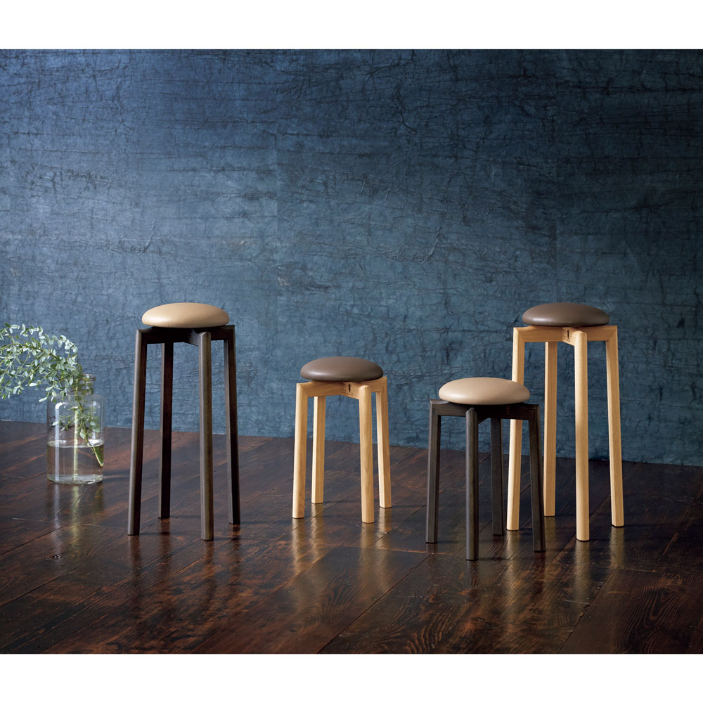 左から 高さ60cm(脚部ダークブラウン×座部ベージュ)、高さ43cm(脚部ナチュラル×座面ブラウン)、高さ43cm(脚部ダークブラウン×座部ベージュ)、高さ60cm(脚部ナチュラル×座面ブラウン)