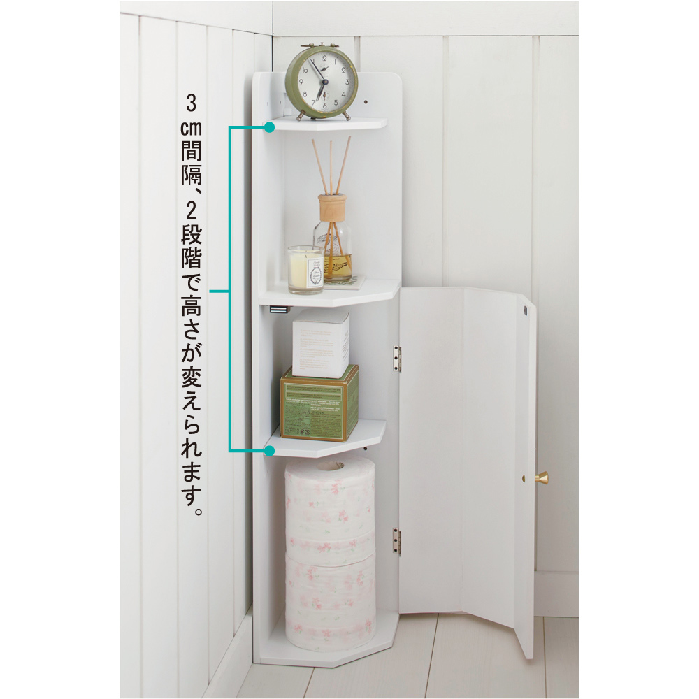 ディスプレイを楽しみながら、ブラシやトイレットペーパーなどの生活用品もしっかり収納するコーナーラック。天然木の風合いがワンランク上の上品な空間を演出します。お客様にも見せたくなる快適トイレで素敵なおもてなしを。こだわりトイレの「隠す」アイデア●コーナーのわずかなスペースに、掃除用品・トイレットペーパー・消臭スプレー、サニタリー用品などのトイレ雑貨を収納。●小箱のようなおしゃれなデザインの扉ですっきりと隠すことができます。●棚板は3cm間隔で2段階に調節可能。トイレクリーナーの高さに合わせて設置することができます。●扉内部の棚板を外せば、トイレの掃除ブラシを収納することができます。こだわりトイレの「魅せる」アイデア●オープン部分には、お気に入りの小物や写真を飾ったり、ポプリを置いて華やかさをプラスしたり…お客様に見せたくなるような空間づくりをお手伝いします。●オープン部の棚板も3cm間隔で2段階に調節可能。●本や背の高い芳香剤の高さに合わせて設置できます。●(イ)ナチュラル(ウ)ダークブラウンは天然木の化粧板を使用。●上品な風合いで、隅に置くだけでトイレをランクアップ。
