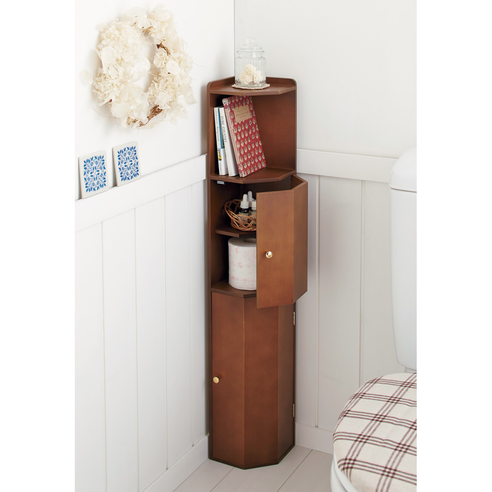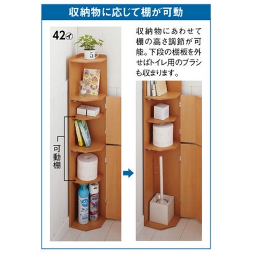ディスプレイを楽しみながら、ブラシやトイレットペーパーなどの生活用品もしっかり収納するコーナーラック。天然木の風合いがワンランク上の上品な空間を演出します。お客様にも見せたくなる快適トイレで素敵なおもてなしを。こだわりトイレの「隠す」アイデア●コーナーのわずかなスペースに、掃除用品・トイレットペーパー・消臭スプレーサニタリー用品などのトイレ雑貨を収納。●小箱のようなおしゃれなデザインの扉ですっきりと隠すことができます。●扉内部の2枚の棚板は3cm間隔で2段階に調節可能。トイレクリーナーやボトルの高さに合わせて設置することができます。●扉内部の棚板を外せば、トイレの掃除ブラシを収納することができます。こだわりトイレの「魅せる」アイデア●オープン部分には、お気に入りの小物や写真を飾ったり、ポプリを置いて華やかさをプラスしたり…お客様に見せたくなるような空間づくりをお手伝いします。●本や芳香剤、時計等をチョイ置きする棚として、コーナーに気軽に設置できるのも魅力的。●(イ)ナチュラル(ウ)ダークブラウンは天然木の化粧板を使用。上品な風合いで、隅に置くだけでトイレをランクアップさせます。