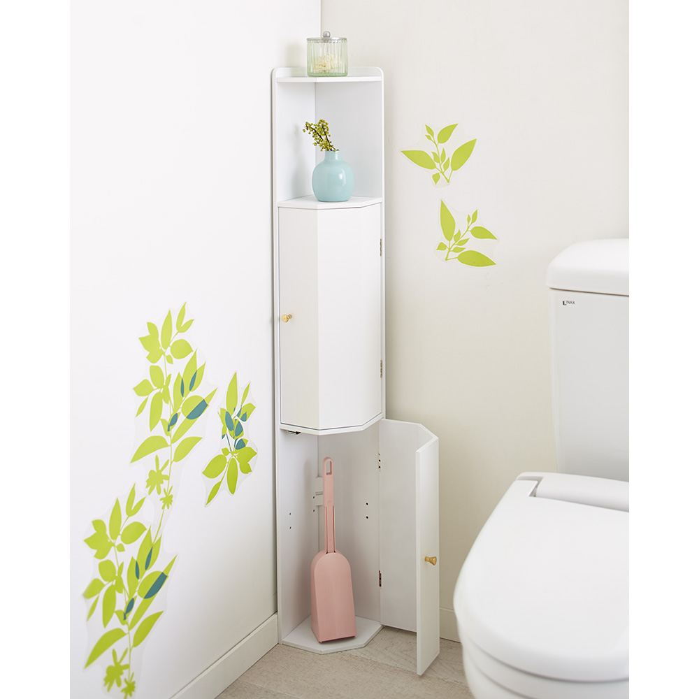 ディスプレイを楽しみながら、ブラシやトイレットペーパーなどの生活用品もしっかり収納するコーナーラック。更に収納力がアップした高さ120cmサイズ。天然木の風合いがワンランク上の上品な空間を演出します。お客様にも見せたくなる快適トイレで素敵なおもてなしを。こだわりトイレの「隠す」アイデア●コーナーのわずかなスペースに、掃除用品・トイレットペーパー・消臭スプレーサニタリー用品などのトイレ雑貨を収納。●小箱のようなおしゃれなデザインの扉ですっきりと隠すことができます。●扉内部の2枚の棚板は3cm間隔で2段階に調節可能。トイレクリーナーやボトルの高さに合わせて設置することができます。●扉内部の棚板を外せば、トイレの掃除ブラシを収納することができます。こだわりトイレの「魅せる」アイデア●オープン部分には、お気に入りの小物や写真を飾ったり、ポプリを置いて華やかさをプラスしたり…お客様に見せたくなるような空間づくりをお手伝いします。●本や芳香剤、時計等をチョイ置きする棚として、コーナーに気軽に設置できるのも魅力的。●(イ)ナチュラル(ウ)ダークブラウンは天然木の化粧板を使用。上品な風合いで、隅に置くだけでトイレをランクアップさせます。