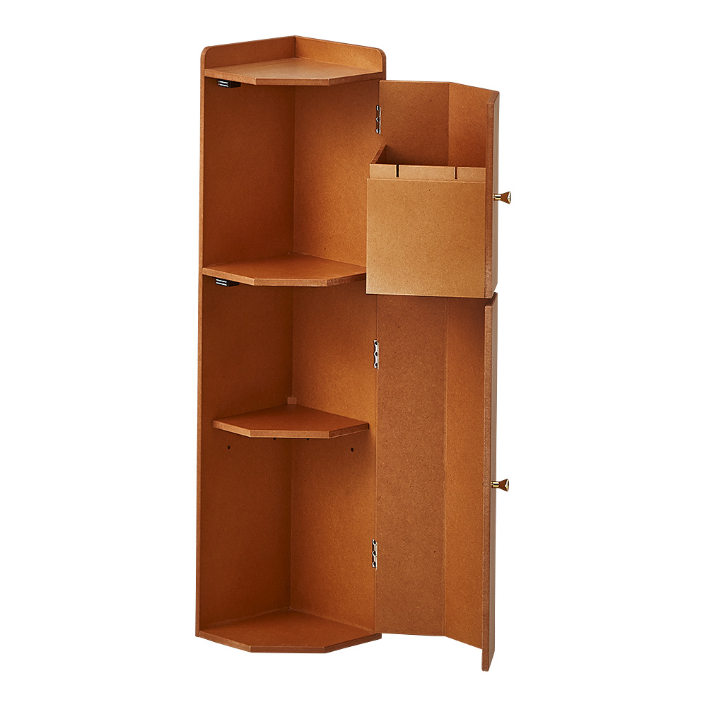 ディスプレイを楽しみながら、ブラシやトイレットペーパーなどの生活用品もしっかり収納するコーナーラック。上には便利なゴミ箱も付いているので、これ1台で充実のトイレタリー収納を実現することができます。こだわりトイレの「隠す」アイデア●コーナーのわずかなスペースに、掃除用品・トイレットペーパー・消臭スプレー、サニタリー用品などのトイレ雑貨を収納。ゴミ捨てもラクラク。●小箱のようなおしゃれなデザインの扉ですっきりと隠すことができます。●棚板は3cm間隔で2段階に調節可能。トイレクリーナーの高さに合わせて設置することができます。●扉内部の棚板を外せば、トイレの掃除ブラシを収納することができます。こだわりトイレの「魅せる」アイデア●オープン部分には、お気に入りの小物や写真を飾ったり、ポプリを置いて華やかさをプラスしたり…お客様に見せたくなるような空間づくりをお手伝いします。●オープン部の棚板も3cm間隔で2段階に調節可能。●本や背の高い芳香剤の高さに合わせて設置できます。●(イ)ナチュラル(ウ)ダークブラウンは天然木の化粧板を使用。●上品な風合いで、隅に置くだけでトイレをランクアップ。