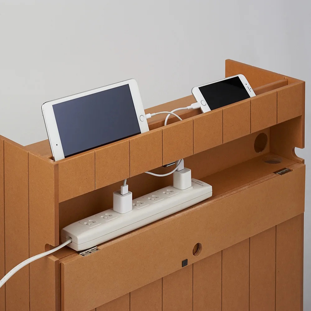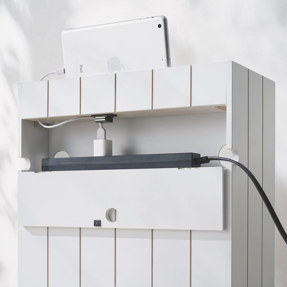 コードタップ収納部から、上部のスマホやタブレット端末を充電できます。 タップ収納部は、フラップ扉で隠せます。