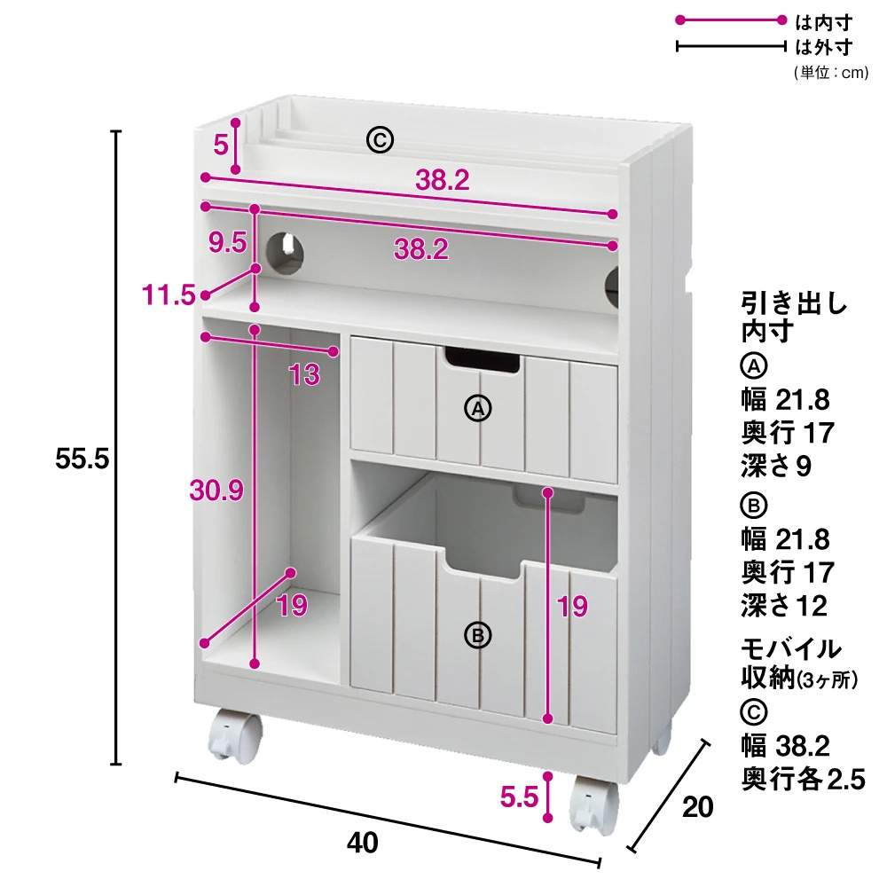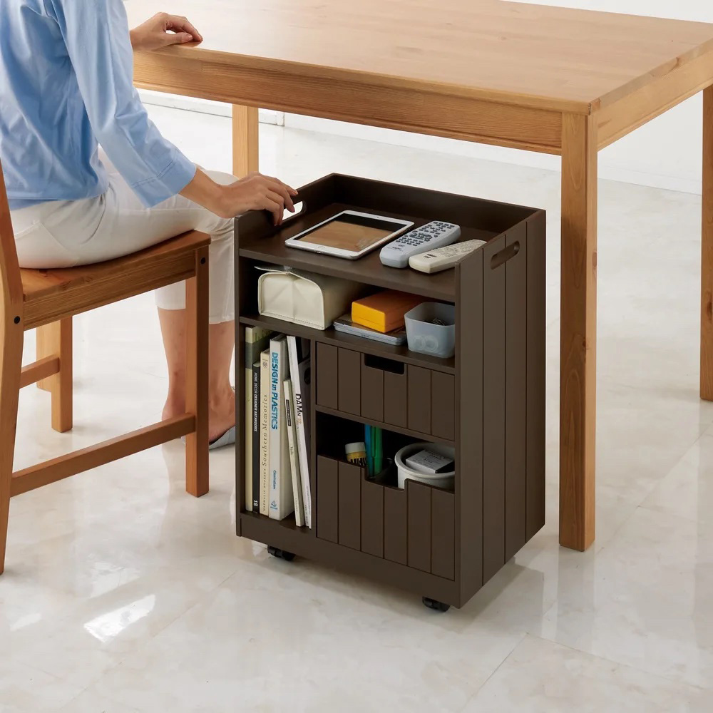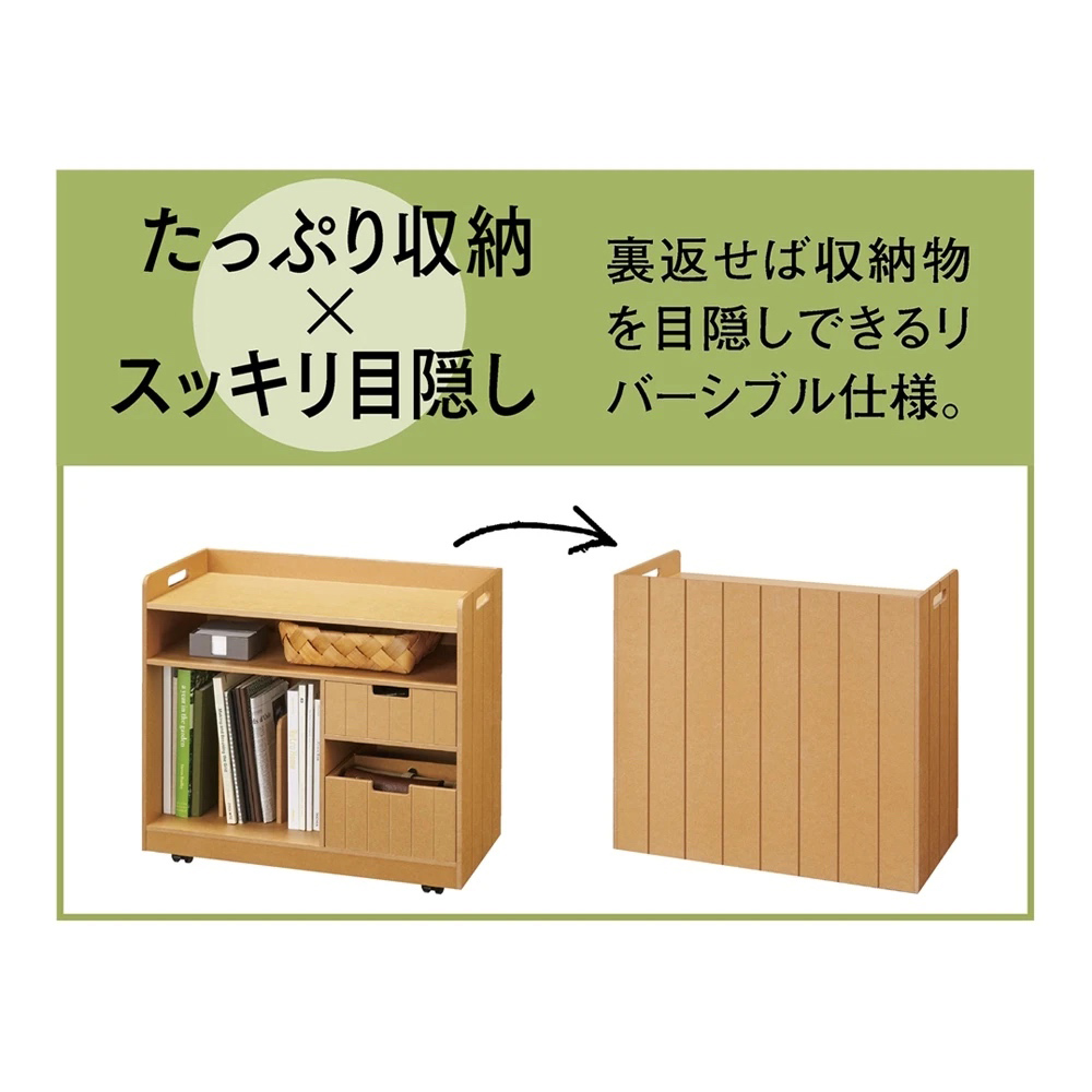 使いたい場所に動かして、裏返せば収納物を目隠し。生活感をすっきり隠しながらも、リビング回りのごちゃごちゃをすっきりできるディノスの人気商品です。ご要望にお応えして、携帯やPCの充電をしたり、モデムやルーターまでしまえる「モバイル収納タイプ」が新発売しました!リモートワーク、在宅勤務、テレワークでの利用にもぴったりの収納ワゴンです。使いたい場所に動かして、裏返せば収納物を目隠し。物が少なく、すっきりとしたリビングが理想…でも、現実はそうはいかずごちゃごちゃしてしまう…そんなお客様におすすめの「隠せるリビング整理ワゴン」です。キャスター付きなので、来客時にはくるっとまわして壁付けするだけで目隠し収納できるキャスター付きラックの登場です。キャスター付きなので、ダイニングテーブルの近くまで移動させてデスクワゴンのようにも使えます。収納物に合わせて選べる2サイズ・幅40cmタイプ・幅60cmタイプ下段の引き出しは取り出してトレイとしても利用できます。新発売!モバイル収納タイプは、天板で携帯やタブレット端末の充電ができます。天板には、タブレットや携帯が立てられるスリットつきで、タップ収納部から上部にコードが通せるので充電もできて便利。タップ収納部にはコンセントタップが置けます。使わないときはフラップ扉で隠せます。タップ収納部と下段の収納部もつなげるので、モデム類の収納にも便利です。ナチュラル、ホワイト、ダークブラウンの3色からお選びいただけます。シンプルだからこそ置く部屋を選びませんリビングルームはもちろん、ダイニングテーブルの下やソファの横などあらゆるお部屋で大活躍!窓下収納庫としても省スペースで使用できます。天板もゆったりしているので、子供部屋やリビングでも、ランドセルラックとして使用するのもおすすめです。天板にFAXや電話を置けば、FAX台・電話台としても。信頼と安心の国内工場での生産品(日本製)・国内の職人がひとつずつ丁寧に仕上げたキッチンラック・キッチンボードの逸品です。・細部の丁寧な仕上がりなど、国産品ならではの高品質な「隠せるリビング整理ワゴン」をお楽しみください。