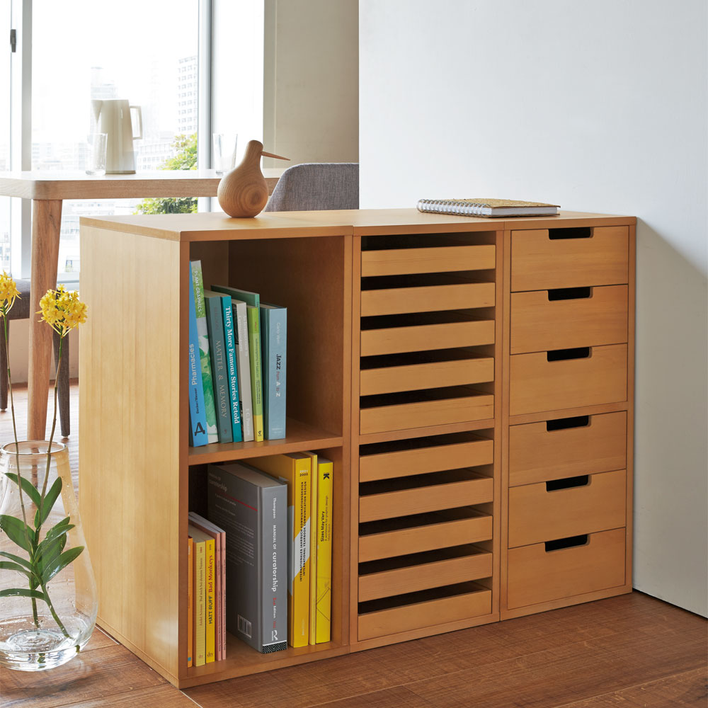 同シリーズの10段トレーチェスト、6段チェストとの組み合わせコーディネート例。リビングルームのFAX台としても使えます。