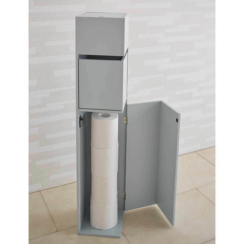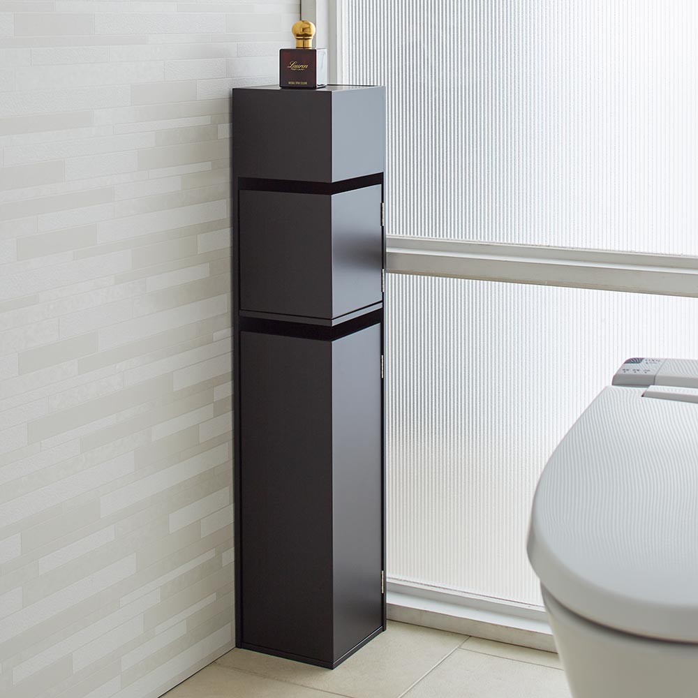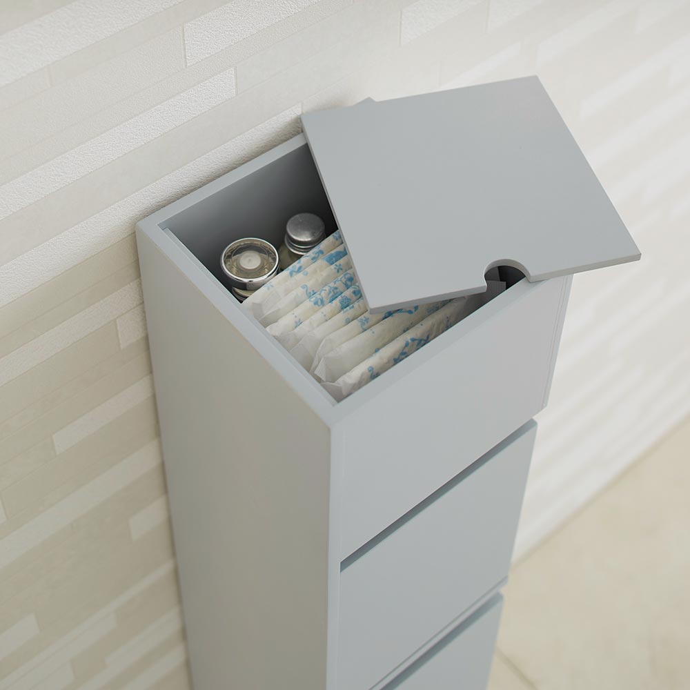 省スペースにぴったり収まる!マストでしまいたいトイレ用品が一式目隠し収納できる、モダンなトイレ収納。トイレに座ったままで取り出しやすい高さ設計&すぐ手が届くコーナータイプ。トイレットペーパーや芳香剤、生理用品、ブラシまでまとめてすっきりスリムに美的収納できます。狭いトイレでも置ける、商品サイズは幅わずか17cmのスリム設計省スペースに収納空間を作るため、徹底的にスリムなデザインにこだわりました。しかもトイレに座ったままで取り出しやすい高さ設計にしているので、狭い場所に収納しても、収納物をサッと取り出せます。※転倒防止板を含めると20cmとなります。トイレの必需品が一式収まる!1段目:天板部にはフタ式の収納スペース(幅14×奥行15×高さ11cm)。生理用品、芳香剤やトイレブラシの替えなど細々した物をしまって。2段目:扉内にはごみ箱の専用スペース(有効高さ20cm)。切れ込みにコンビニの小サイズの袋を引っかけられます。3段目:扉内にはブラシの専用スペース。(幅15×奥行15×高さ50cm)。トイレブラシをすぐ取り出して掃除できます。またトイレットペーパーなら4個まで収納可。生活感を目隠しできるモダンな佇まい扉を閉じると、シンプルでスクエアなボックス型に。収納庫に見えないおしゃれなデザインも魅力です。ホワイト・ブラック・ライトグレーと、トイレの雰囲気に合わせて3色からお選びいただけます。シンプルなデザインなので北欧、モダン、ブルックリンなど様々なテイストにマッチします。安心と信頼の職人技が光る国産の収納家具熟練の家具職人がひとつずつ丁寧に仕上げた、ワンランク上の日本製サニタリーストッカーです。細部の丁寧な仕上がりなど日本製の高品質なランドリー・サニタリー収納で快適な暮らしを。届いたらすぐ使えるのが嬉しい完成品本体は組立不要。(別途、設置には転倒防止版の取り付け作業があります。)届いたらすぐ使えるのが嬉しい完成品でお届けします。