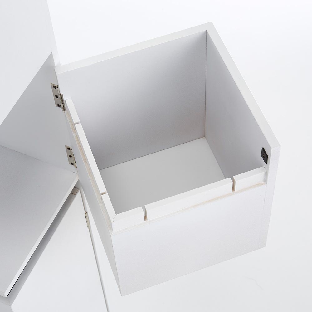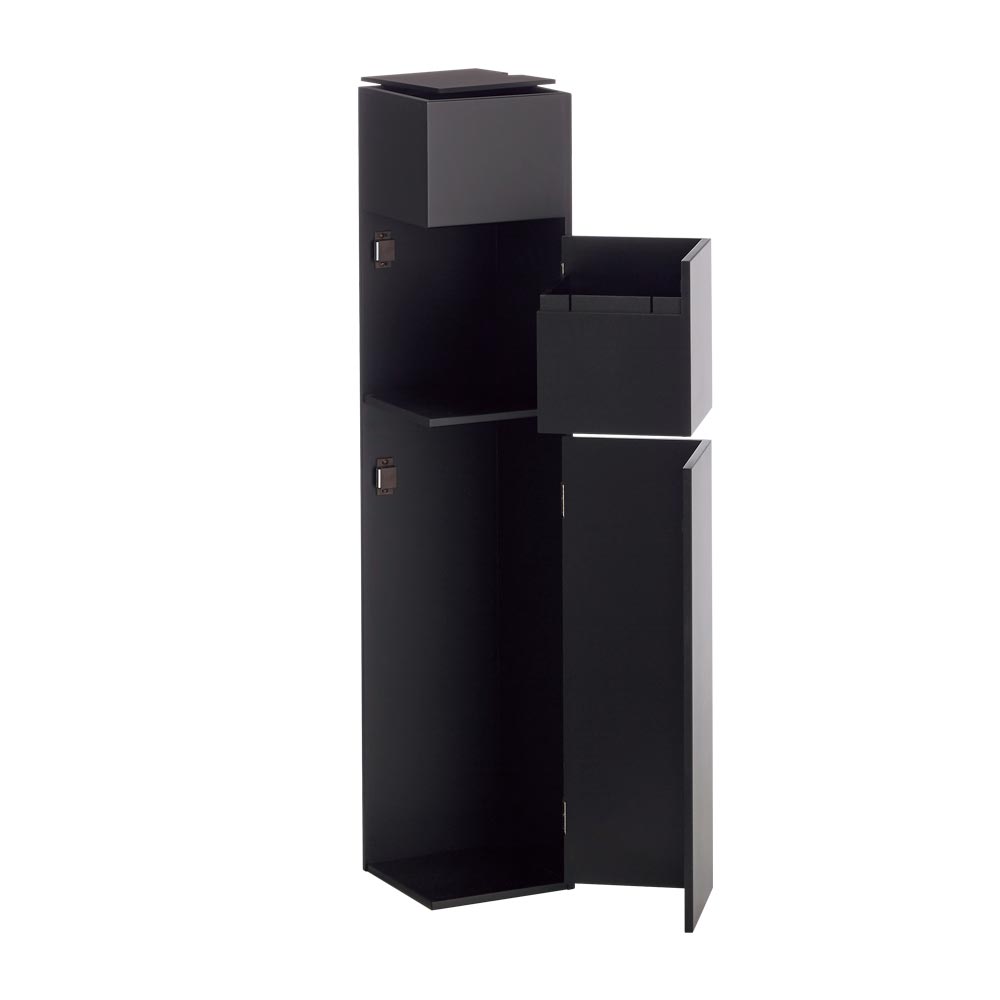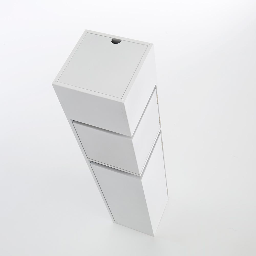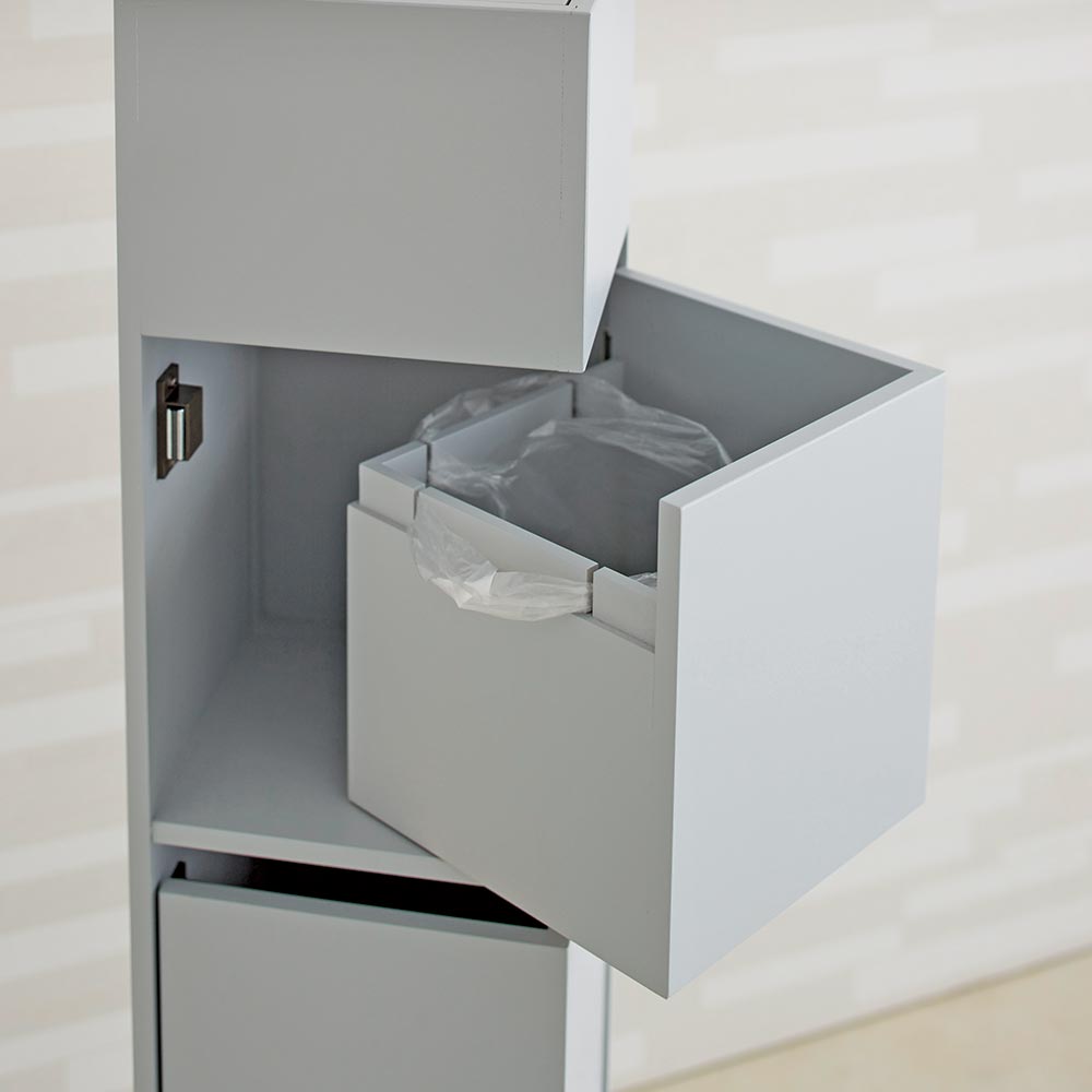 省スペースにぴったり収まる!マストでしまいたいトイレ用品が一式目隠し収納できる、モダンなトイレ収納。トイレに座ったままで取り出しやすい高さ設計&すぐ手が届くコーナータイプ。トイレットペーパーや芳香剤、生理用品、ブラシまでまとめてすっきりスリムに美的収納できます。狭いトイレでも置ける、商品サイズは幅わずか17cmのスリム設計省スペースに収納空間を作るため、徹底的にスリムなデザインにこだわりました。しかもトイレに座ったままで取り出しやすい高さ設計にしているので、狭い場所に収納しても、収納物をサッと取り出せます。※転倒防止板を含めると20cmとなります。トイレの必需品が一式収まる!1段目:天板部にはフタ式の収納スペース(幅14×奥行15×高さ11cm)。生理用品、芳香剤やトイレブラシの替えなど細々した物をしまって。2段目:扉内にはごみ箱の専用スペース(有効高さ20cm)。切れ込みにコンビニの小サイズの袋を引っかけられます。3段目:扉内にはブラシの専用スペース。(幅15×奥行15×高さ50cm)。トイレブラシをすぐ取り出して掃除できます。またトイレットペーパーなら4個まで収納可。生活感を目隠しできるモダンな佇まい扉を閉じると、シンプルでスクエアなボックス型に。収納庫に見えないおしゃれなデザインも魅力です。ホワイト・ブラック・ライトグレーと、トイレの雰囲気に合わせて3色からお選びいただけます。シンプルなデザインなので北欧、モダン、ブルックリンなど様々なテイストにマッチします。安心と信頼の職人技が光る国産の収納家具熟練の家具職人がひとつずつ丁寧に仕上げた、ワンランク上の日本製サニタリーストッカーです。細部の丁寧な仕上がりなど日本製の高品質なランドリー・サニタリー収納で快適な暮らしを。届いたらすぐ使えるのが嬉しい完成品本体は組立不要。(別途、設置には転倒防止版の取り付け作業があります。)届いたらすぐ使えるのが嬉しい完成品でお届けします。