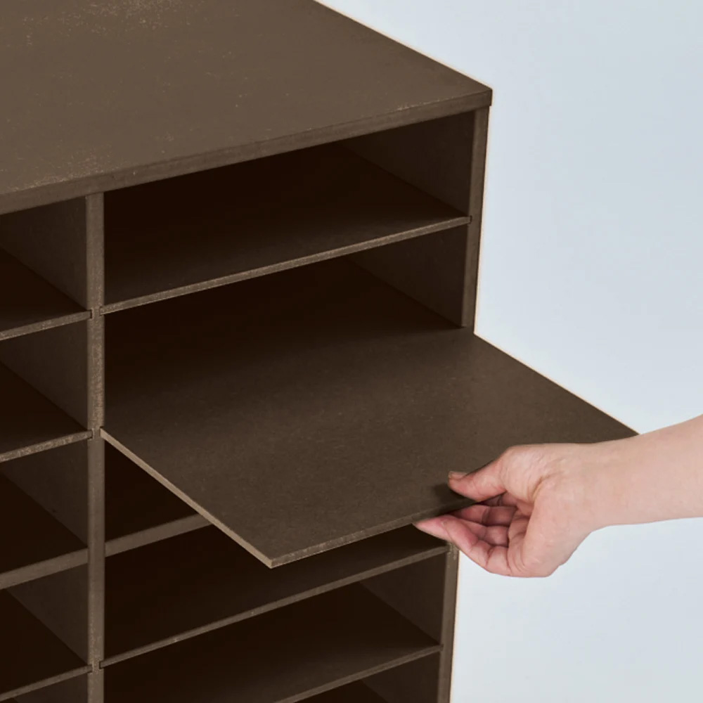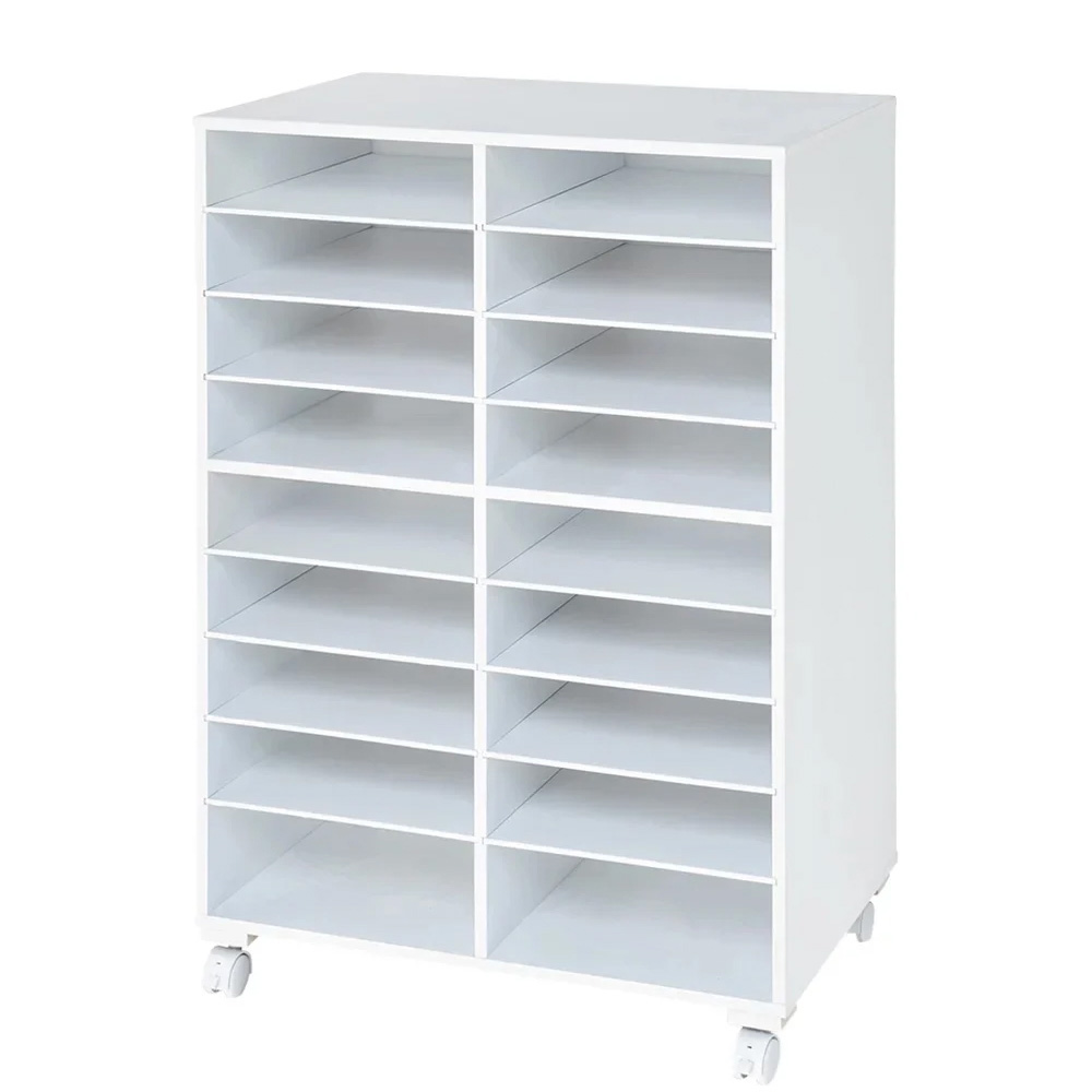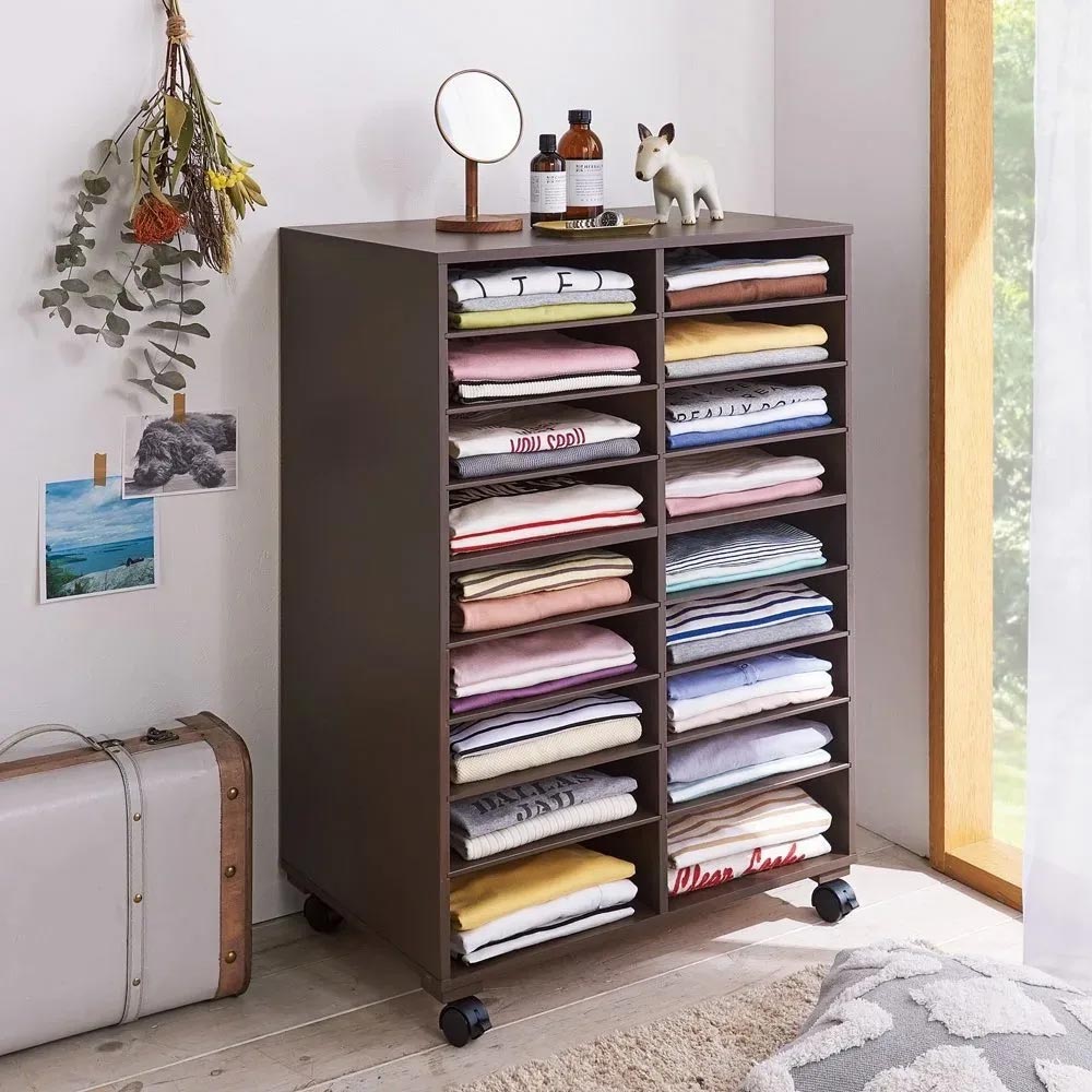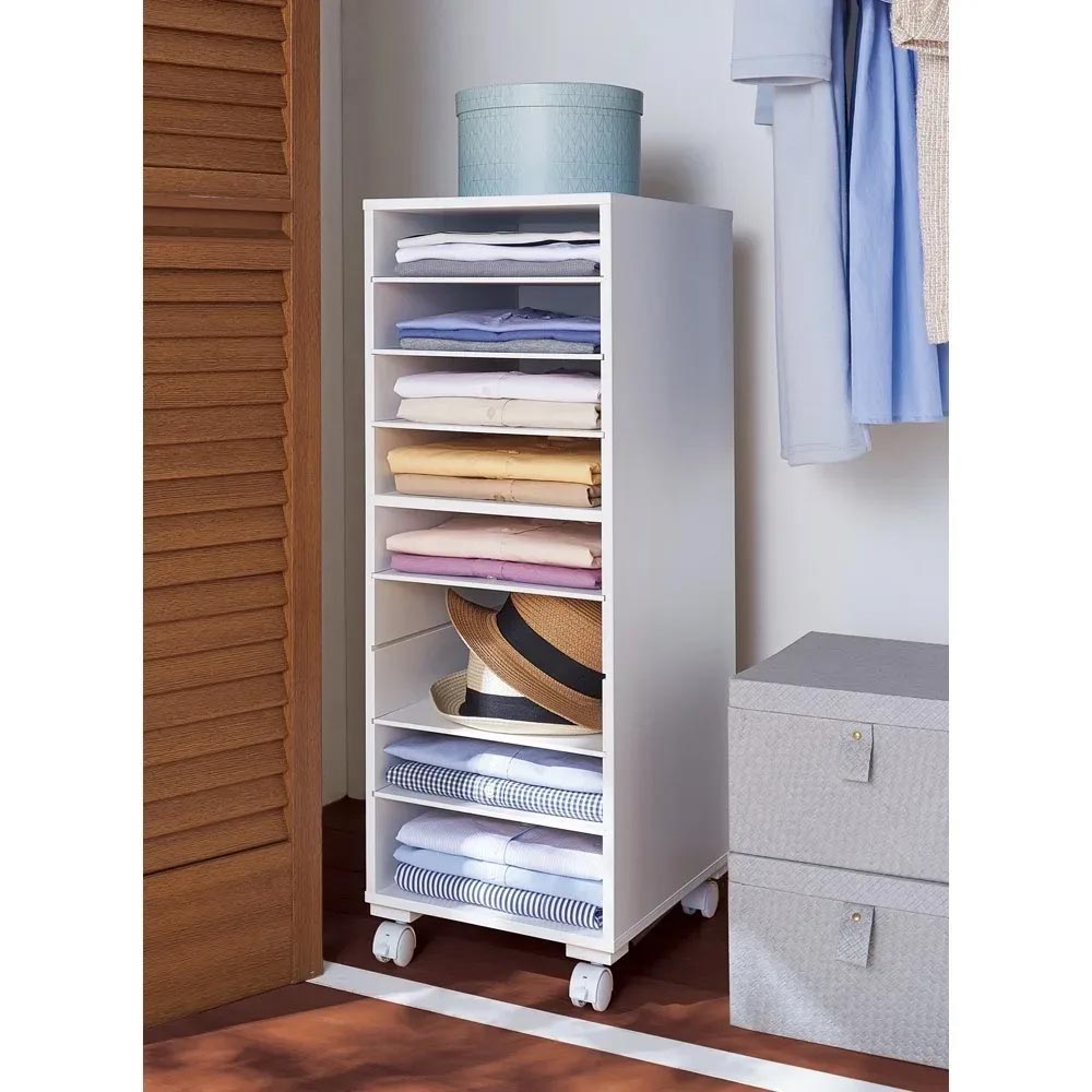 探しやすく、取り出しやすく、しまいやすい。 Tシャツやニットを、積み重ねずに収納できる洋服収納ラック。 棚板が引き出せるから出し入れもラクラク。 しまい込まないから持っている服が一目瞭然。 棚板を減らして、高さのあるものも収納できます。 襟元の型崩れが防止できるのでYシャツ収納にもオススメです。一軍シャツの定位置ラック大事にしまっておいた洋服が、しわになっていて洗いなおさなければいけなくなった…そんな経験、ありませんか?このラックは、棚がたくさんあるので、洋服がたくさん重ねられません。重ねられないということは、しわになりにくいのです。探しやすい深い引き出しにしまい込むと、掘り起こさなければ目的の服が見つからないことも…このラックには前板がないので、しまった洋服が一目瞭然、すぐに見つかります。似たような服を買ってしまうことも少なくなるかもしれません。しまいやすく、取り出しやすいたたんだ洋服、クリーニングから戻ってきた洋服、買ってきたばかりの洋服。そのままサッとしまえます。棚がスライドするので、しまいやすく、取り出しやすい設計です。棚板を抜けば、厚みのある洋服もしまえます。Yシャツの収納にも積み重ねないで収納できるので、襟の型崩れを気にせずにYシャツが収納できます。たくさん積み重ねないので、不必要な重ねジワも防げます。キャスター付きキャスター付きなので、クローゼットの中でまたはお部屋で、お好きな場所で使えます。お掃除や衣替えにも便利です。天板も使えますやわらかい収納ラックでは、上部に物が置けません。このラックは丈夫なMDF製なので、天板上にバッグなどを置くことができます。シンプルなデザインとカラーインテリアに合わせやすい(ア)ホワイトと(イ)ダークブラウンの2色展開。必要最小限のシンプルなデザインがスタイリッシュです。