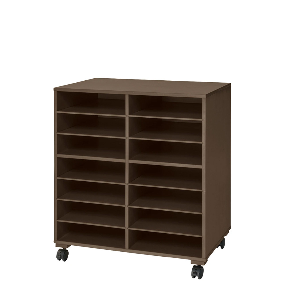 探しやすく、取り出しやすく、しまいやすい。 Tシャツやニットを、積み重ねずに収納できる洋服収納ラック。 棚板が引き出せるから出し入れもラクラク。 しまい込まないから持っている服が一目瞭然。 棚板を減らして、高さのあるものも収納できます。 襟元の型崩れが防止できるのでYシャツ収納にもオススメです。一軍シャツの定位置ラック大事にしまっておいた洋服が、しわになっていて洗いなおさなければいけなくなった…そんな経験、ありませんか?このラックは、棚がたくさんあるので、洋服がたくさん重ねられません。重ねられないということは、しわになりにくいのです。探しやすい深い引き出しにしまい込むと、掘り起こさなければ目的の服が見つからないことも…このラックには前板がないので、しまった洋服が一目瞭然、すぐに見つかります。似たような服を買ってしまうことも少なくなるかもしれません。しまいやすく、取り出しやすいたたんだ洋服、クリーニングから戻ってきた洋服、買ってきたばかりの洋服。そのままサッとしまえます。棚がスライドするので、しまいやすく、取り出しやすい設計です。棚板を抜けば、厚みのある洋服もしまえます。Yシャツの収納にも積み重ねないで収納できるので、襟の型崩れを気にせずにYシャツが収納できます。たくさん積み重ねないので、不必要な重ねジワも防げます。キャスター付きキャスター付きなので、クローゼットの中でまたはお部屋で、お好きな場所で使えます。お掃除や衣替えにも便利です。天板も使えますやわらかい収納ラックでは、上部に物が置けません。このラックは丈夫なMDF製なので、天板上にバッグなどを置くことができます。シンプルなデザインとカラーインテリアに合わせやすい(ア)ホワイトと(イ)ダークブラウンの2色展開。必要最小限のシンプルなデザインがスタイリッシュです。