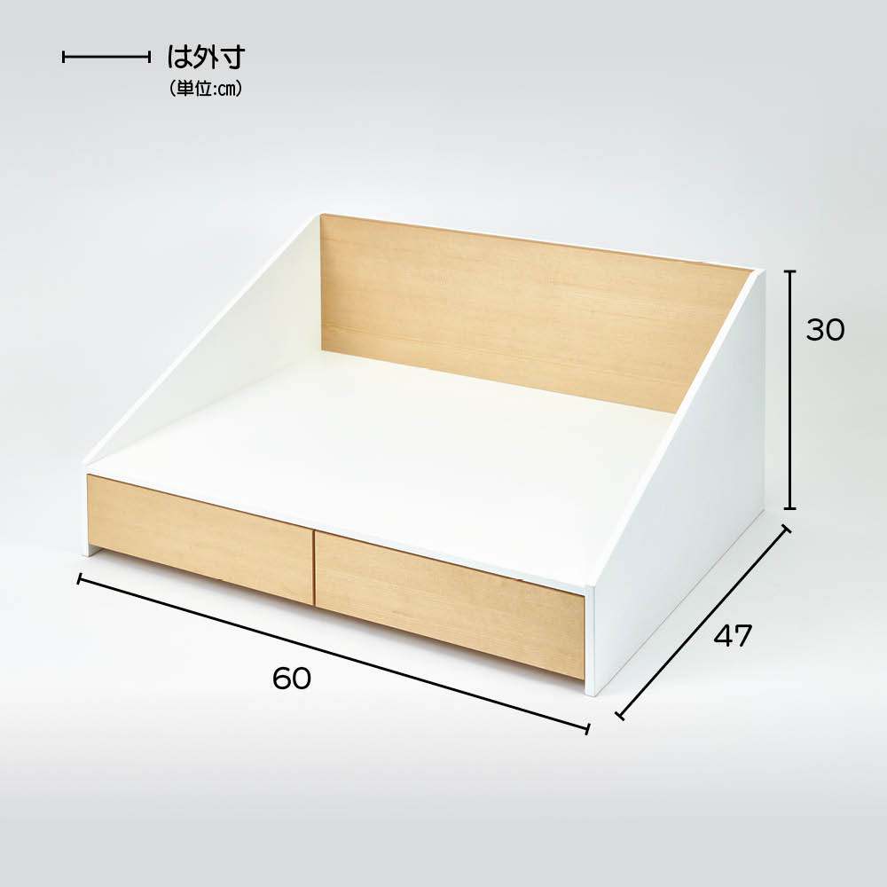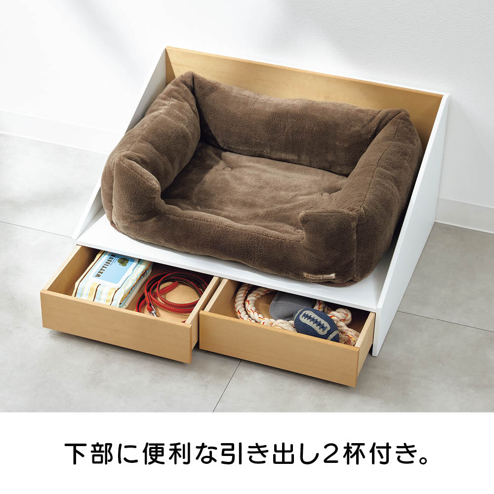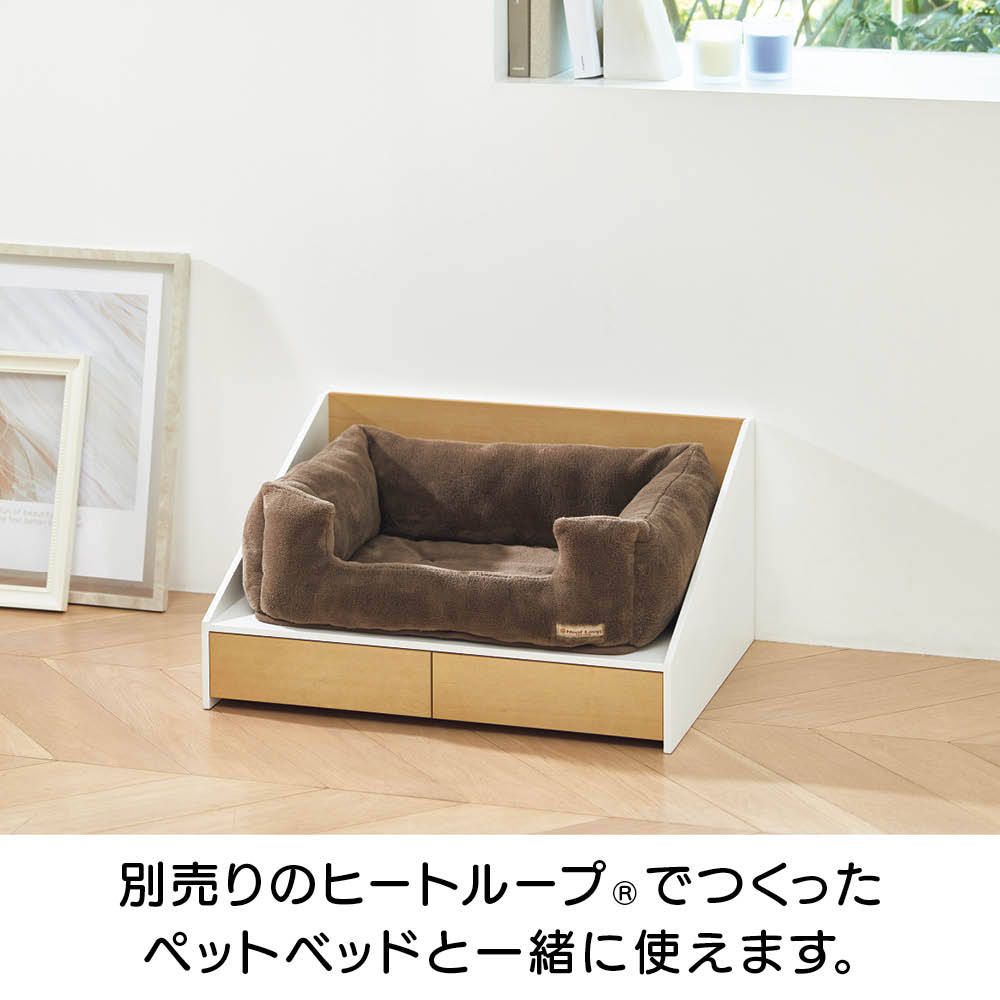 別売りのヒートループ(R)でつくったペットベッドをセットして使える、ペットベッドフレーム。少し高い位置にペットベットを置くことで、間違って愛犬や愛猫を蹴飛ばしたり、踏んだりする危険性が減少。奥側と左右のボードもしっかりガードしてくれます。少し高い位置にペットベットを置くことで、間違って愛犬や愛猫を蹴飛ばしたり、踏んだりする危険性が減少。奥側と左右のボードもしっかりガードしてくれます。内寸約幅26.5×奥行44×深さ6cmの引き出し2杯付き。引き出しの中には、ワンちゃんの首輪やリード、おもちゃなどが収納できます。