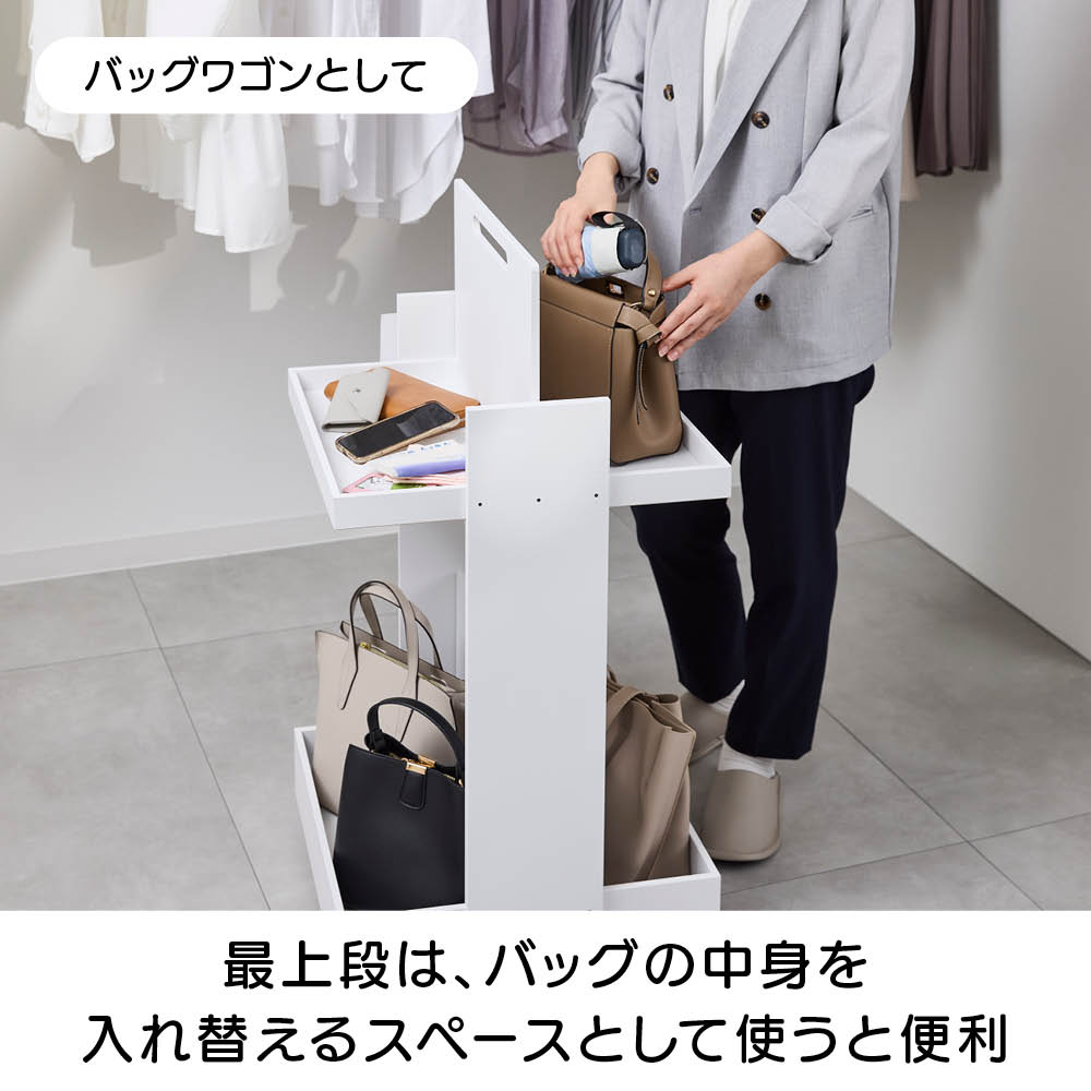 頻繁に出し入れするものを、使わないときは見映えよく飾っておきたい…そんな願いを叶えるワゴンです。バッグなどのファッション小物の収納や趣味のディスプレイワゴンとして大活躍します。取り出しやすく、戻しやすいから、身支度をもっと時短に、見せる収納をもっと楽しく!隠しキャスター付きで来客時は目に触れないよう簡単に移動できます。収納物を並べて見やすくディスプレイできるオープンワゴンです。置きたいものに合わせて2段・3段から選べます。ウォークインクローゼットでバッグワゴンとして、リビングでぬいぐるみワゴンとして。また推しのグッズを集めて推し活ワゴンとしてもおすすめです。選びやすく、取り出しやすい「バッグ見える化計画」のススメ大きさや形がバラバラなバッグは、すっきり収納するのが難しいもの。このワゴンがあれば、ビジネストートやリュック、ハンドバッグやクラッチバッグまで、大きさごとに分けて取り出しやすく収納できます。しまい込むと使わなくなるバッグも、常に見えていればフル活用できます。隠しキャスターで移動もラクラク普段はウォークインクローゼット内に入れておくのもおすすめ。鏡の前で服に合わせてコーディネートを考えるときや掃除のときは動かせて便利です。最上段は、バッグの中身を入れ替えるスペースとして使うと便利おすすめの使い方は、最上段の片側をバッグの中身を出す場所としてフリーにしておくこと。帰宅したら一旦そこへ中身を全て出しておき、翌日使うバッグを決めたらそこで出してあった中身を入れていけば、忘れ物もなく身支度もスムーズです。まるでお店のディスプレイみたい。コレクション棚にもぴったり「ぬいぐるみが大好きで、縁を感じるたびに連れて帰ってしまうのに、棚や箱にしまったままで目に付くところに飾れていない」そんなあなた、せっかくのお気に入りをしまっておいてはもったいない!ぜひ見えるように飾りながら収納しましょう。推し活グッズを飾るオープンスペースとしても大活躍写真集、フォトパネル、うちわ、ペンライト、CD/DVD、ぬい、アクスタ、キーホルダーなど形が様々なアイテムを飾りながら収納できます。キャスター付きだから、来客時には見えないところへ移動させるのも簡単です。最下段のみ耐荷重5kgなので、写真集なども収納できます(その他は耐荷重2kg)最上段にはアクスタ、キーリング、フォトスタンドなど、2段目にはぬいやペンライト、CD/DVD、ブルーレイなど、3段目には写真集やうちわ、フォトパネルなど大きなものをディスプレイできます。飾るエリアごとに推しメンバーやコンセプトを変えてディスプレイするのも楽しい!