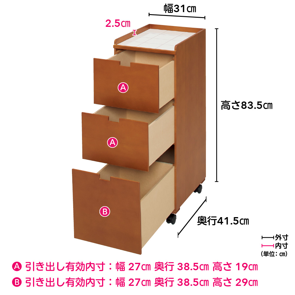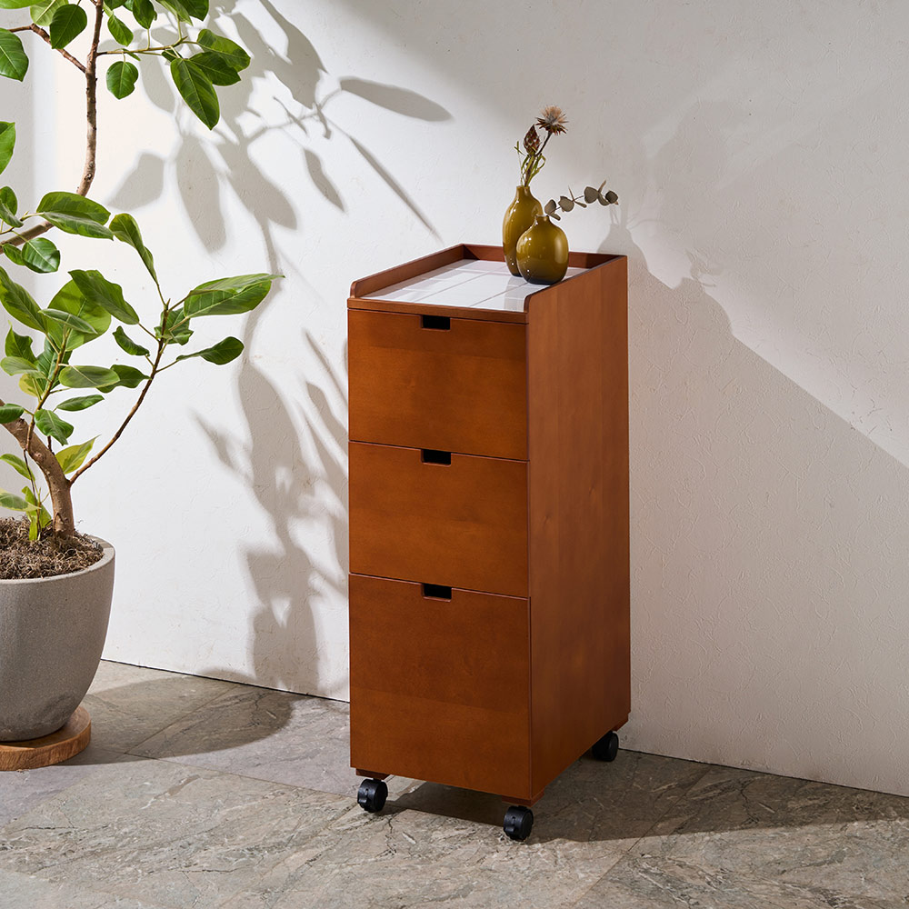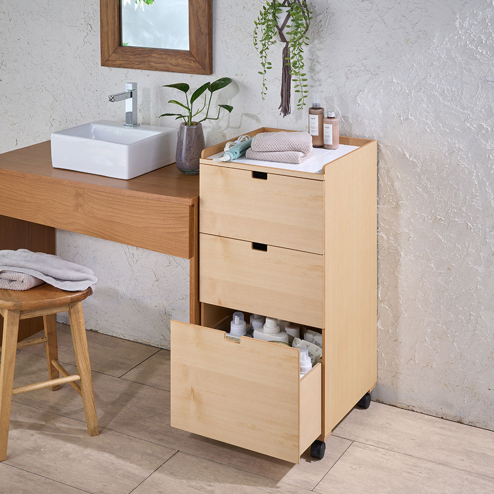 清潔感のある白タイルトップが爽やかな、洗面台の横やランドリールームのすき間に収まる幅31cmのチェストです。陶器の白タイルは汚れてもさっと拭けばきれいに。熱にも強く、ヘアアイロンなどを置いても安心です。キャスター付きなので簡単に移動できて、お掃除もラクラク。白のタイルトップとやさしい木の風合いがインテリアになじむ、すき間チェスト (イ)チーク天板に陶器タイル、本体には緻密で美しい木肌をもつ天然木(スプルス材)の突板を使用したナチュラルな表情が魅力。洗面所に、やさしい雰囲気が生まれます。洗面所やランドリールームのすき間を、無駄なく有効活用(ア)ナチュラル ※写真は別売りの幅21cmタイプですこの一台で、洗面台や洗濯機の脇、ドア横などの狭いすき間も、収納として有効活用できます。清潔感のあるタイルトップは水回りにぴったり(ア)ナチュラル ※写真は別売りの幅41cmタイプですスキンケア用品やブラシ、湿ったタオルなどを天板にちょい置きしたいときも、水に強いタイルトップなら安心。天板は3方の周囲を約2.5cm高くした設計で、置いた物が落ちにくくなっています。化粧品などをこぼしても、さっと拭き取れて清潔乳液やパウダーなどがこぼれても、簡単に拭き取れるからいつも清潔。毎日気持ちよく使えます。3段の引き出しに、洗面所の必需品をたっぷり収納できます(ア)ナチュラル ※写真は別売りの幅41cmタイプです上段と中段は引き出し深さ約19cmで、綿棒など細かい物や化粧小物、タオルなどを入れておくのにぴったり。最下段は深さが29cmあり、背の高いスプレーや詰め替えストックなどの収納に便利です。キャスター付きで移動やお掃除も簡単(イ)チークさっと動かせてお掃除ラクラク。メイク中などには、手元に引き寄せて小物置き場に使うこともできて便利。リビングルームや寝室など、いろいろな場所で活躍 (イ)チーク木目を生かしたぬくもりあるデザインだから、使う場所を選びません。角に丸みをつけるなど、人にやさしい丁寧な仕上げは日本製だからこそ左:(ア)ナチュラル 右: (イ)チーク明るいナチュラルと落ち着いたチークの2カラー。表面はラッカー塗装のなめらかな仕上げで、手前側は角を丸くした気配り仕様。手にやさしく、お子さまにも安心です。ちょっとしたすき間に、使い勝手のよい幅31cm (イ)チーク同シリーズは幅21cm・幅31cm・幅41cmの計3タイプをご用意。スペースに合わせてお選びいただけます。すき間のほか、サイズ違いなど複数並べて使ってもおしゃれです。爽やかな洗面所で、気持ちいい一日のスタートを新しい1日のはじまりに、自分をリセットする洗面所。身だしなみと気持ちを整えるのは、明るく清潔な場所であってほしいもの。こんなチェストのある爽やかな空間で気分よくスタートできたら、きっといい日になります。