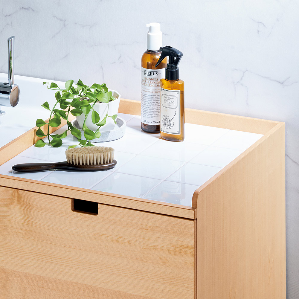 天板にはホワイトの陶器タイルを使用。こぼれた化粧品などもさっとひと拭き。