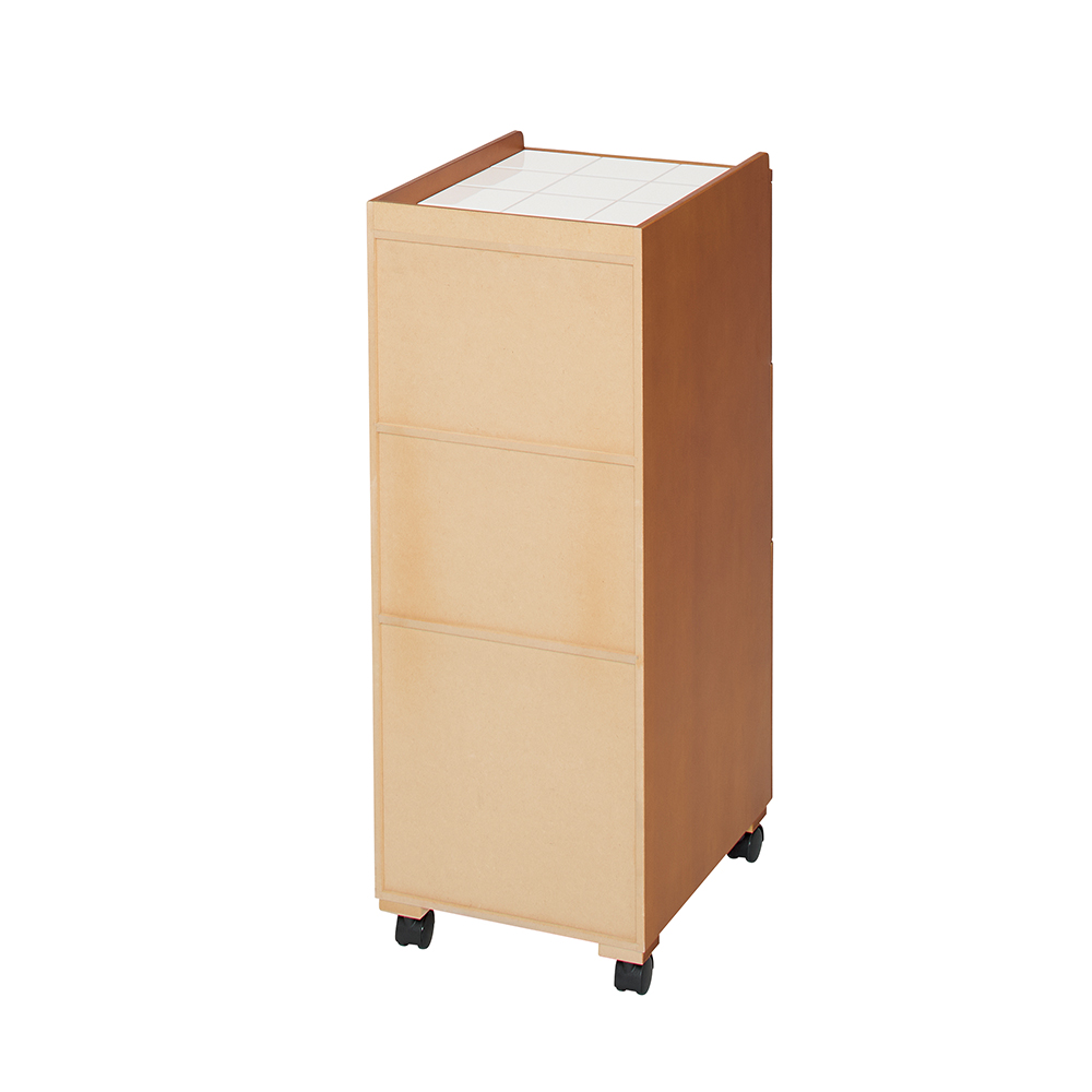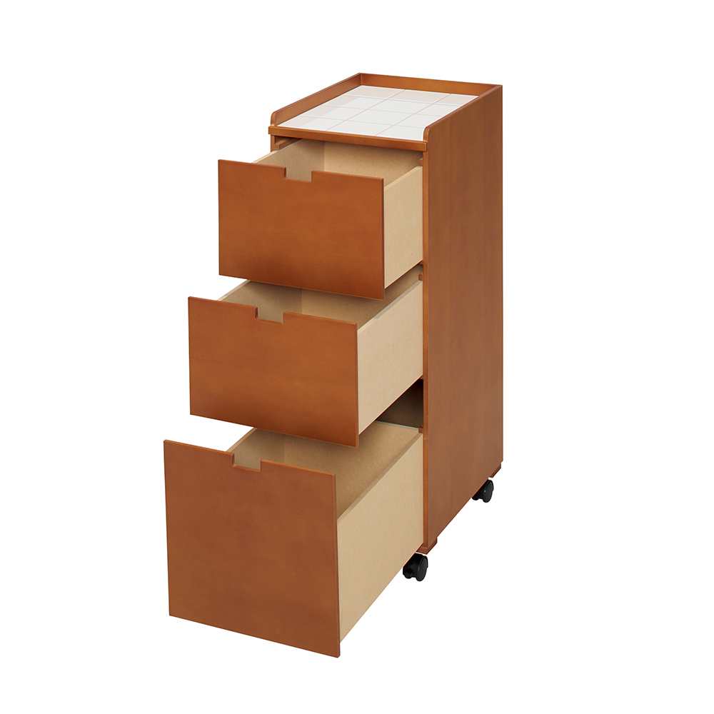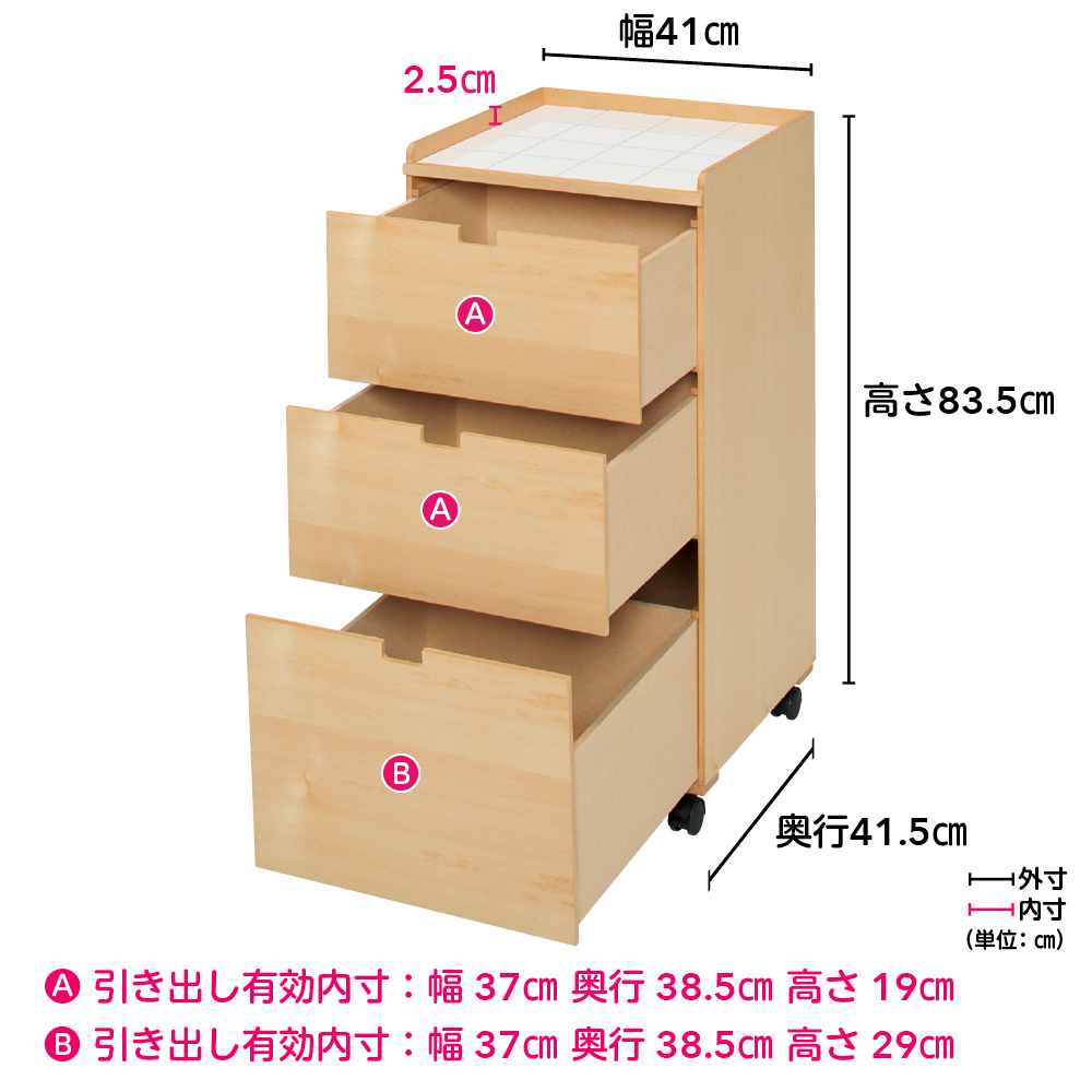 清潔感のある白タイルトップが爽やかな、洗面所の横やランドリールームのすき間に収まる便利なチェストです。陶器の白タイルは汚れてもさっと拭けばきれいに。熱にも強く、ヘアアイロンなどを置いても安心です。幅41cmタイプは収納力もたっぷり。キャスター付きなので簡単に移動でき、お掃除もラクラクです。白のタイルトップとやさしい木の風合いがインテリアになじむ、すき間チェスト(ア)ナチュラル天板に陶器タイル、本体には緻密で美しい木肌をもつ天然木(スプルス材)の突板を使用したナチュラルな表情が魅力。洗面所に、やさしい雰囲気が生まれます。洗面所やランドリールームのすき間を、無駄なく有効活用(ア)ナチュラル ※写真は別売りの幅21cmタイプですこの一台で、洗面台や洗濯機の脇、ドア横などの狭いすき間も、収納として有効活用できます。清潔感のあるタイルトップは水回りにぴったり(ア)ナチュラルスキンケア用品やブラシ、湿ったタオルなどを天板にちょい置きしたいときも、水に強いタイルトップなら安心。天板は3方の周囲を約2.5cm高くした設計で、置いた物が落ちにくくなっています。化粧品などをこぼしても、さっと拭き取れて清潔乳液やパウダーなどがこぼれても、簡単に拭き取れるからいつも清潔。毎日気持ちよく使えます。3段の引き出しに、洗面所の必需品をたっぷり収納できます(ア)ナチュラル上段と中段は引き出し深さ約19cmで、綿棒など細かい物や化粧小物、タオルなどを入れておくのにぴったり。最下段は深さが29cmあり、背の高いスプレーや詰め替えストックなどの収納に便利です。キャスター付きで移動やお掃除も簡単(イ)チーク ※写真は別売りの幅31cmタイプですさっと動かせてお掃除ラクラク。メイク中などには、手元に引き寄せて小物置き場に使うこともできて便利。リビングルームや寝室など、いろいろな場所で活躍(イ)チーク ※写真は別売りの幅31cmタイプです木目を生かしたぬくもりあるデザインだから、使う場所を選びません。角に丸みをつけるなど、人にやさしい丁寧な仕上げは日本製だからこぞ左:(ア)ナチュラル 右: (イ)チーク明るいナチュラルと落ち着いたチークの2カラー。表面はラッカー塗装のなめらかな仕上げで、手前側は角を丸くした気配り仕様。手にやさしく、お子さまにも安心です。収納力たっぷり、大きめの物も入れやすい幅41cm(ア)ナチュラル同シリーズは幅21cm・幅31cm・幅41cmの計3タイプをご用意。スペースに合わせてお選びいただけます。すき間のほか、サイズ違いなど複数並べて使ってもおしゃれです。爽やかな洗面所で、気持ちいい一日のスタートを新しい1日のはじまりに、自分をリセットする洗面所。身だしなみと気持ちを整えるのは、明るく清潔な場所であってほしいもの。こんなチェストのある爽やかな空間で気分よくスタートできたら、きっといい日になります。