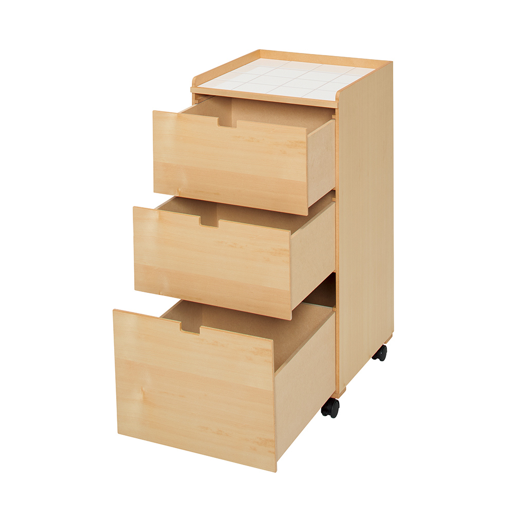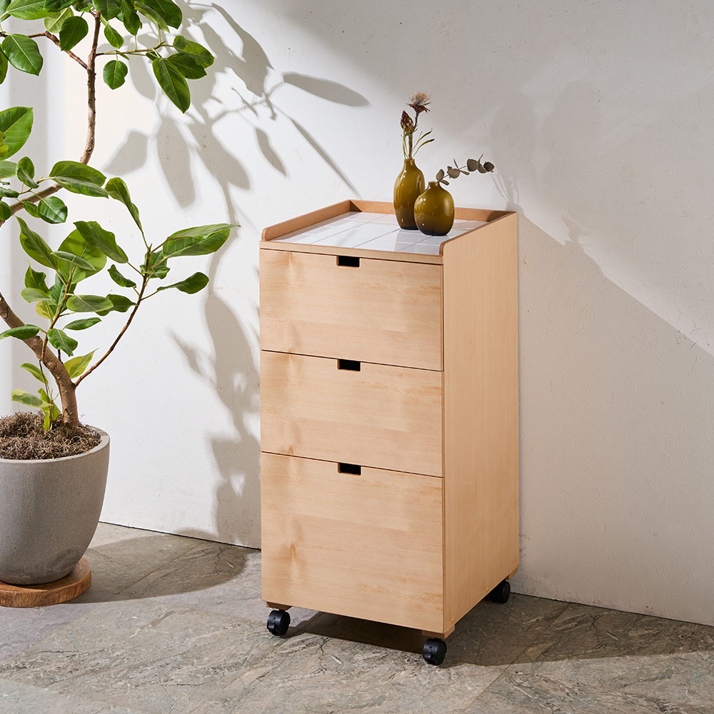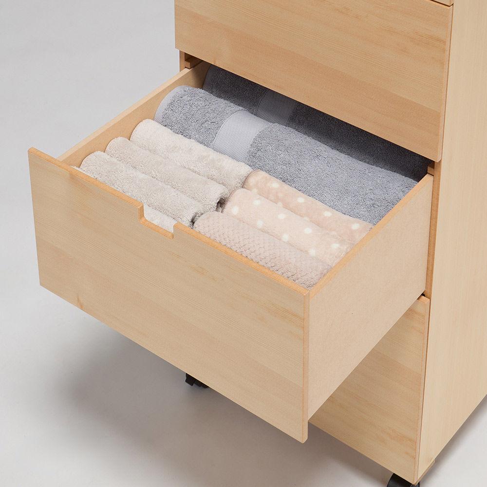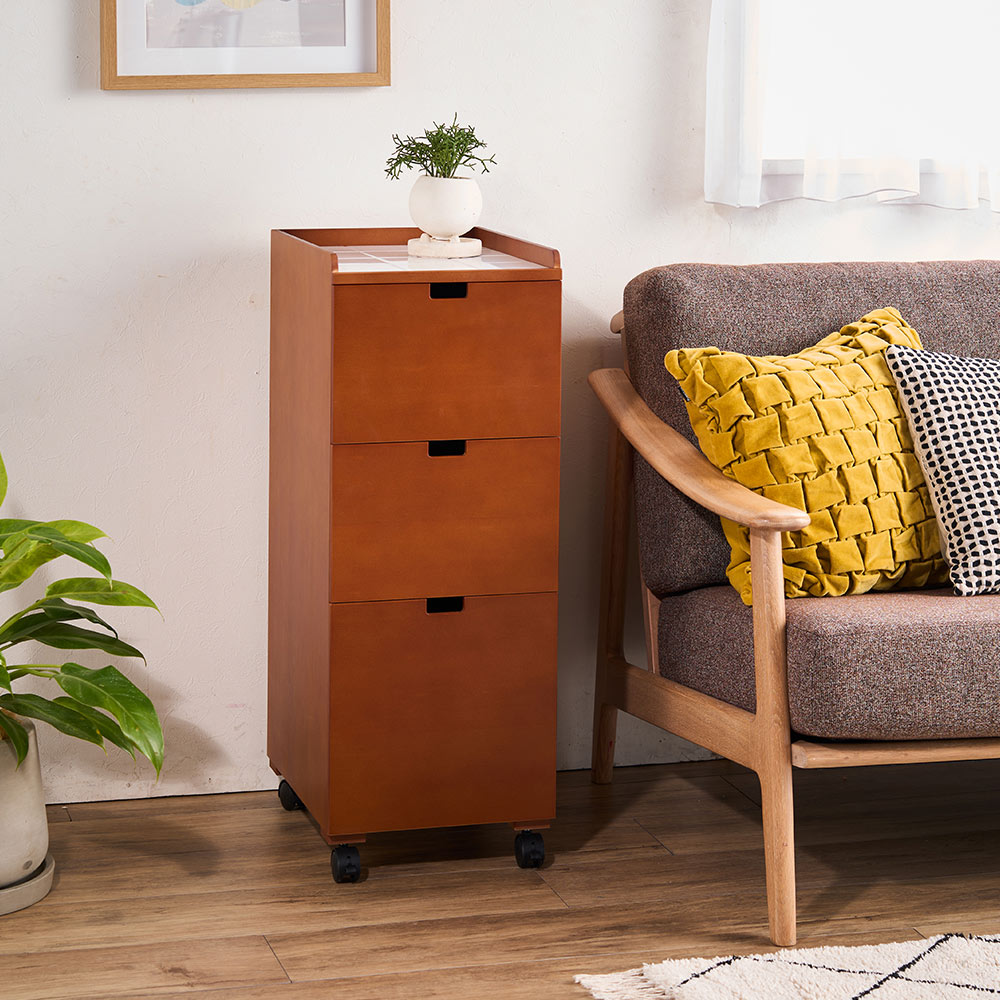 清潔感のある白タイルトップが爽やかな、洗面所の横やランドリールームのすき間に収まる便利なチェストです。陶器の白タイルは汚れてもさっと拭けばきれいに。熱にも強く、ヘアアイロンなどを置いても安心です。幅41cmタイプは収納力もたっぷり。キャスター付きなので簡単に移動でき、お掃除もラクラクです。白のタイルトップとやさしい木の風合いがインテリアになじむ、すき間チェスト(ア)ナチュラル天板に陶器タイル、本体には緻密で美しい木肌をもつ天然木(スプルス材)の突板を使用したナチュラルな表情が魅力。洗面所に、やさしい雰囲気が生まれます。洗面所やランドリールームのすき間を、無駄なく有効活用(ア)ナチュラル ※写真は別売りの幅21cmタイプですこの一台で、洗面台や洗濯機の脇、ドア横などの狭いすき間も、収納として有効活用できます。清潔感のあるタイルトップは水回りにぴったり(ア)ナチュラルスキンケア用品やブラシ、湿ったタオルなどを天板にちょい置きしたいときも、水に強いタイルトップなら安心。天板は3方の周囲を約2.5cm高くした設計で、置いた物が落ちにくくなっています。化粧品などをこぼしても、さっと拭き取れて清潔乳液やパウダーなどがこぼれても、簡単に拭き取れるからいつも清潔。毎日気持ちよく使えます。3段の引き出しに、洗面所の必需品をたっぷり収納できます(ア)ナチュラル上段と中段は引き出し深さ約19cmで、綿棒など細かい物や化粧小物、タオルなどを入れておくのにぴったり。最下段は深さが29cmあり、背の高いスプレーや詰め替えストックなどの収納に便利です。キャスター付きで移動やお掃除も簡単(イ)チーク ※写真は別売りの幅31cmタイプですさっと動かせてお掃除ラクラク。メイク中などには、手元に引き寄せて小物置き場に使うこともできて便利。リビングルームや寝室など、いろいろな場所で活躍(イ)チーク ※写真は別売りの幅31cmタイプです木目を生かしたぬくもりあるデザインだから、使う場所を選びません。角に丸みをつけるなど、人にやさしい丁寧な仕上げは日本製だからこぞ左:(ア)ナチュラル 右: (イ)チーク明るいナチュラルと落ち着いたチークの2カラー。表面はラッカー塗装のなめらかな仕上げで、手前側は角を丸くした気配り仕様。手にやさしく、お子さまにも安心です。収納力たっぷり、大きめの物も入れやすい幅41cm(ア)ナチュラル同シリーズは幅21cm・幅31cm・幅41cmの計3タイプをご用意。スペースに合わせてお選びいただけます。すき間のほか、サイズ違いなど複数並べて使ってもおしゃれです。爽やかな洗面所で、気持ちいい一日のスタートを新しい1日のはじまりに、自分をリセットする洗面所。身だしなみと気持ちを整えるのは、明るく清潔な場所であってほしいもの。こんなチェストのある爽やかな空間で気分よくスタートできたら、きっといい日になります。