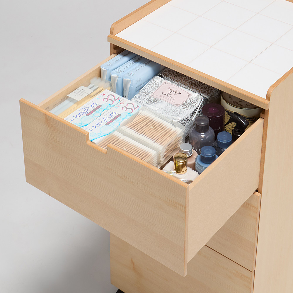 (ア)ナチュラル タイル使いがアクセントのすき間収納チェスト。洗面所周りを明るく楽しい空間に。