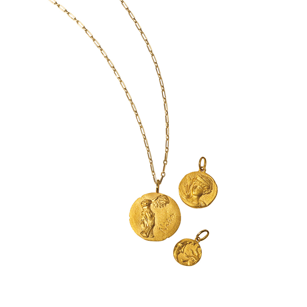 装いに旬を吹き込むジュエリー・トレンド洗練されたムードのカギとなる旬のジュエリーと、洒落て見えるアレンジ法で装いをアップデート。伝説のモチーフを描いた黄金のコインをいつも胸に変わらない価値を持つ、純金コインのペンダントヘッド。職人が手作業で施したアンティーク調のマット仕上げがお洒落。勝利の女神、サモトラケのニケと竪琴は人気の図柄。