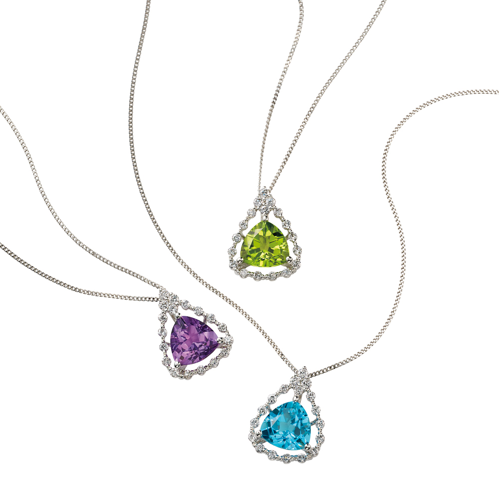 私らしさを色石に託して色のパワーと地球のエナジーを抱くカラーストーンには、気持ちに効く「気」が宿っています。「なりたい自分」を色石に映して、お洒落を楽しんでみませんか?厳選した上質な色石を用い洗練されたデザインの新ブランド「ルミナラ」から、発色の美しい3種の色石をレアなトリリアントカットで。ダイヤの煌めきと艶やかに響きあうペンダント。