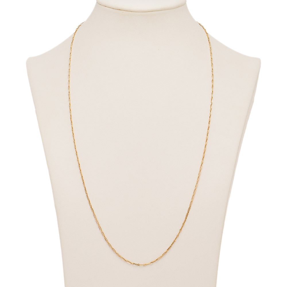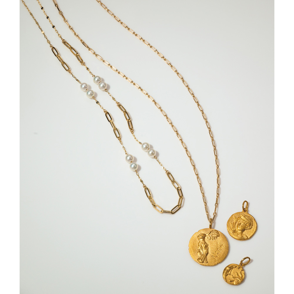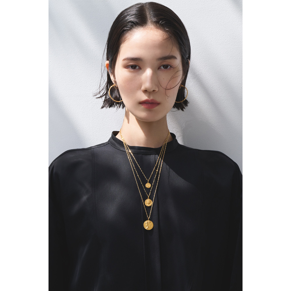 装いに旬を吹き込むジュエリー・トレンド洗練されたムードのカギとなる旬のジュエリーと、洒落て見えるアレンジ法で装いをアップデート。コインに似合う、細長のクリップがシャープなスタイリッシュチェーン。45cmと60cmの2種。