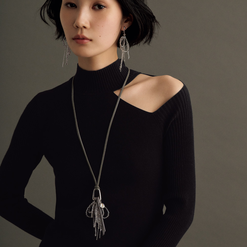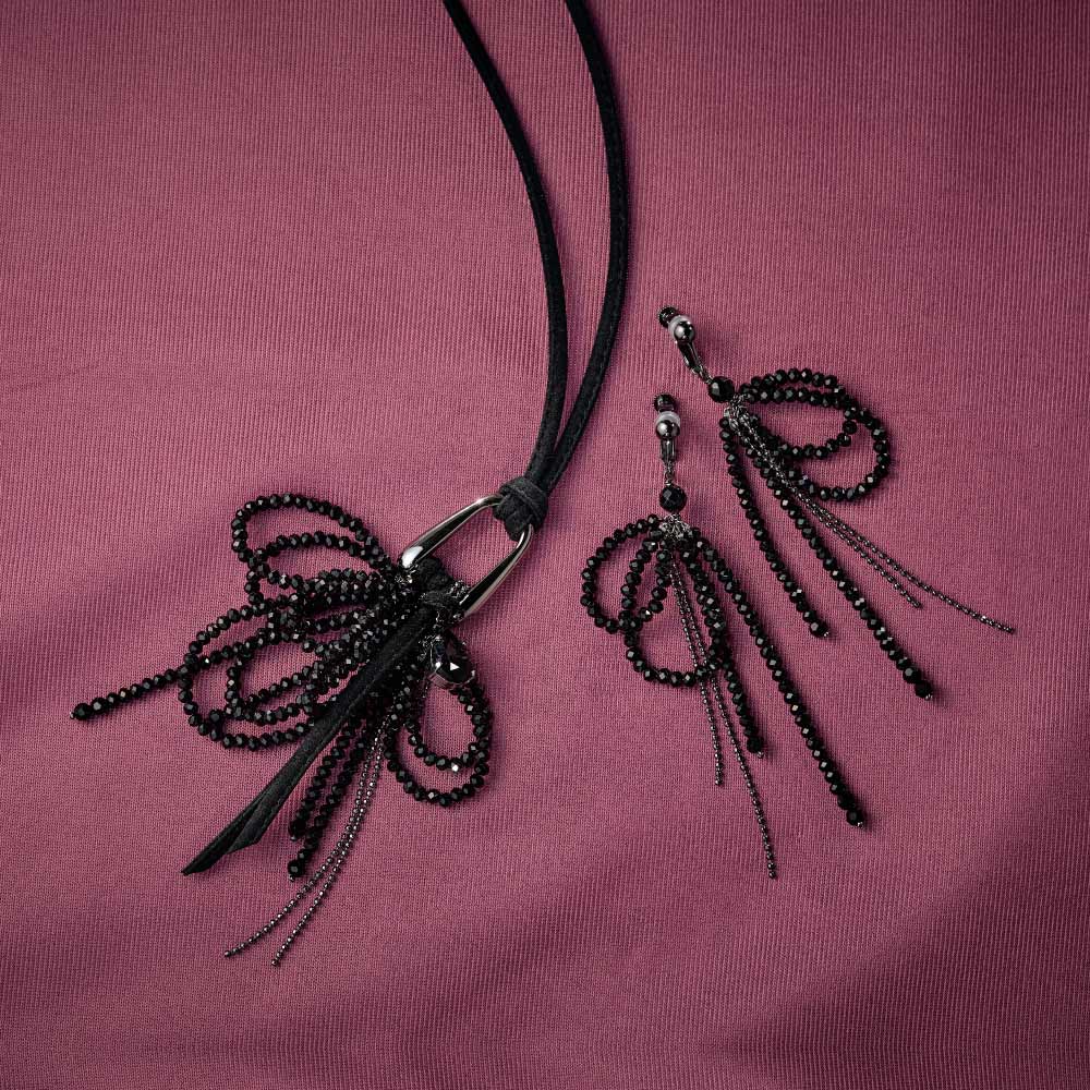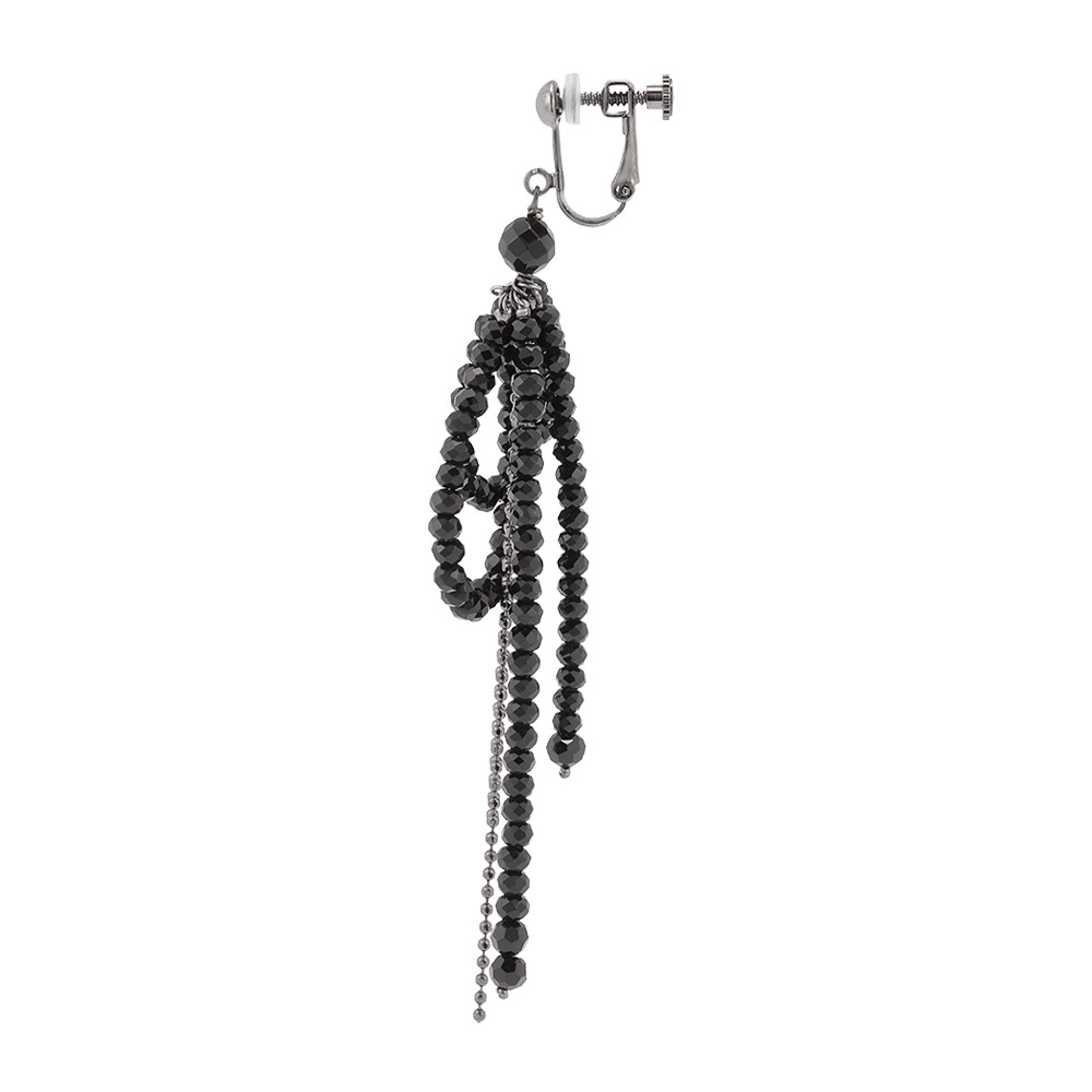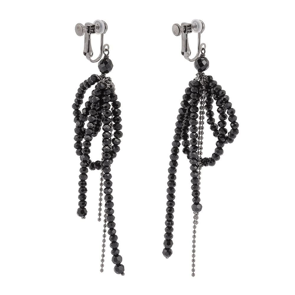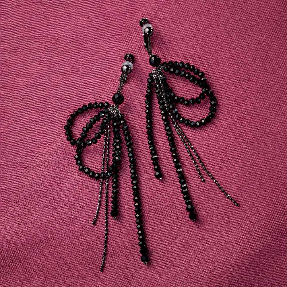光の滝のようにガラスビーズやメタルが表情豊かに揺らぎ輝く甘すぎないリボンのイヤリング・ピアス。ガラスビーズとボールチェーンに加え、ブラック系は、オニキスを一部使用。ATELIER METARINA/アトリエ メタリナ神戸のアトリエで一点ずつ心を込めて、手作りするメイド・イン・ジャパンのアクセサリー。オリジナリティが溢れる華やかなデザイン、着け心地の快適さが長く愛される理由。