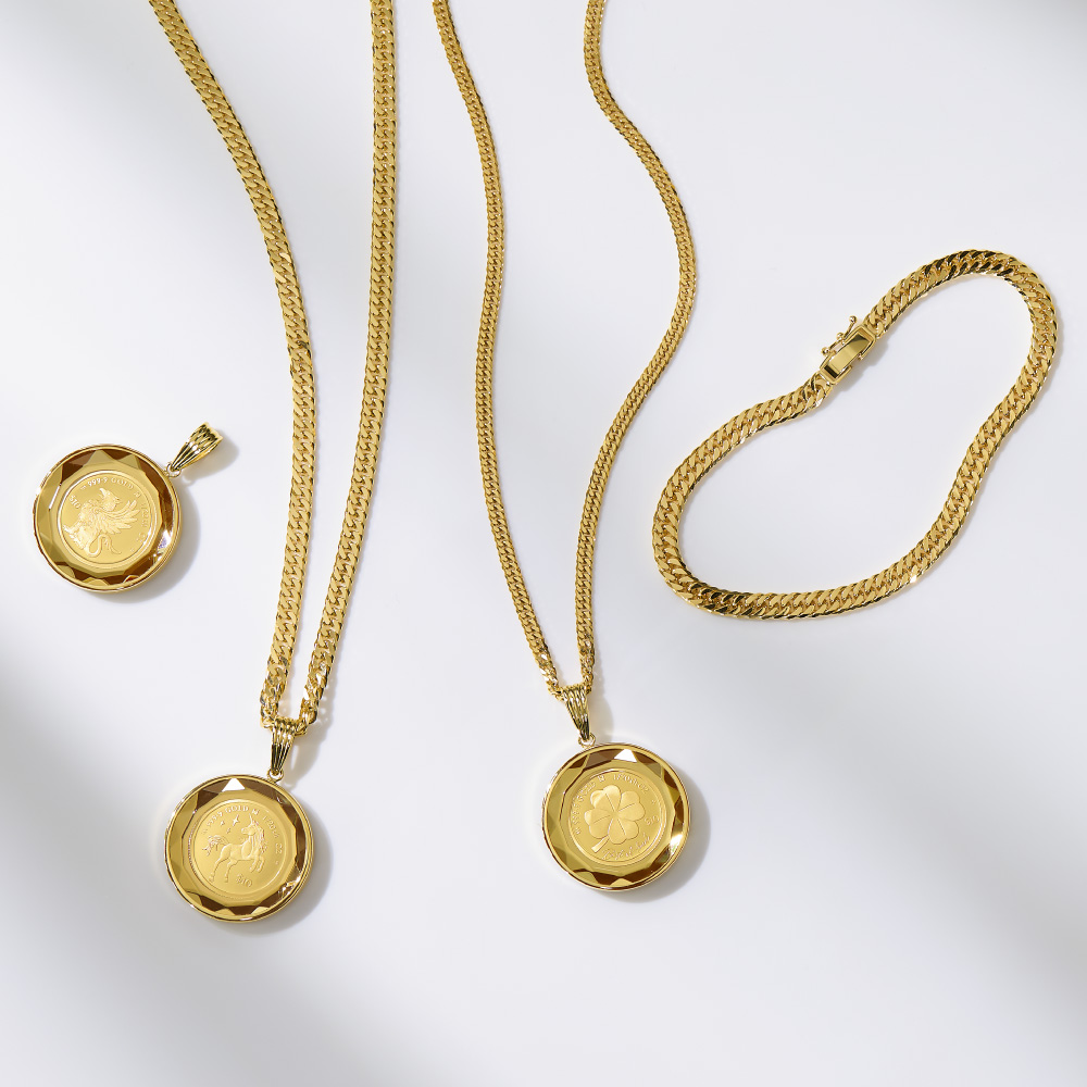 眩い輝きと価値に圧倒されるゴールドを永く愛せるデザインで英国王立造幣局の証明書付き純金コインの2025年モデルをヘッドに。幸運を招くクローバー、愛の象徴ユニコーンの2種。片面はチャールズ3世の肖像です。限定発行の貴重なコインはカットガラスで両面をカバー。傷から守るだけでなく、ひと回り豪奢に輝いて。