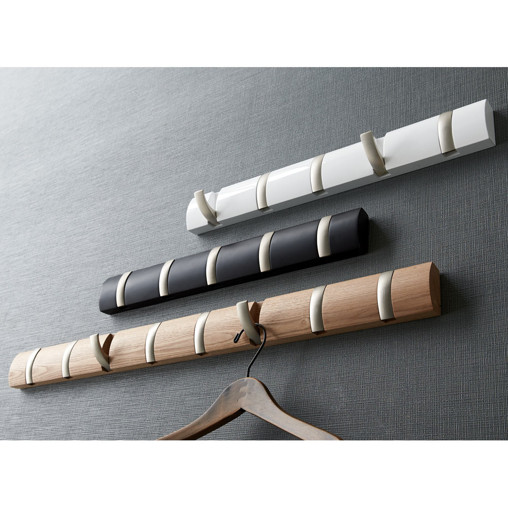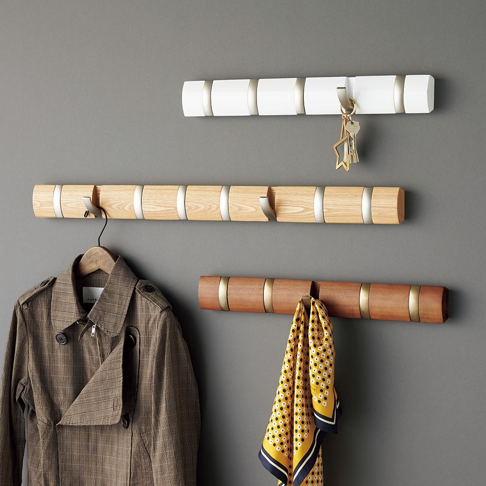 天然木のベースにメタルのフックを合わせたスタイリッシュなデザイン。使う時だけフックを出すので、すっきりとした空間に。ラグジュアリーな表情で、インテリアをクラスアップしてくれます。使う時だけフックを出して使える、天然木のベースにメタルのフックを組み合わせた高級感のある壁掛けハンガー。じゃまにならず見た目もすっきり。販売以来そのすっきりしたデザインと機能性でヒットを続けている、隠れてロングセラー商品です。Umbraumbra(アンブラ)は、1979年カナダのトロントで、レス・マンデルバーム(Les Mandelbaum)とプロダクトデザイナーのポール・ローワン(Paul Rowan)がエキサイティングで美しい家庭用品を世に出したいという思いからスタートさせました。「毎日目にして毎日使うものだから、デザインの美しいものをそろえたい」家の中をおしゃれにしたいお客様は確実に増えています。しかし、デザイナーものを購入しようとすると 価格があまりにも高かったり、機能が伴っていなかったりというのが現状です。Umbraの商品はそんなお客様の声に応えます。インハウスデザイナーと同時に国際的に活躍する デザイナーの機能的作品をお手ごろな価格でお届けいたします。