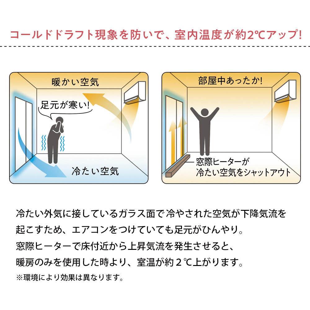 窓から流れ込む冷気をシャットアウトし、お部屋の快適温度を保つ窓際ヒーター。冬の結露を抑え、省エネ対策にも一役。窓際のひんやり。昼間はカーテンは閉めたくないけれど、どうにかしたい。そんな窓際のために専用ヒーターの登場です。寒さが気になる窓際に置いてスイッチを入れるだけ。窓から流れ込む冷気を防ぎ、エアコンと併用することで、お部屋全体を効率よく暖めます。気になる窓辺の結露も抑えて省エネ効果も。大きな窓から小さめの窓まで。いろいろなシーンで使える多サイズ設計です。リビングの履き出し窓から、キッチンやトイレなどの幅の狭い窓まで対応した、うれしい多サイズです。伸縮タイプもあるので、ほとんどの窓にぴったり。窓に沿って置いて電源を入れるだけ。快適な冬が始まります。エアコンをつけても部屋がなかなか暖まらないのは窓からの冷気のせいかも。窓際の床付近から暖かい上昇気流を発生させて冷気を防止。暖房のみ使用時に比べて室内温度がおよそ2度アップ!※ムラの少ない自然な暖かさがお部屋に広がります。※メーカー調べ。環境により効果は異なります。暖房を使う季節、気になるのは結露による窓辺のジメジメとかび。早めの対策を!結露は室内の暖かい空気が外気で冷えた窓にぶつかることで発生します。結露した窓をそのままにしておくとかびの原因にも。窓際用ヒーターを置けば、温度差が縮まって結露の発生が抑制されかび防止にもつながります。消費電力が少なく1日8時間使用でもわずか29.76円※1と省エネ・節約効果も。温度ムラの解消で体感温度が上がるので、エアコンの設定温度を低く保つことができます。暖房器具の補助アイテムにもおすすめです。※1 幅120〜190cm伸縮式使用時。1kw/h=31円で計算。(1kw(1000w)の電力を1時間使った時にかかる電気代)コンセントにつないで窓際に置くだけ。お手入れも簡単。安心の日本製です。本体に付着したホコリや汚れは、掃除機で吸い取るか乾いた布で拭けば取り除けます。運転時の本体表面温度は約65℃なので誤って触れてもやけどの心配はありません。静音設計でおやすみタイムもぐっすりです。